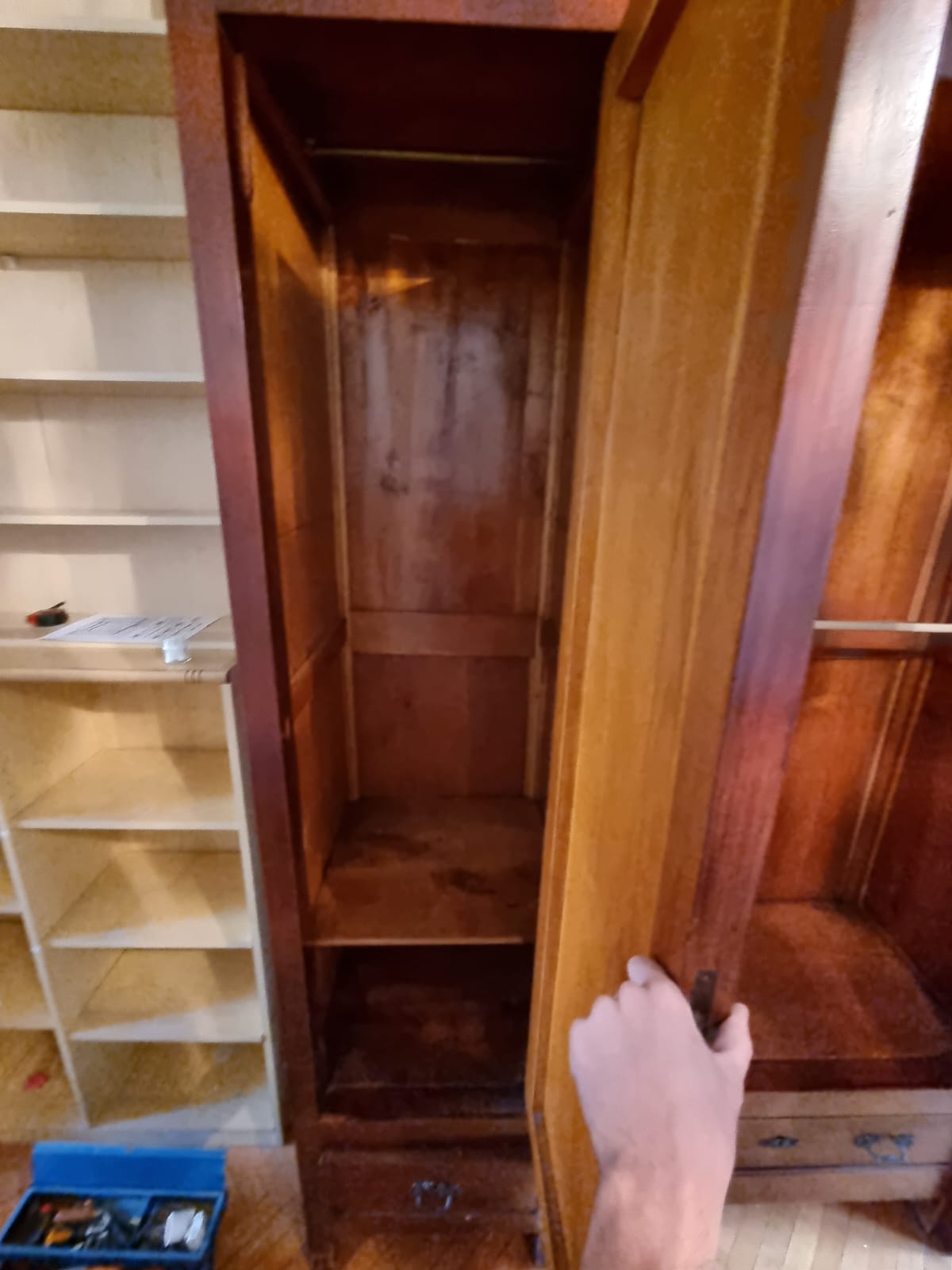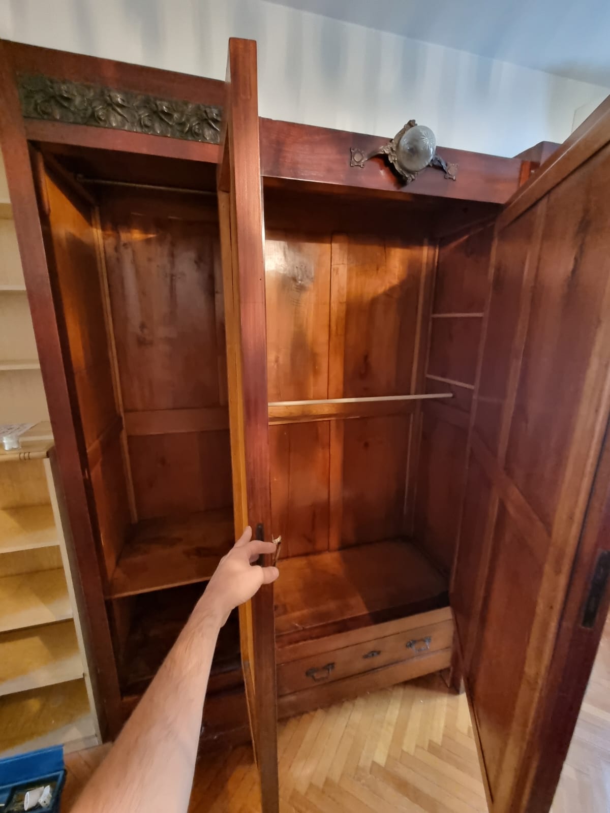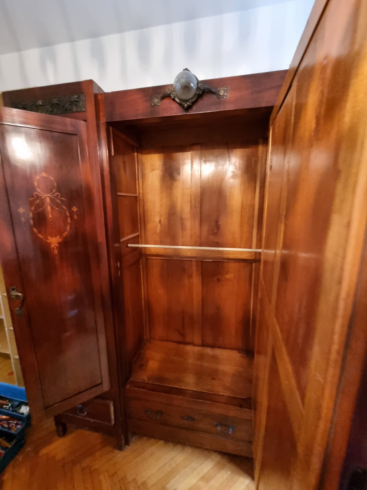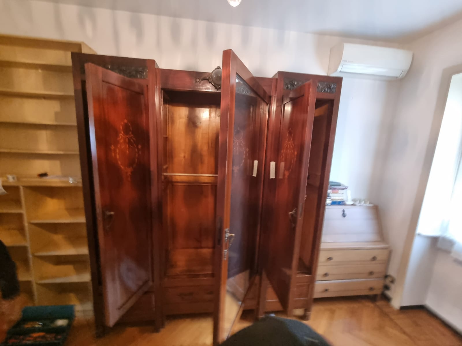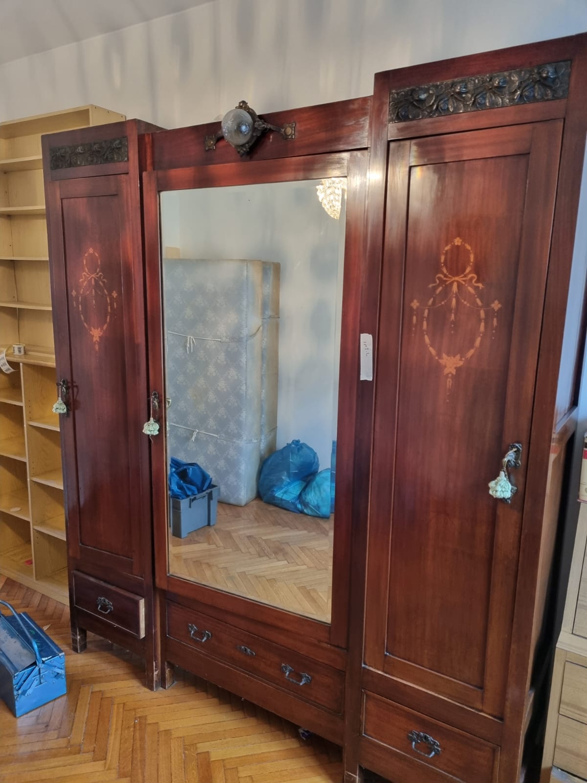 Armadio 3 Ante Liberty dei primi del 900. Struttura in legno intarsiato con inserti in bronzo lavorato. In buone condizioni. Verrà fornito a blocchi.