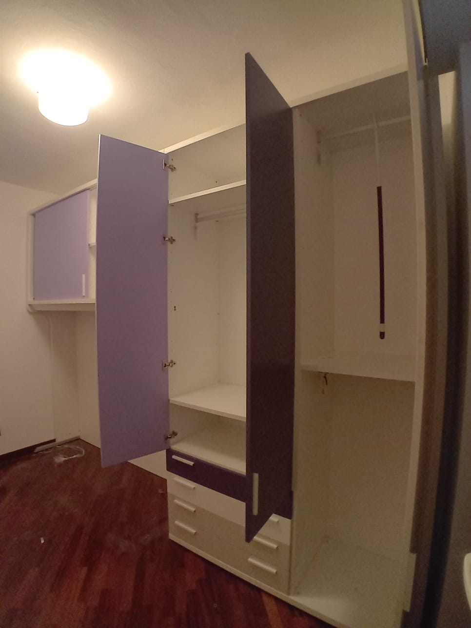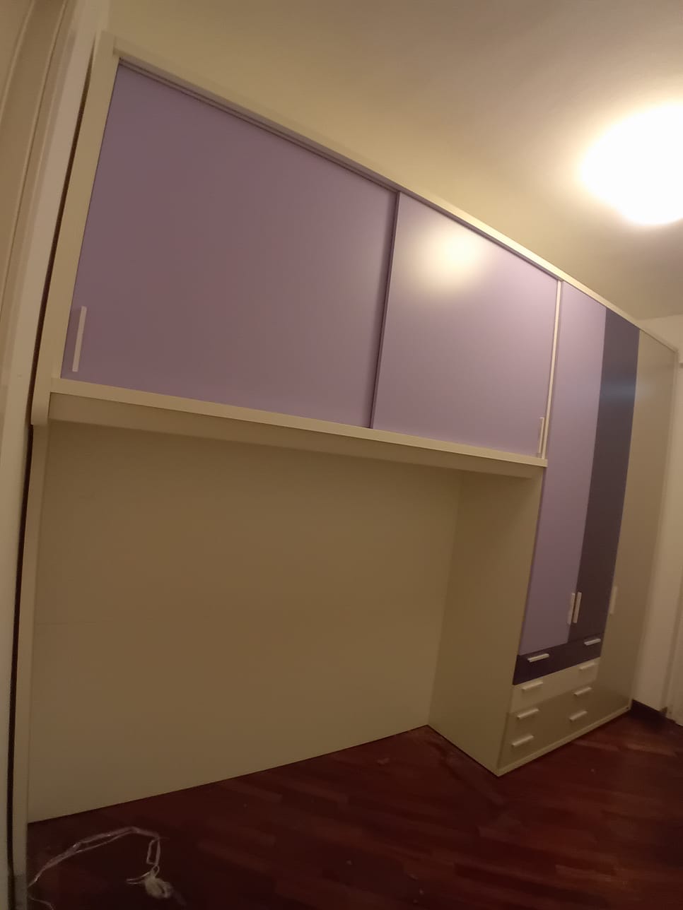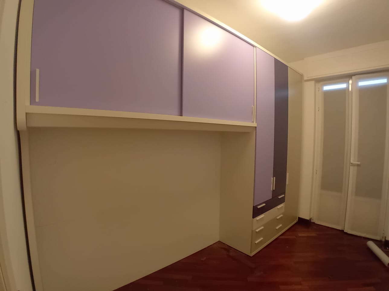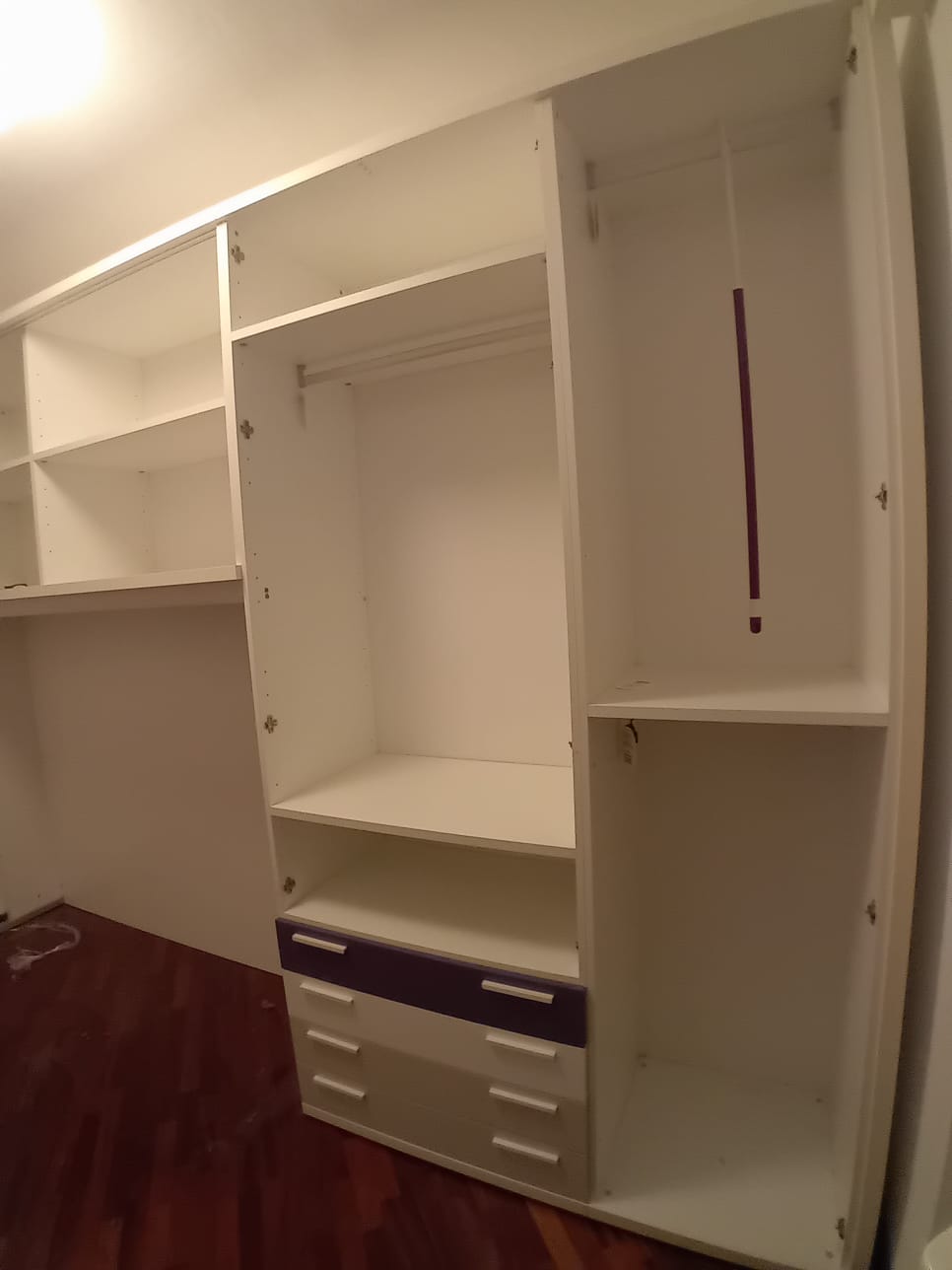 Armadio a ponte moderno. Struttura in truciolare impiallacciato. Comprende modulo con 3 ante e cassetti e pensile con 2 ante scorrevoli. In buone condizioni.