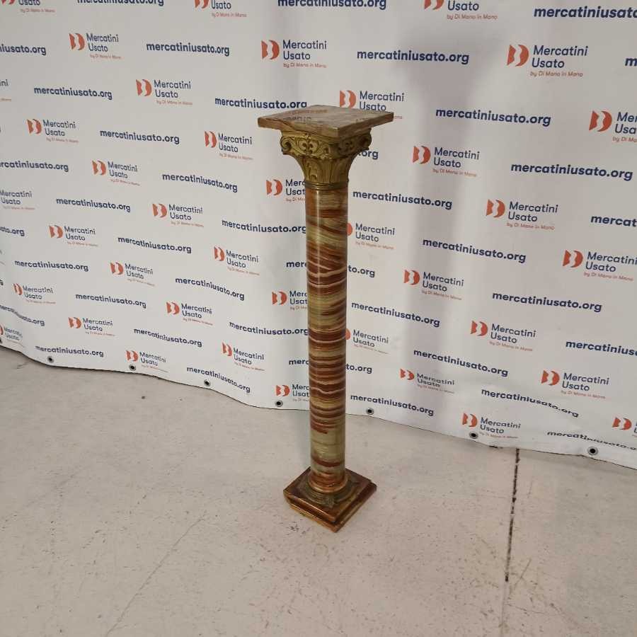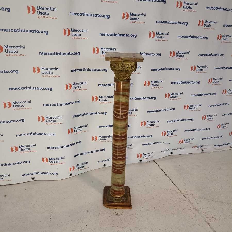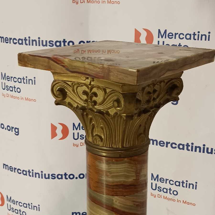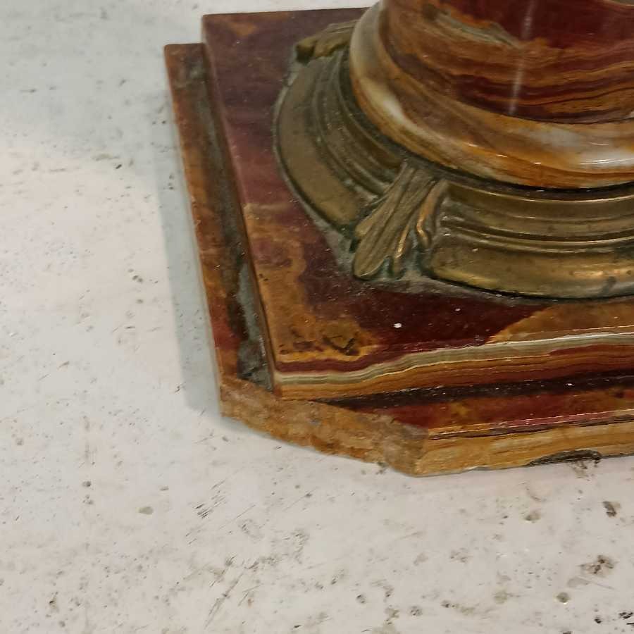 Colonna Portavasi in onice decorata. Struttura in onice con inserti in ottone lavorato. Presenta sbecco alla base.