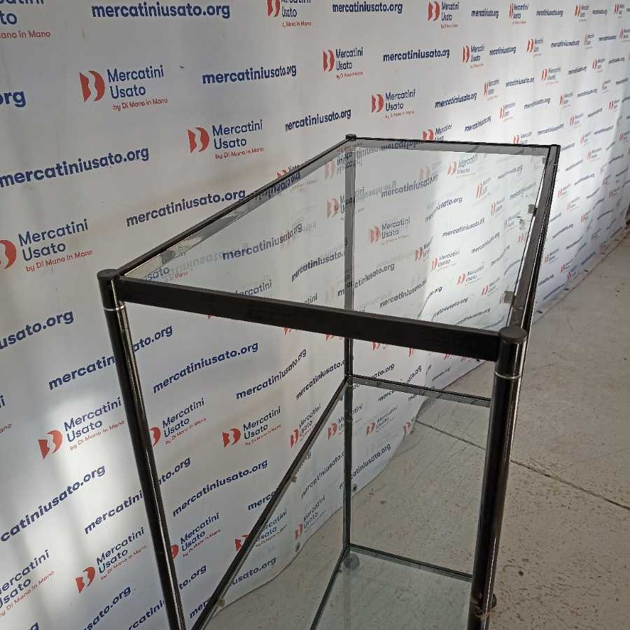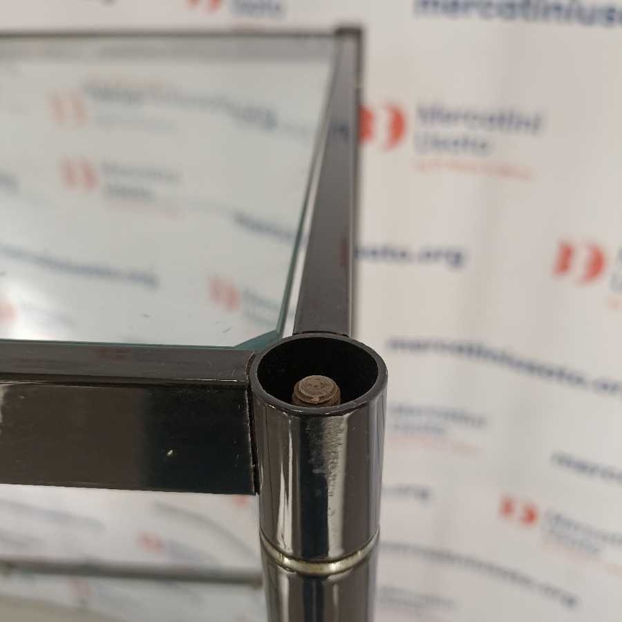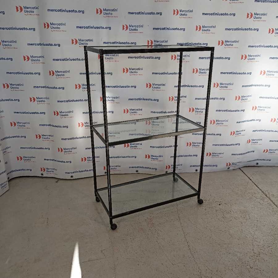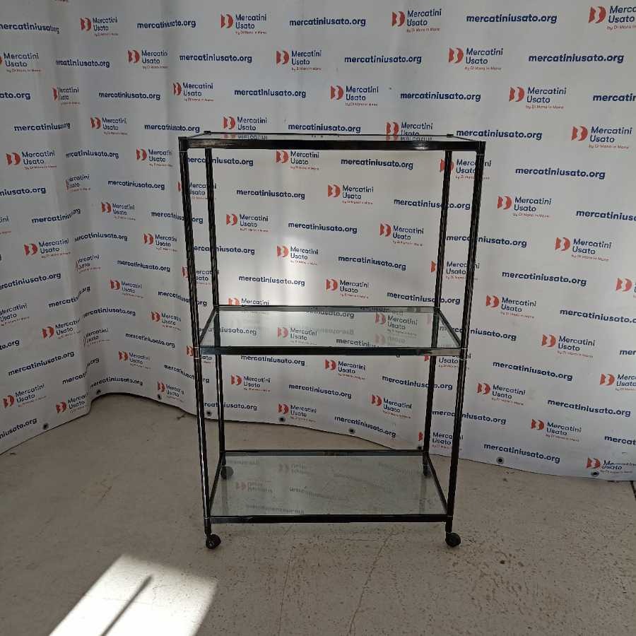 Scaffale su rotelle in vetro. Struttura in ferro laccato nero con 3 ripiani in vetro. In buone condizioni.