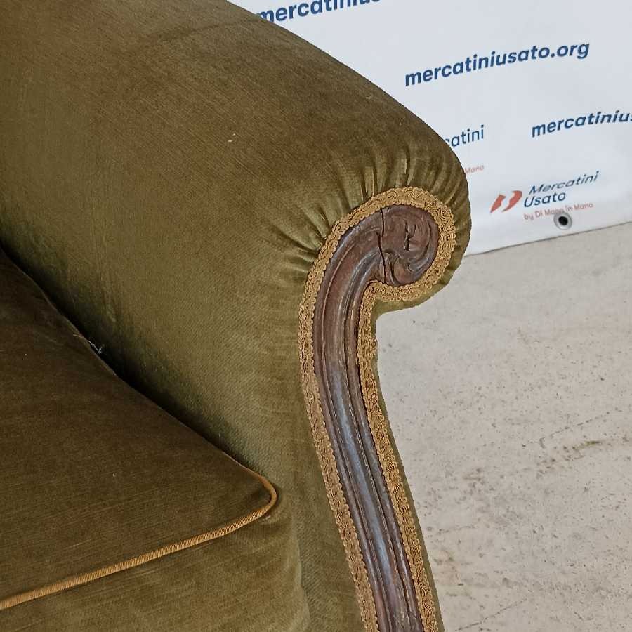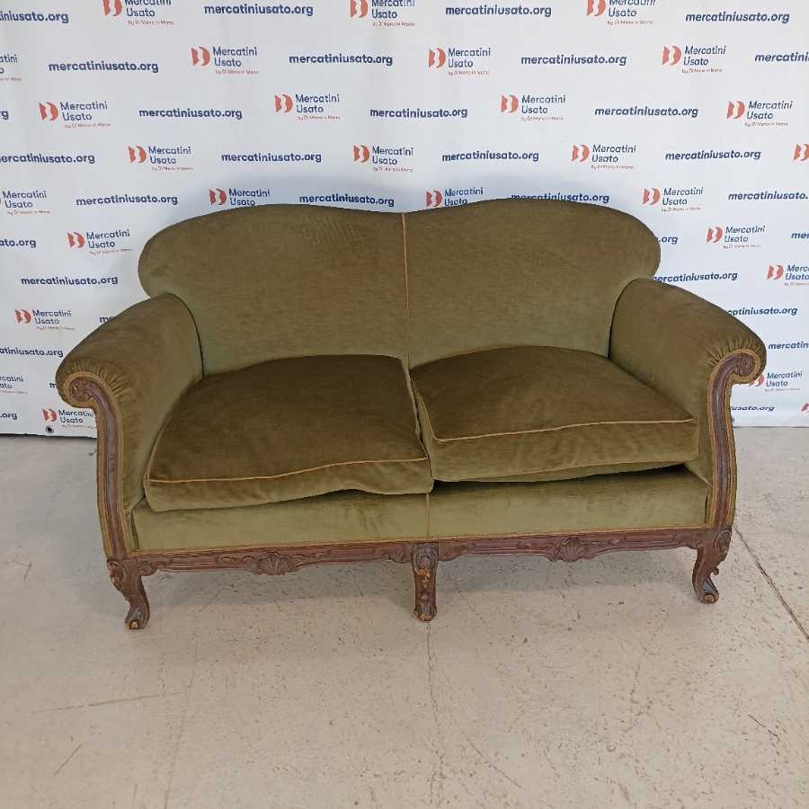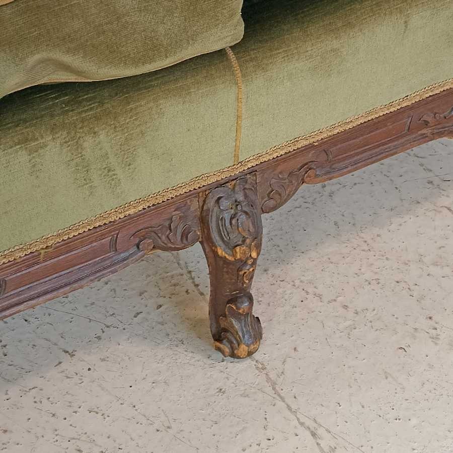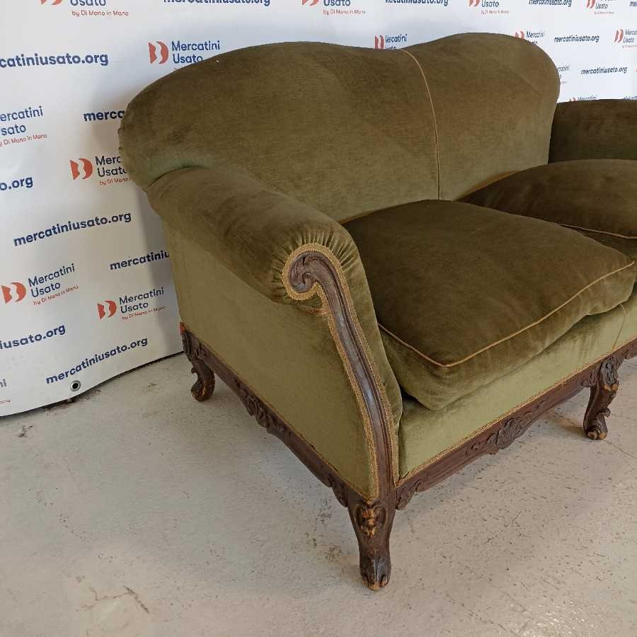 Divanetto in stile Barocco. Struttura in legno intagliato con rivestimento in velluto verde. Richiede piccoli interventi di restauro.