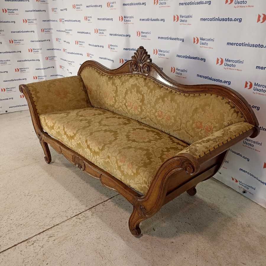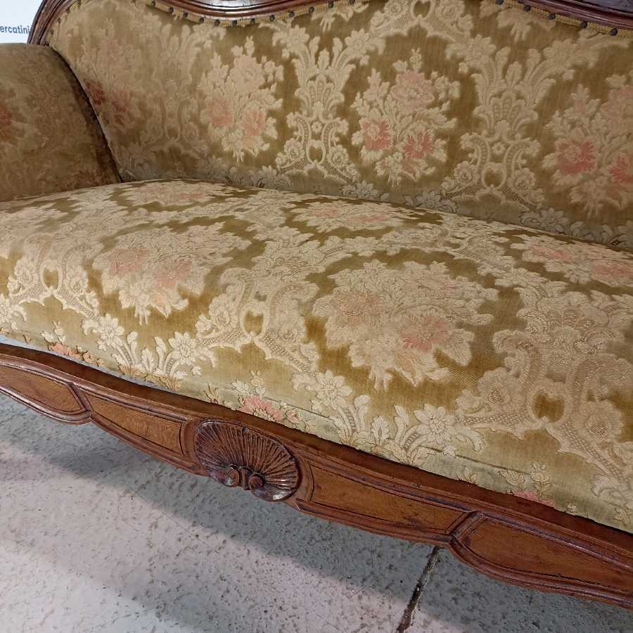 Divanetto in stile primi 900. Struttura in legno intagliato di Noce. Rivestimento in tessuto. In buone condizioni.