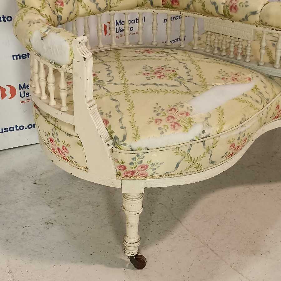 Divanetto Vis a Vis in stile Francese. Struttura in legno intagliato e laccato con rivestimento in tessuto. Richiede interventi di restauro.