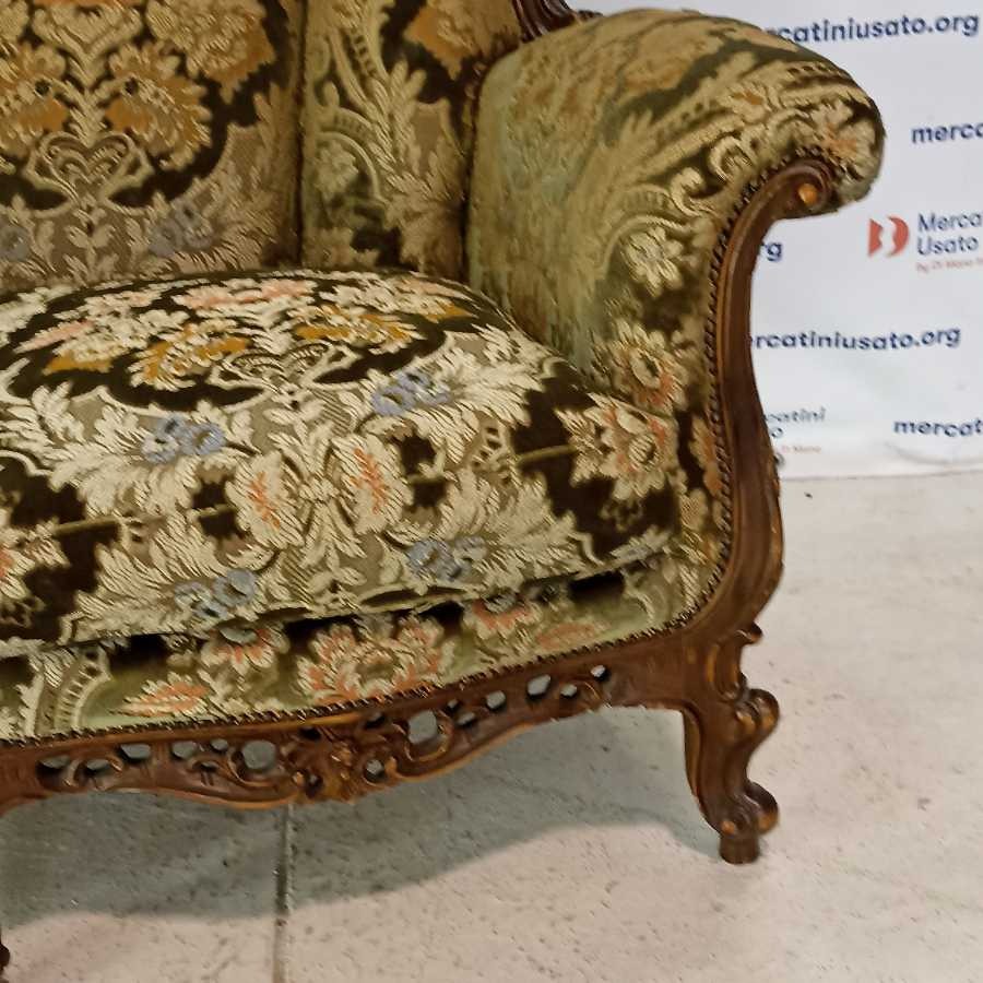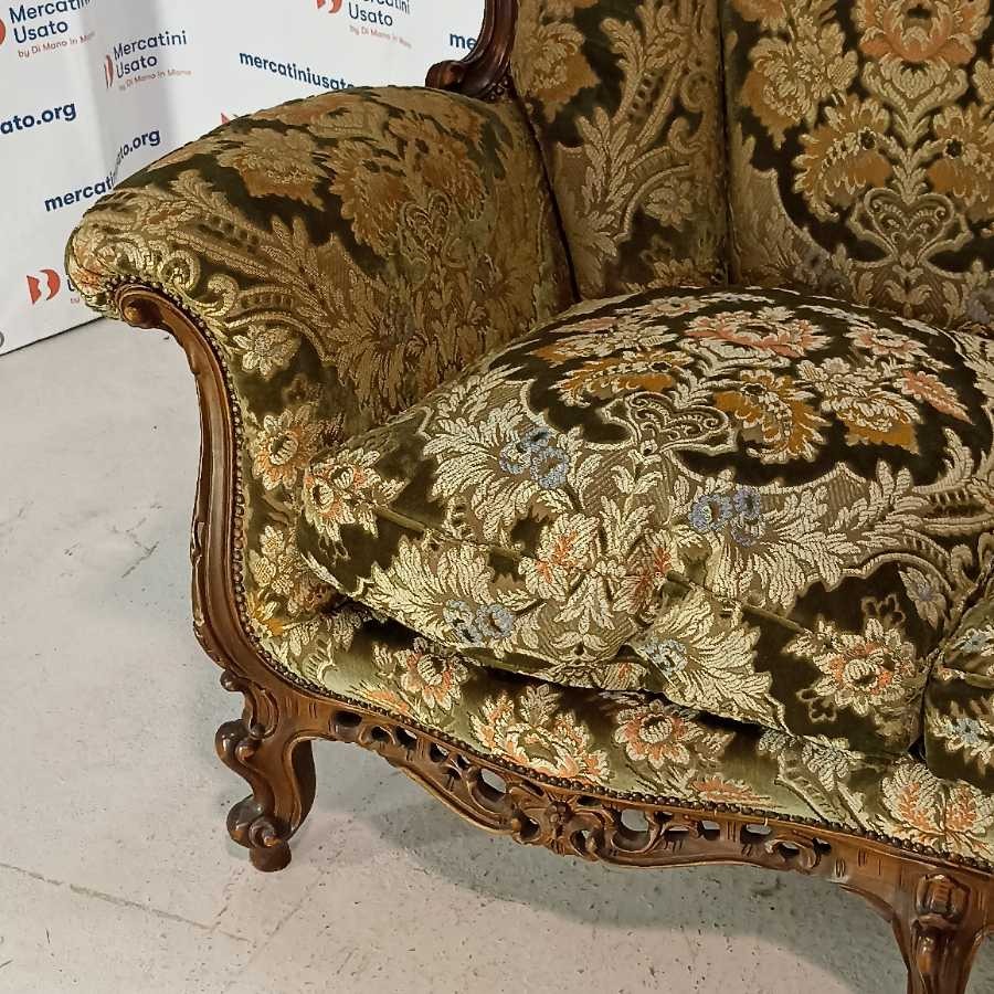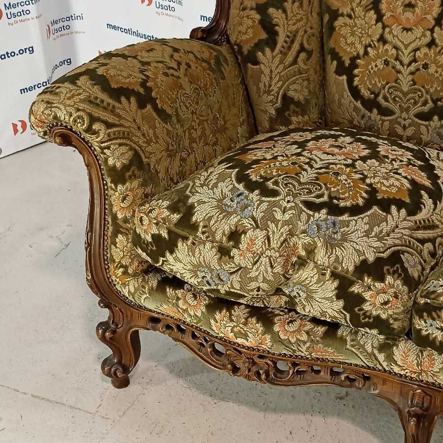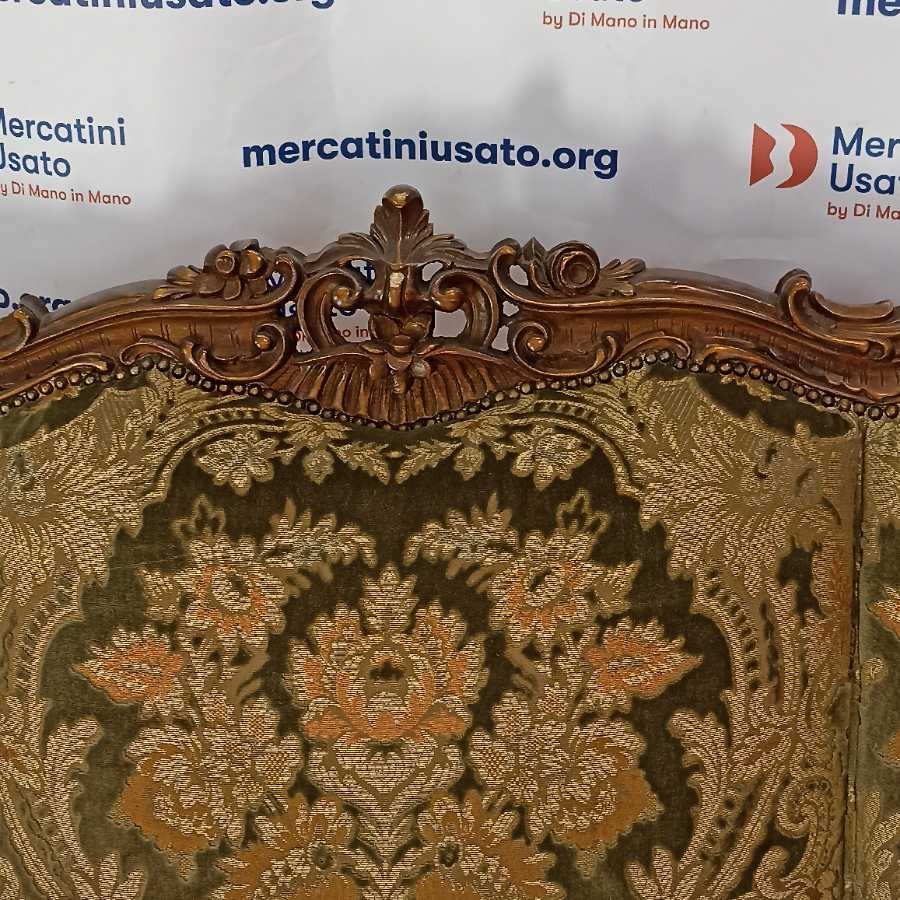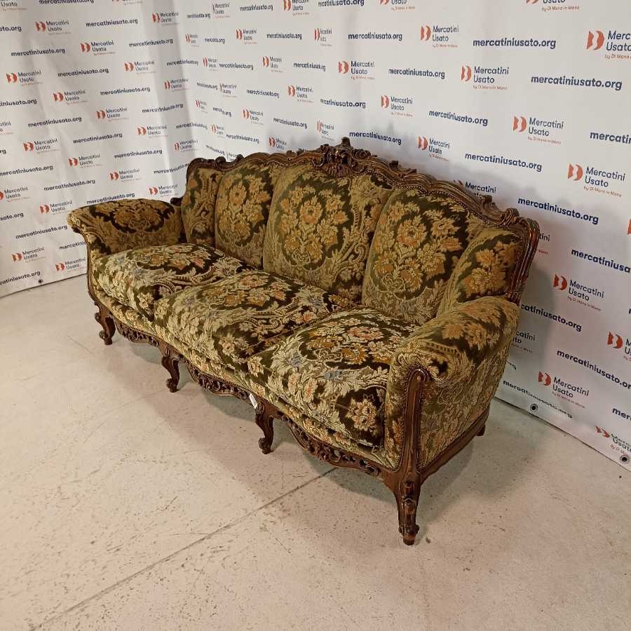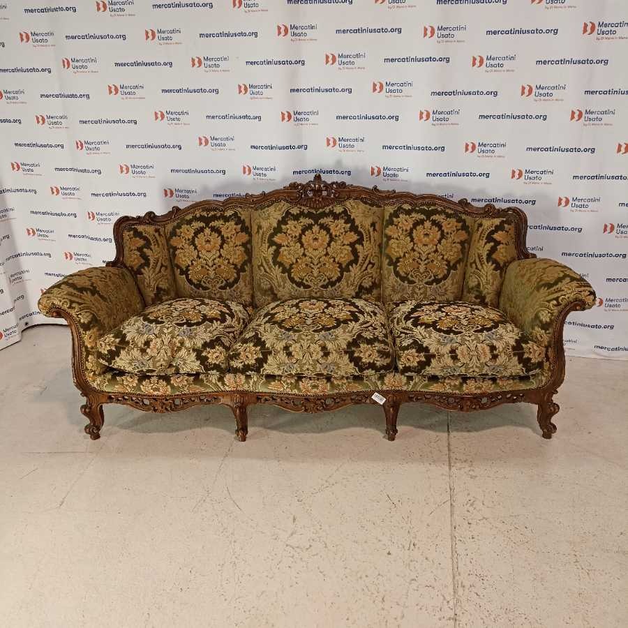 Divano 3 posti in stile Barocco. Struttura in legno intagliato con rivestimento in tessuto Damascato a motivi floreali. Richiede piccoli interventi di restauro.