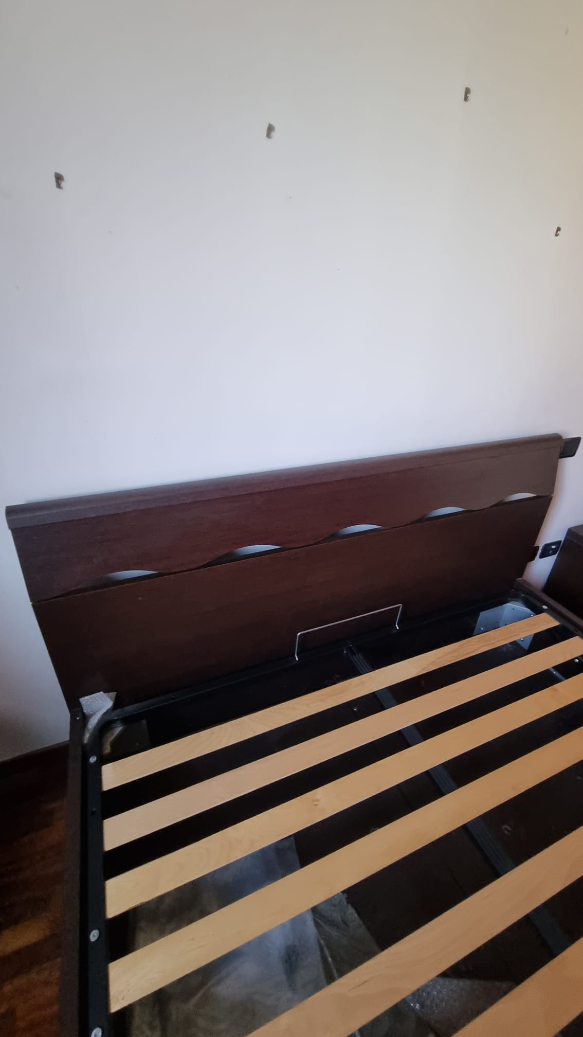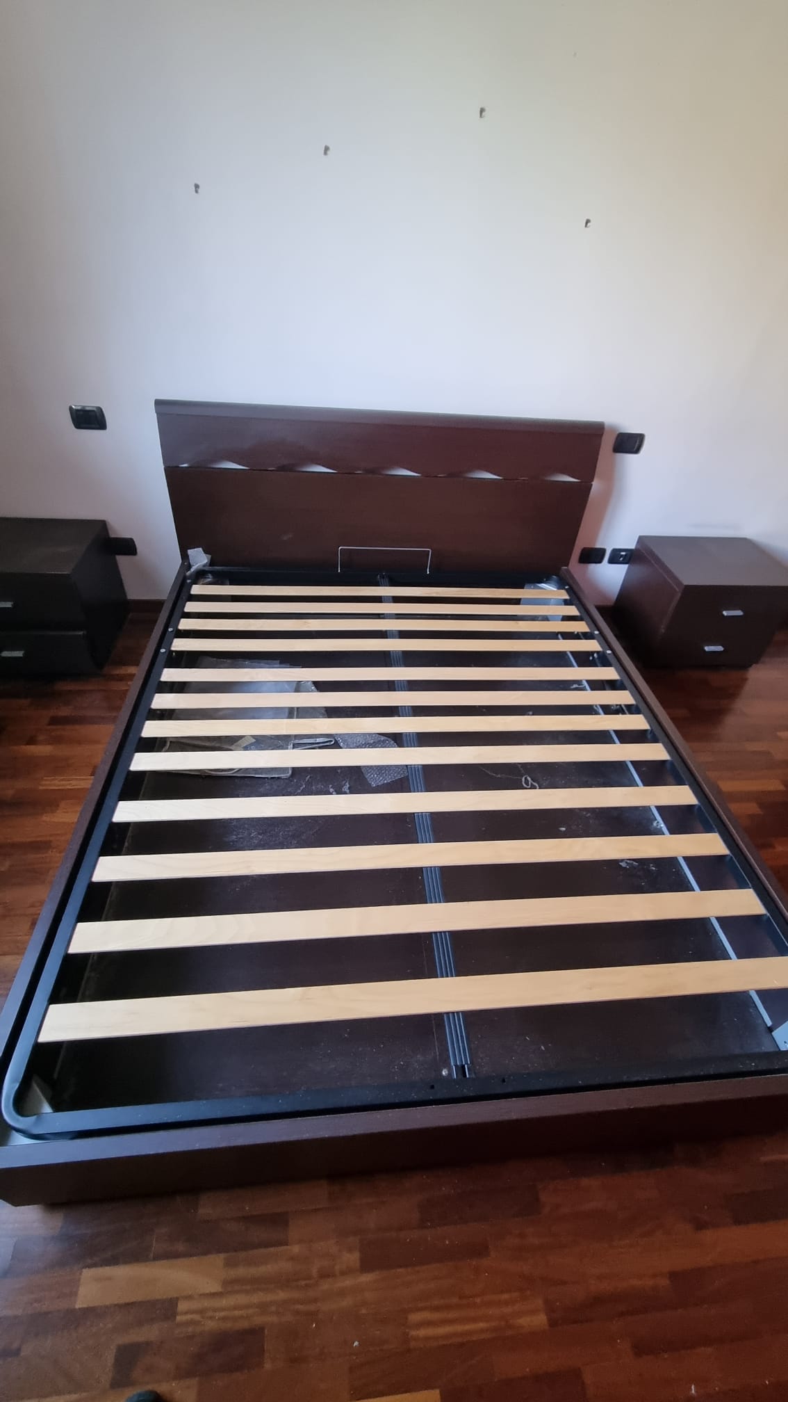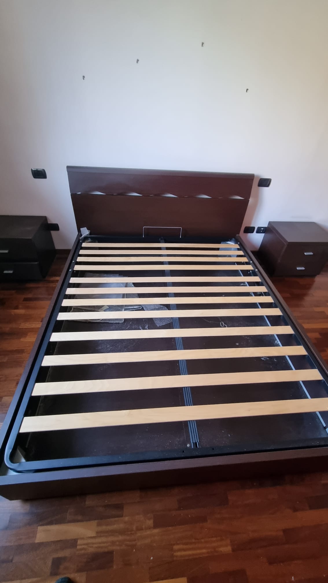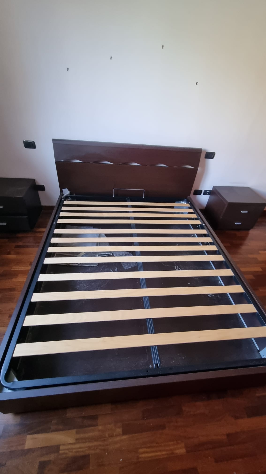 Letto matrimoniale contenitore con Comodini. Struttura in legno impiallacciato. Con rete a doghe in legno. In buone condizioni. Verrà fornito smontato.
