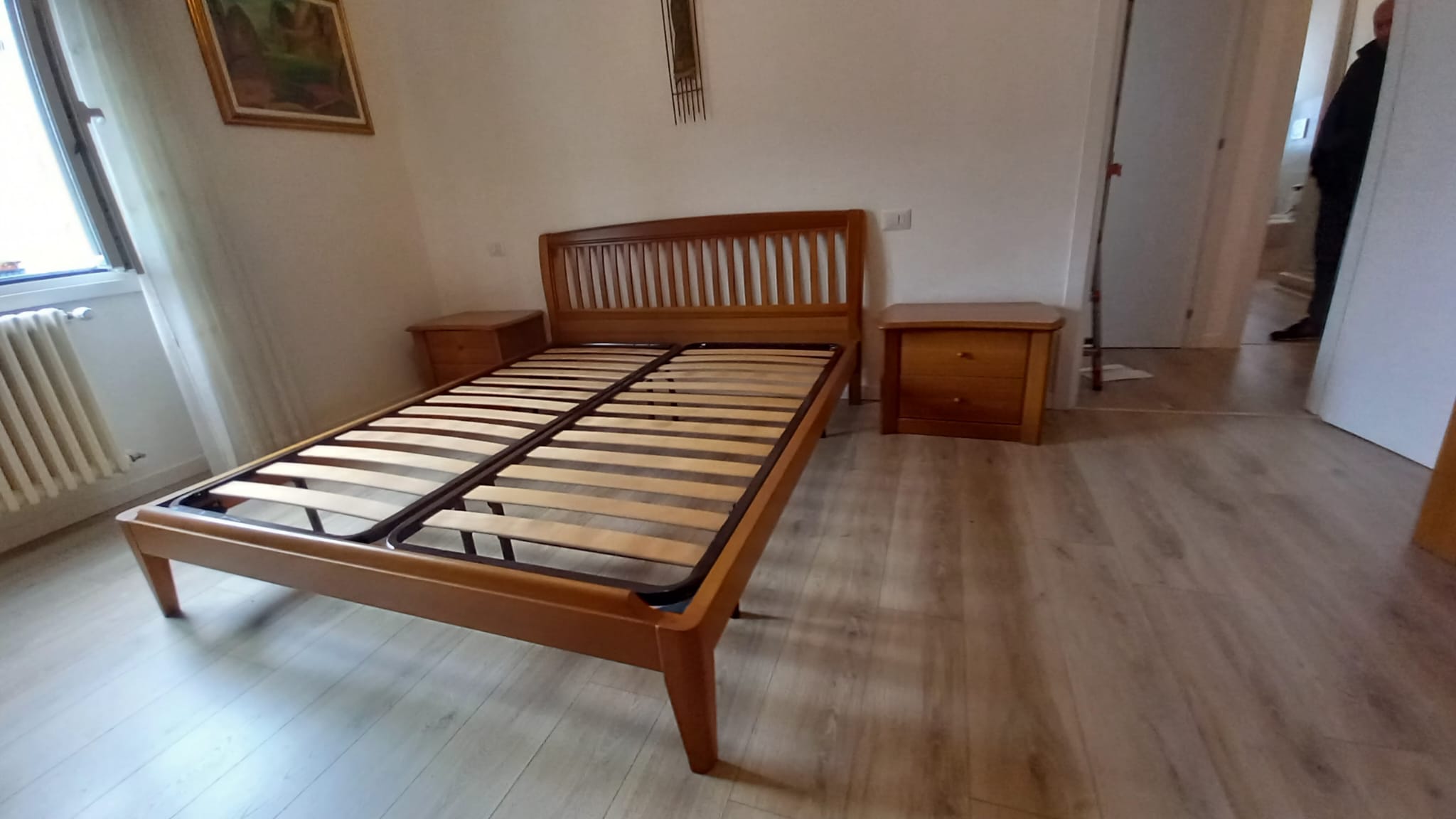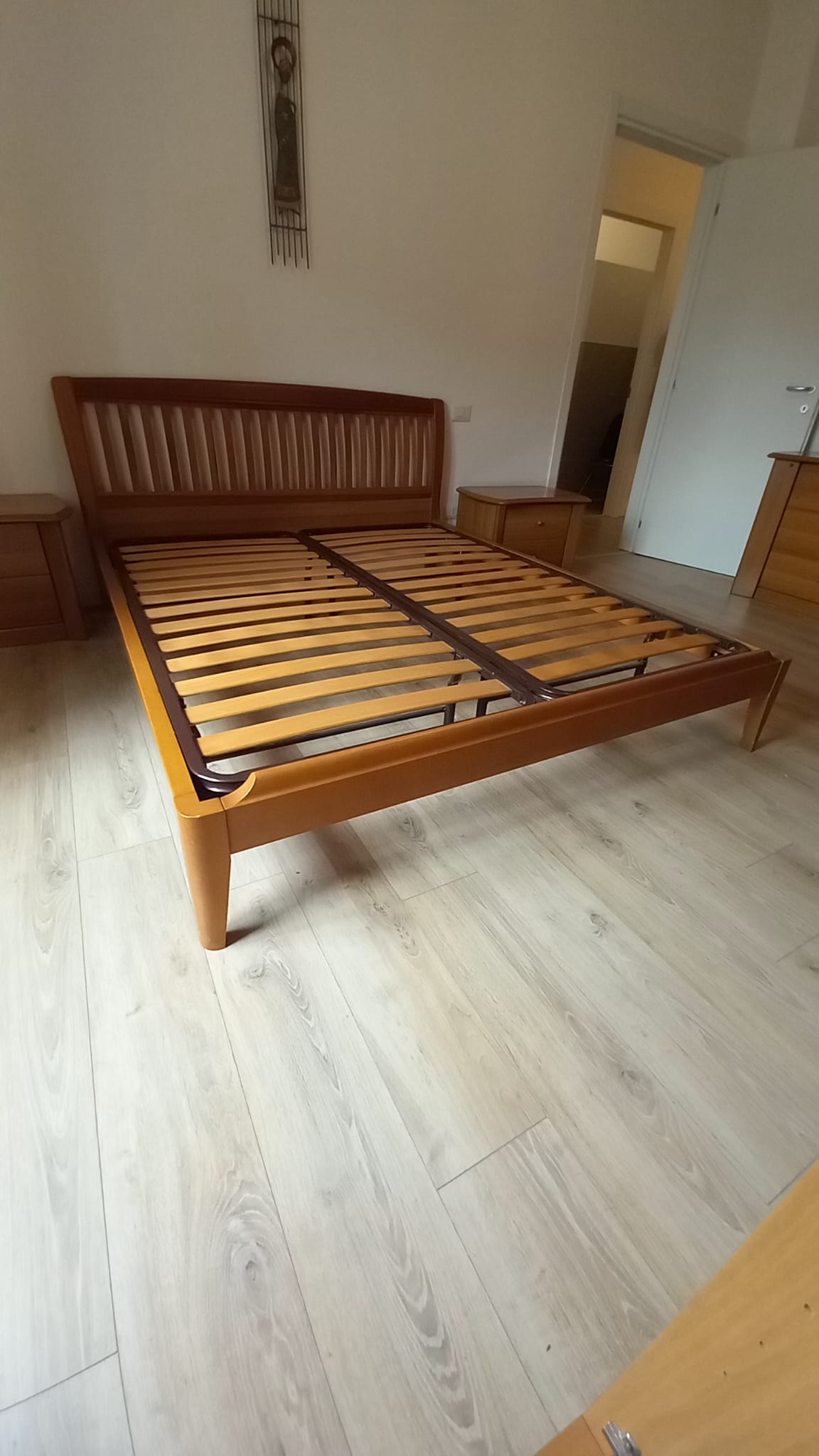 Letto matrimoniale in legno. Struttura in legno impiallacciato. In buone condizioni. Verrà fornito smontato. Reti non incluse