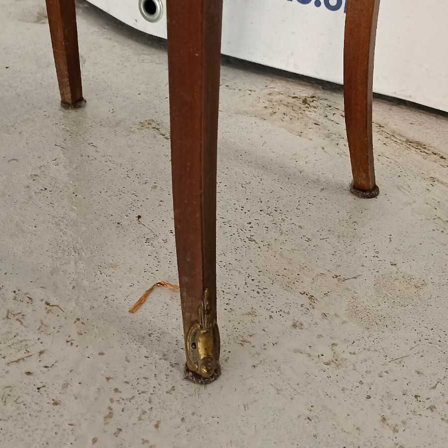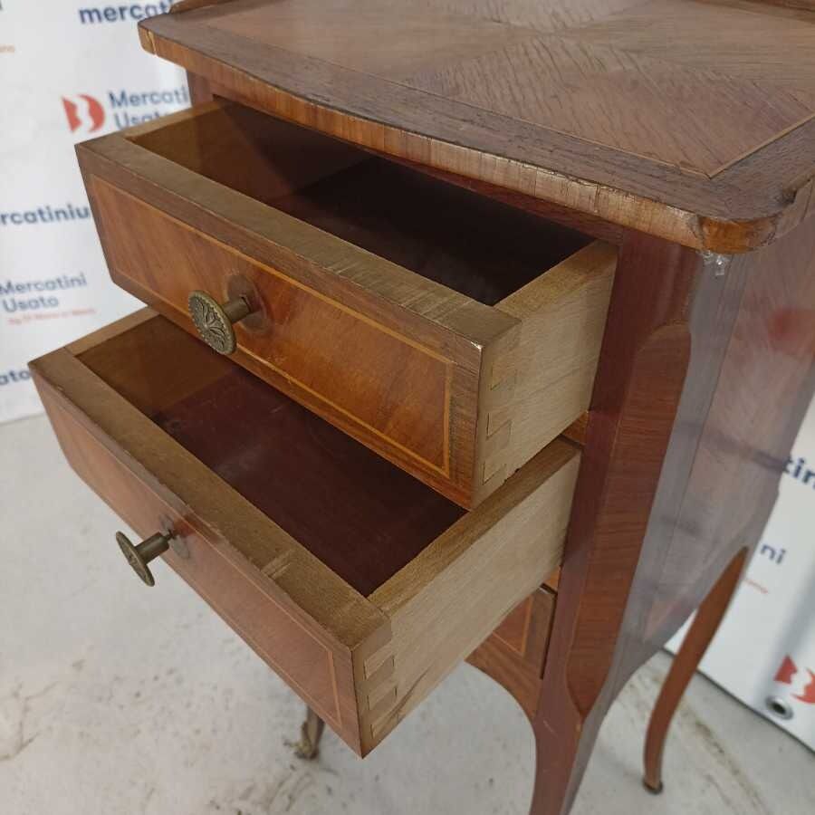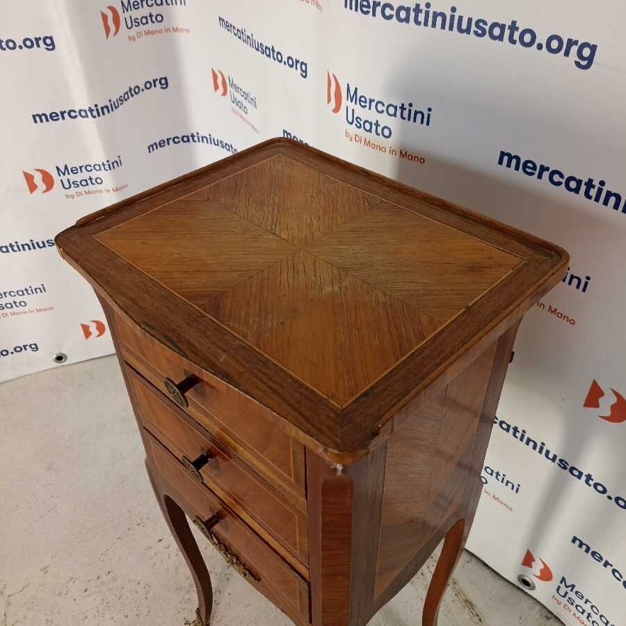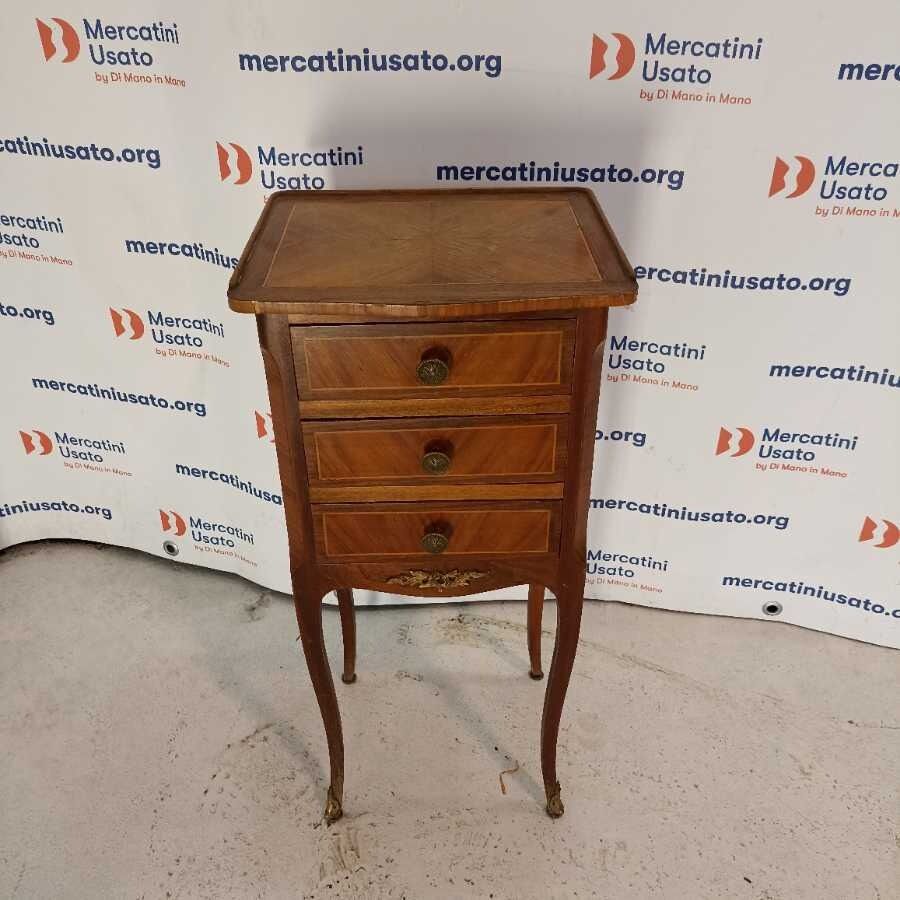 Comodino in stile Neoclassico. Struttura in legno con inserti in ottone. Richiede piccoli interventi di restauro.