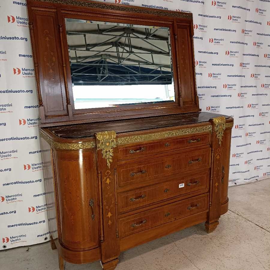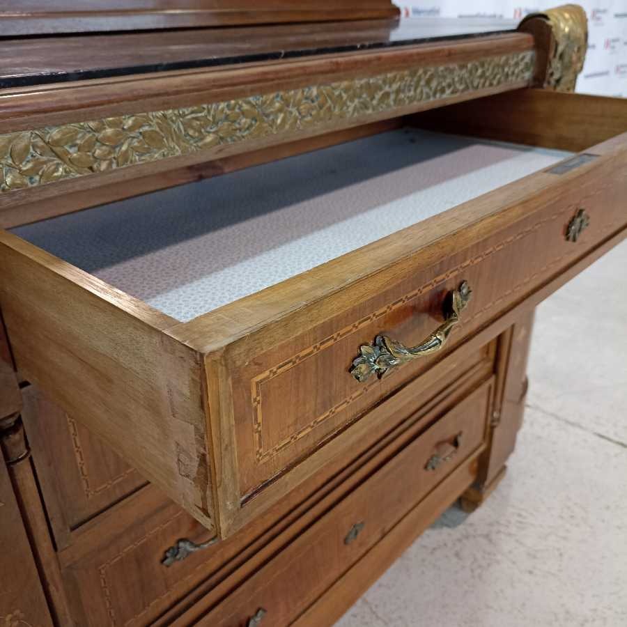 Cassettiera con marmo e specchio primi 900. Struttura in legno intarsiato e intagliato con inserti in ottone e bronzo. Marmo crepato da restaurare.