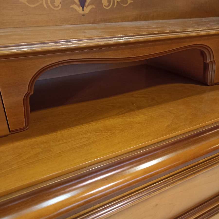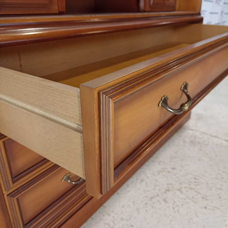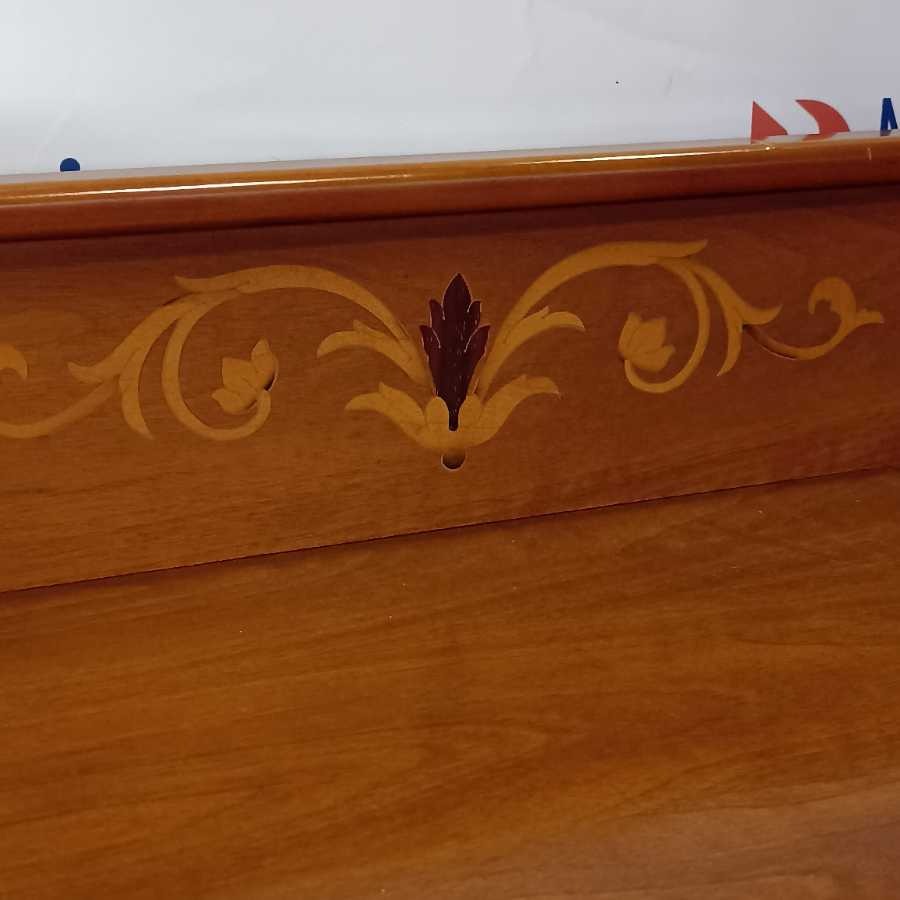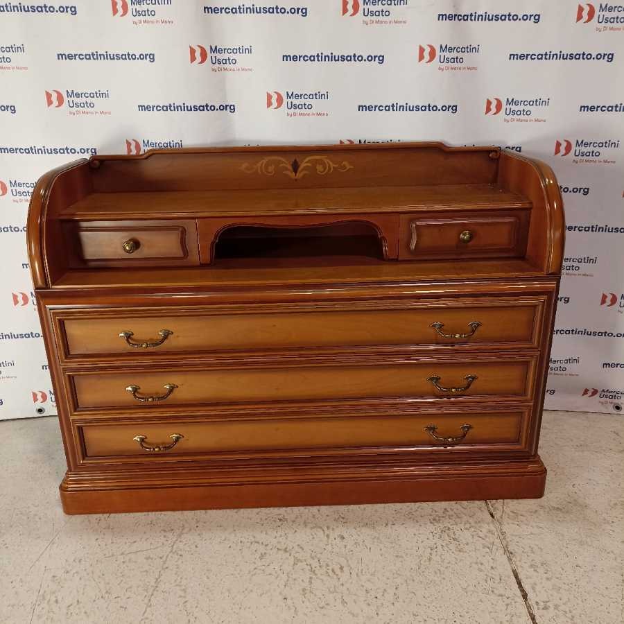 Cassettiera Vintage in stile. Struttura in legno con intarsio e maniglie in ottone. In buone condizioni.
