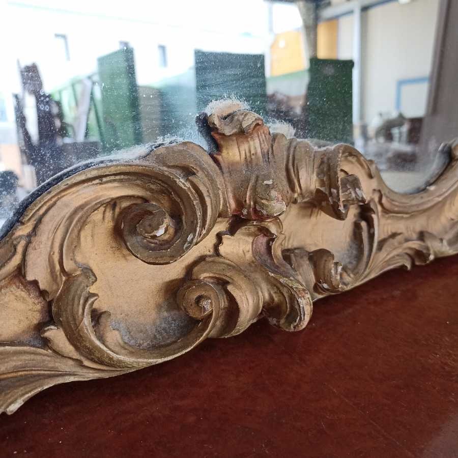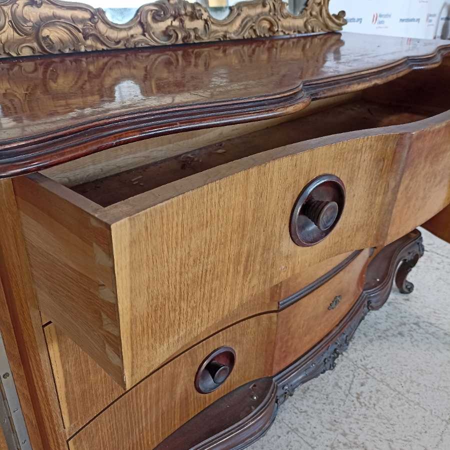 Cassettone con Specchio stile Chippendale. Struttura in legno intagliato con maniglie in bronzo. Specchiera riccamente intagliata. Richiede piccoli interventi di restauro.