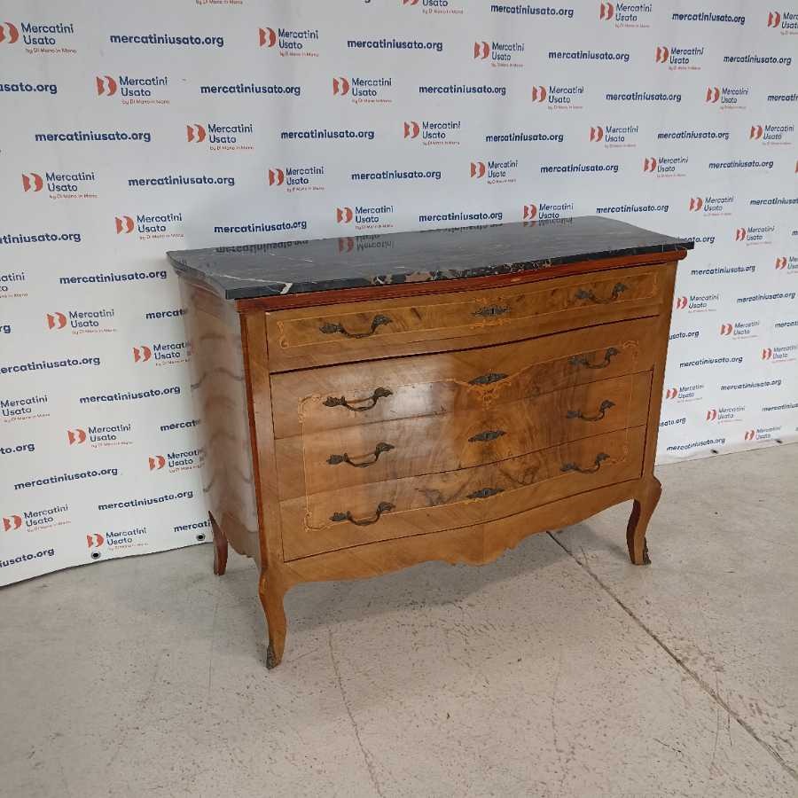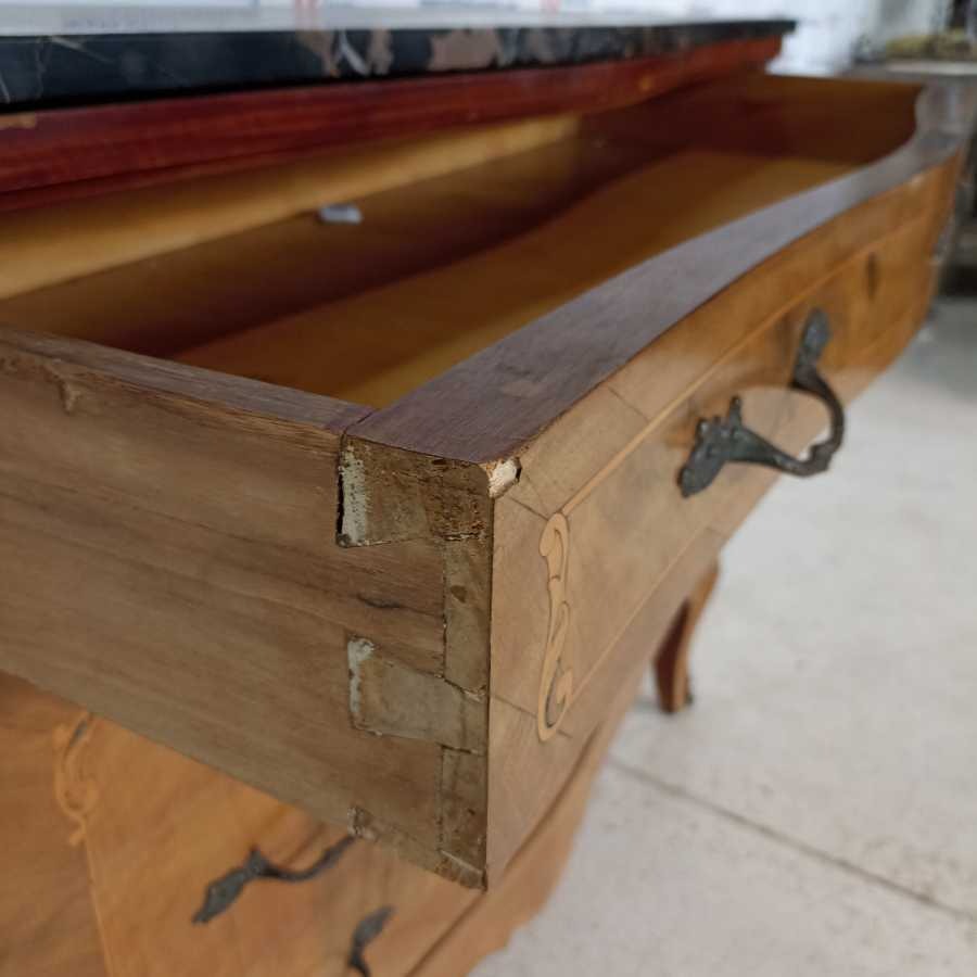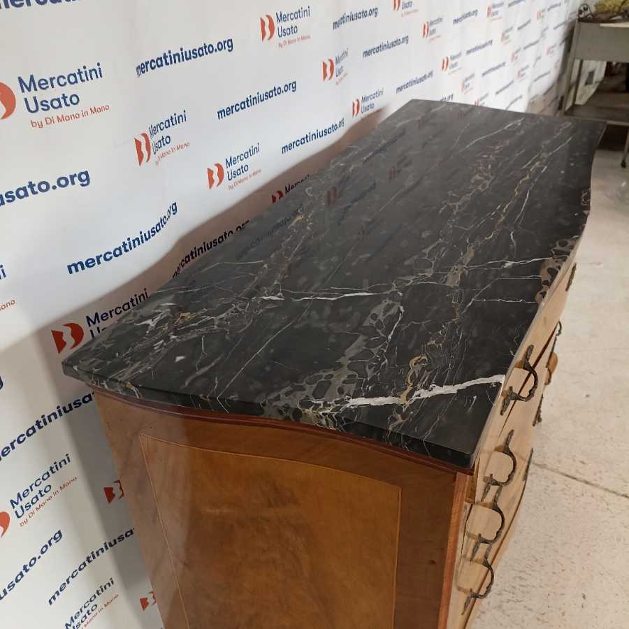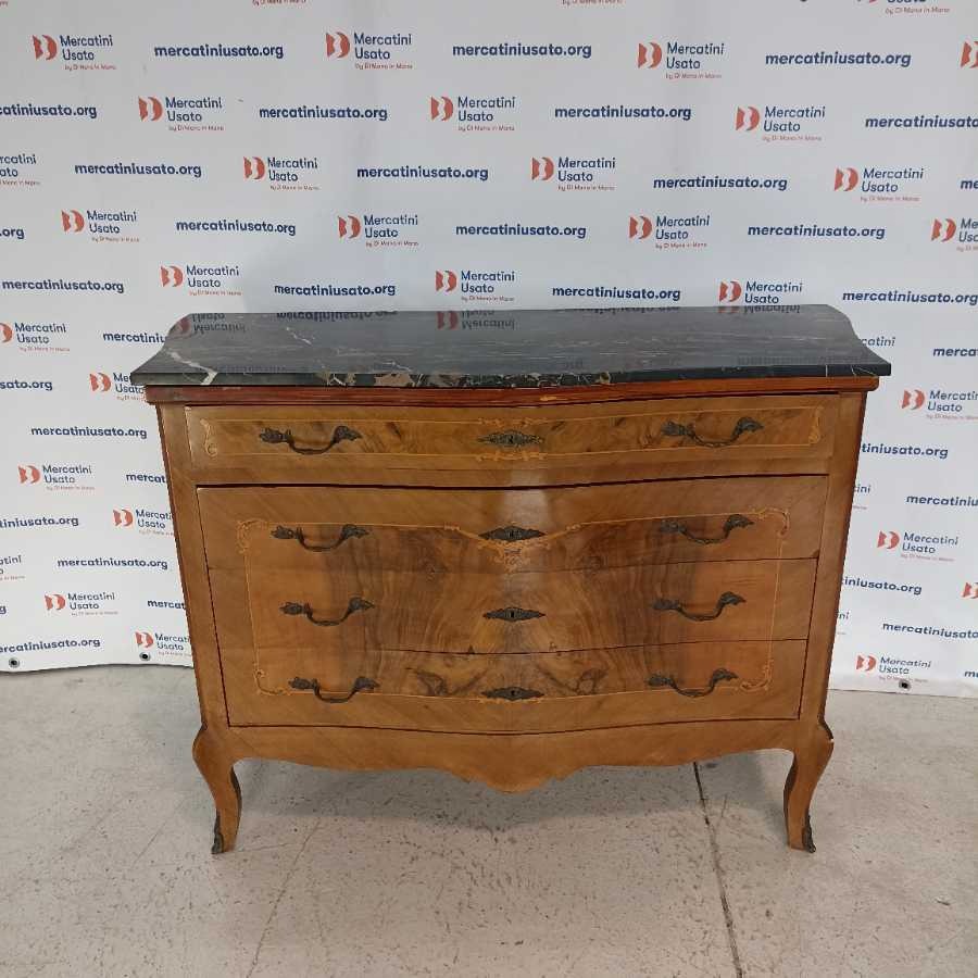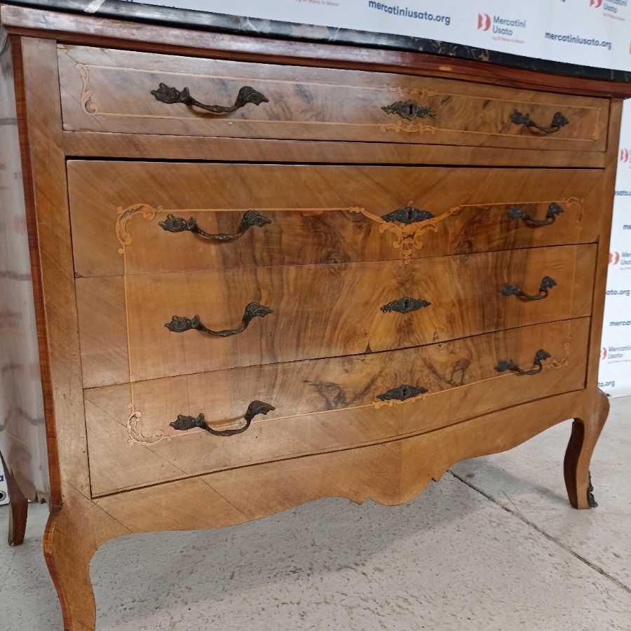 Cassettone intarsiato stile Luigi XV della prima metà del 900. Struttura in legno intarsiato con radica. Maniglie in ottone e piano sagomato in marmo. Richiede piccoli interventi di restauro.