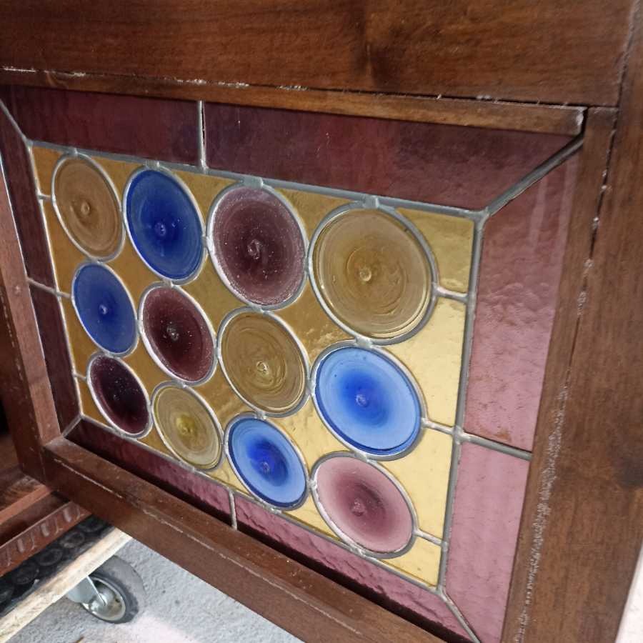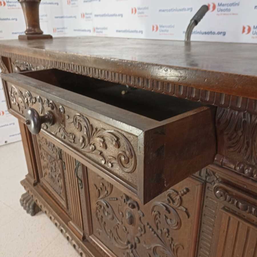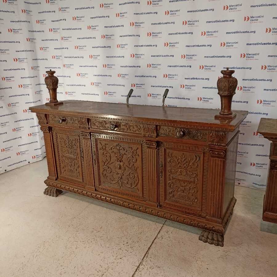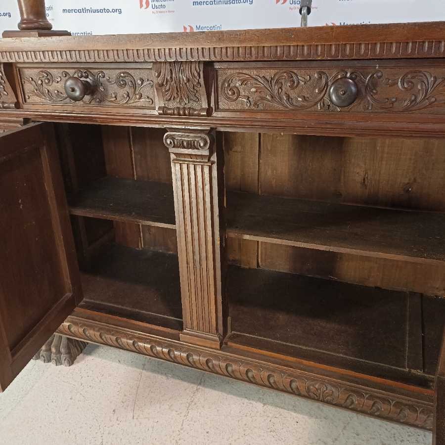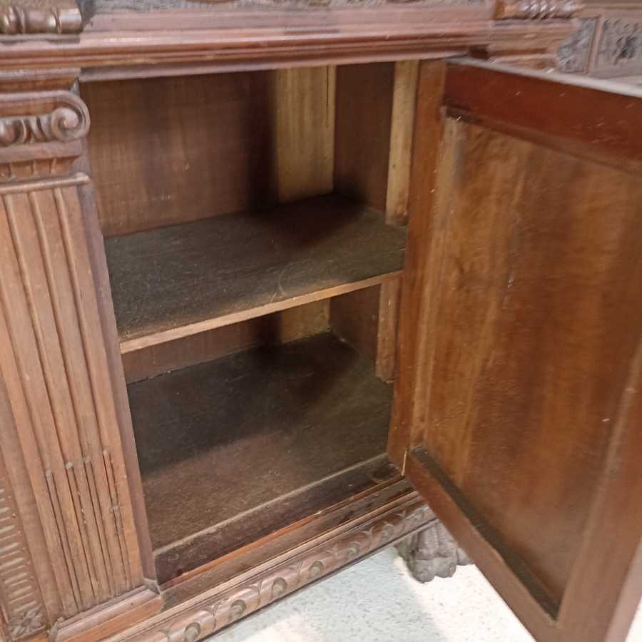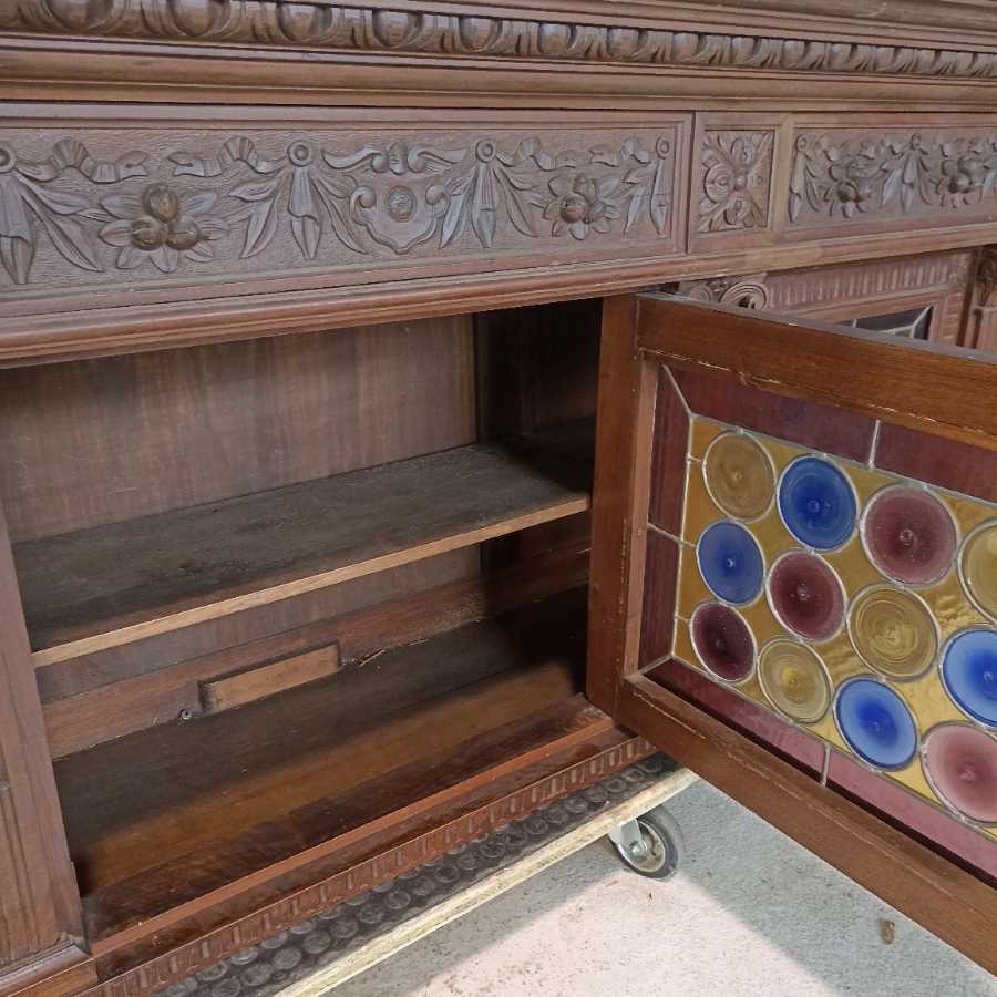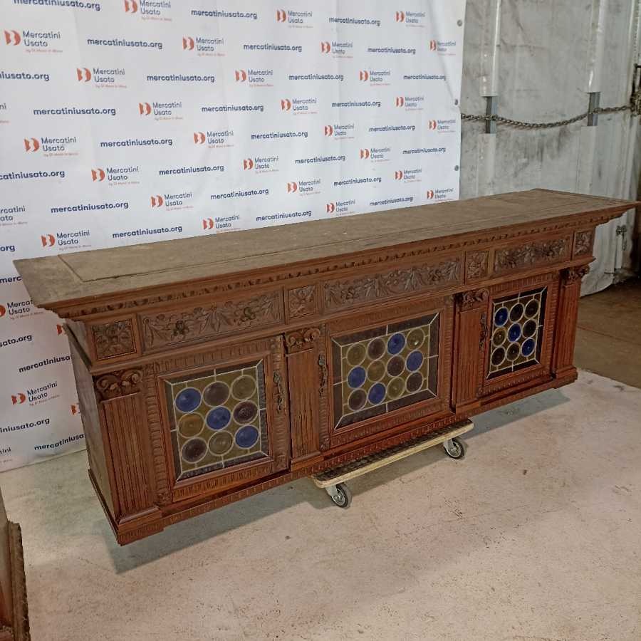 Credenza a doppio corpo Neorinascimento primi 900. Struttura in legno di Noce con intagli e ante in vetro piombato. Richiede restauri.
