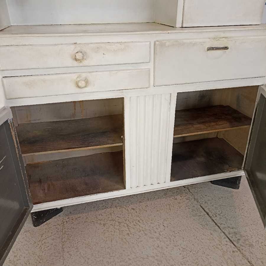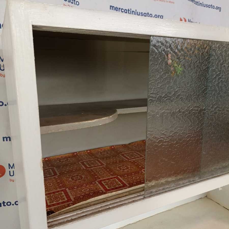 Credenza da Cucina Laccata anni 50 Vintage. Struttura in legno laccato bianco con ante scorrevoli in vetro. Richiede restauri.