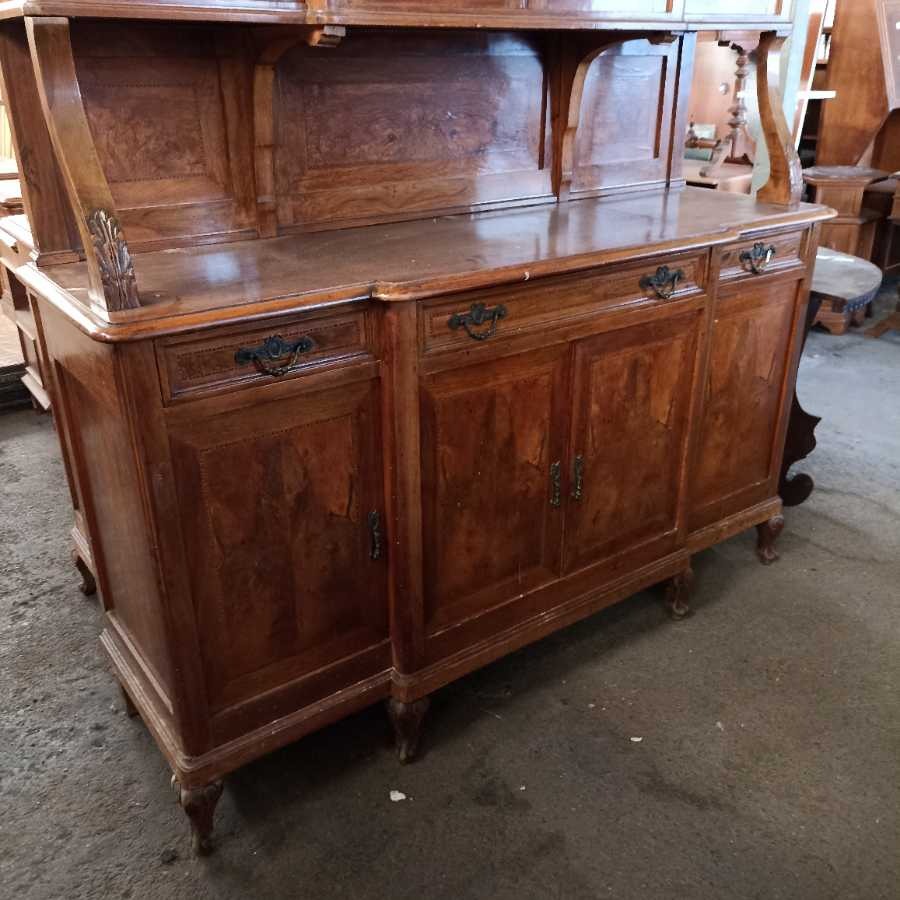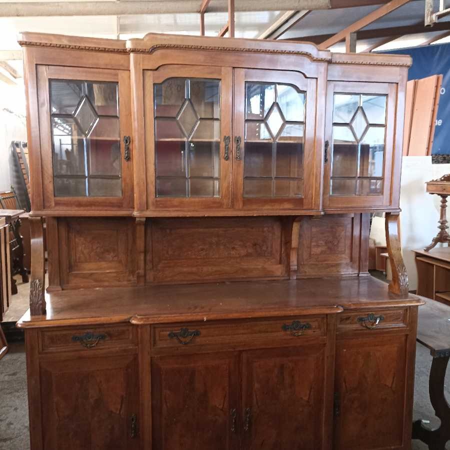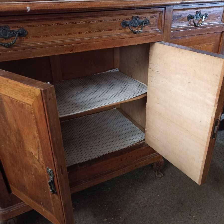 Credenza doppio corpo in stile primi 900. Struttura in legno intarsiato con ante in vetro molato. Richiede restauri.