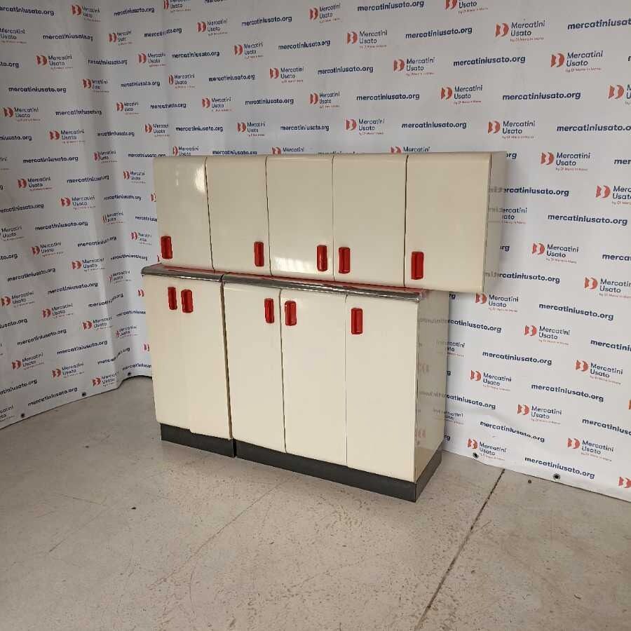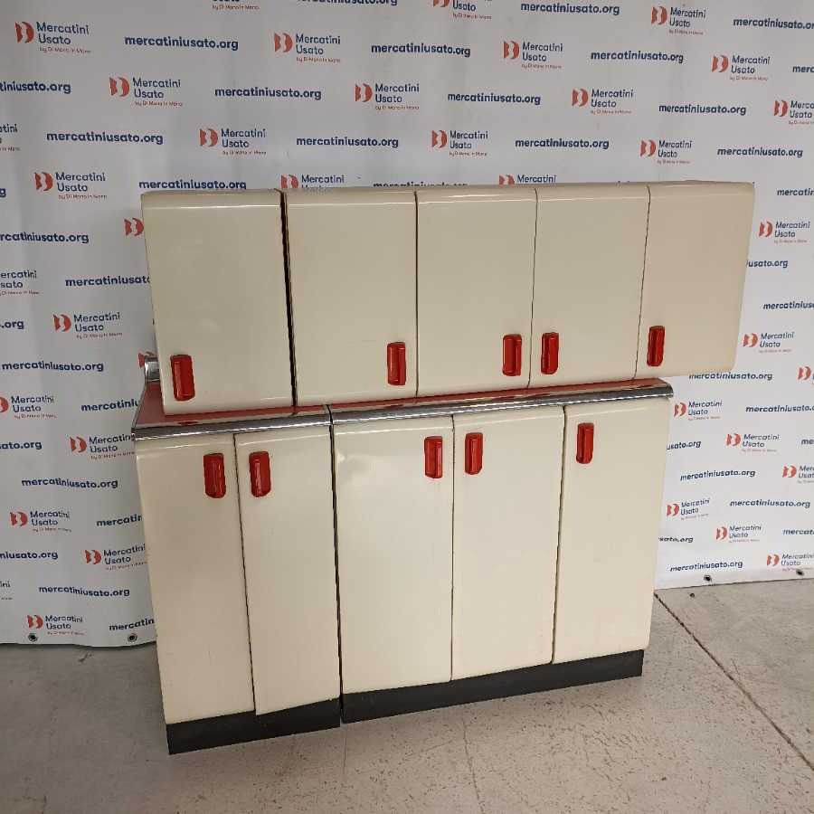 Mobile Cucina con pensile Vintage anni 50. Struttura in ferro laccato bianco con piano in formica rosso e bordi cromati. Presenta segni di usura. Misure singole: