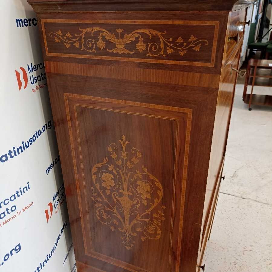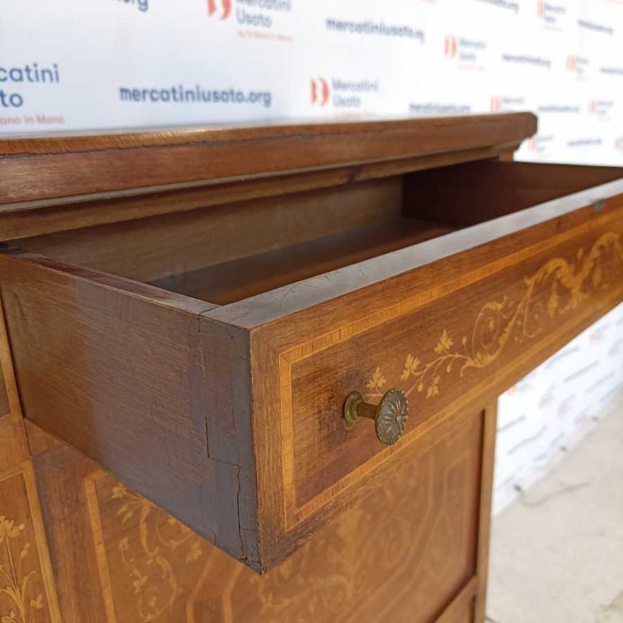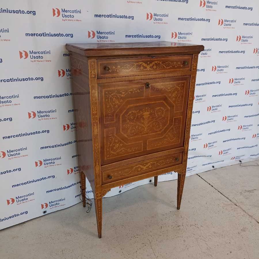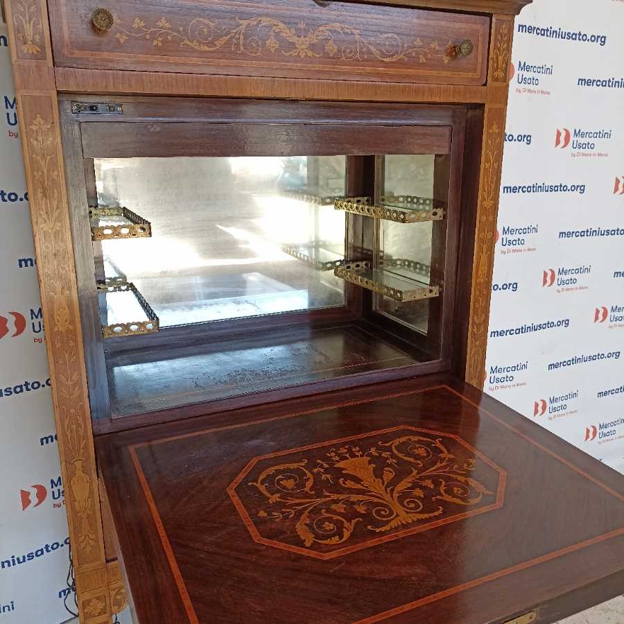 Secrétaire in stile Luigi XVI. Struttura in legno intarsiato con interno a specchio. Richiede piccoli interventi di restauro.
