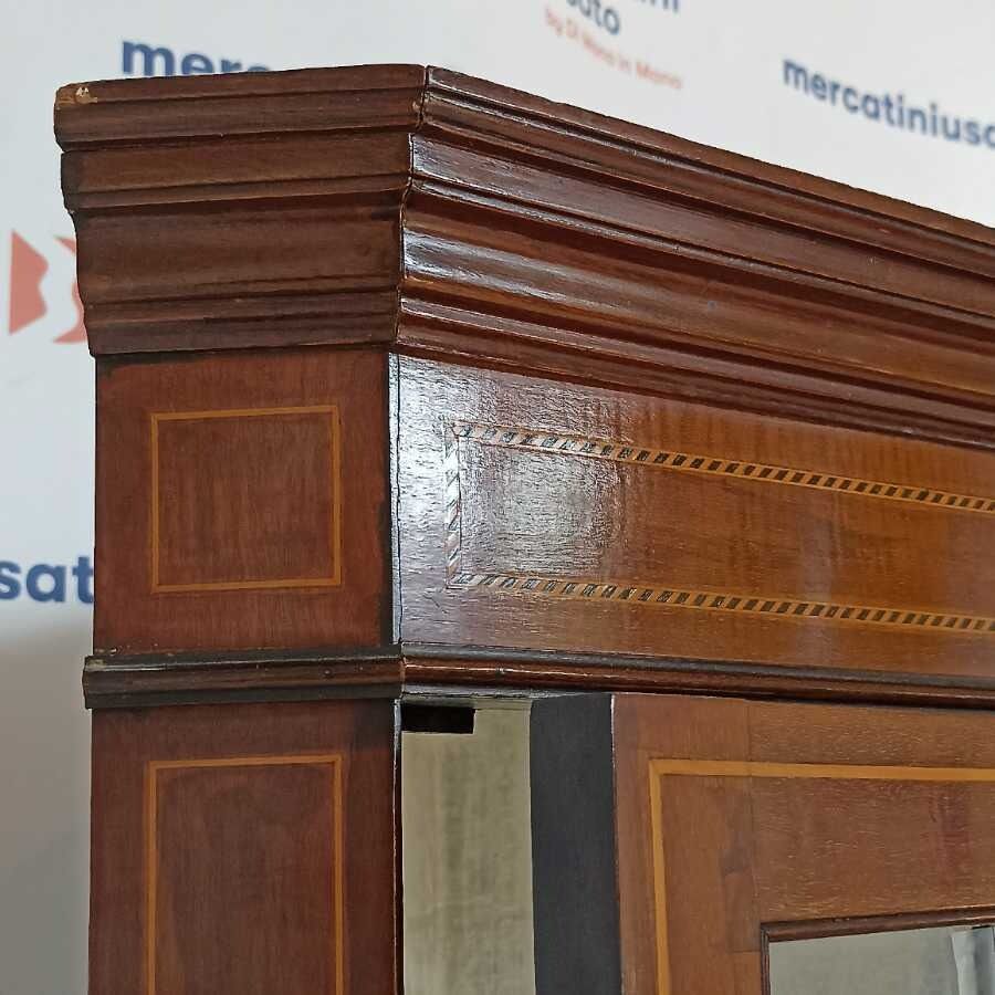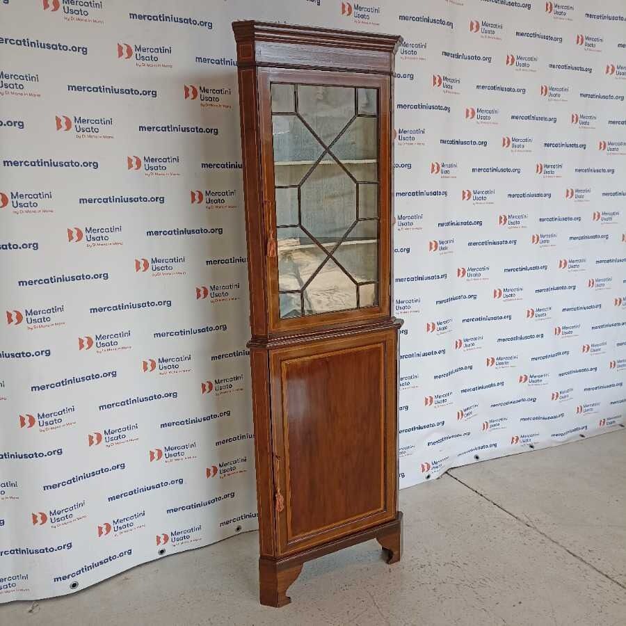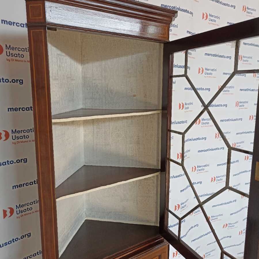 Vetrina ad angolo stile Inglese. Struttura in legno intarsiato. Anta in vetro. In buone condizioni.
