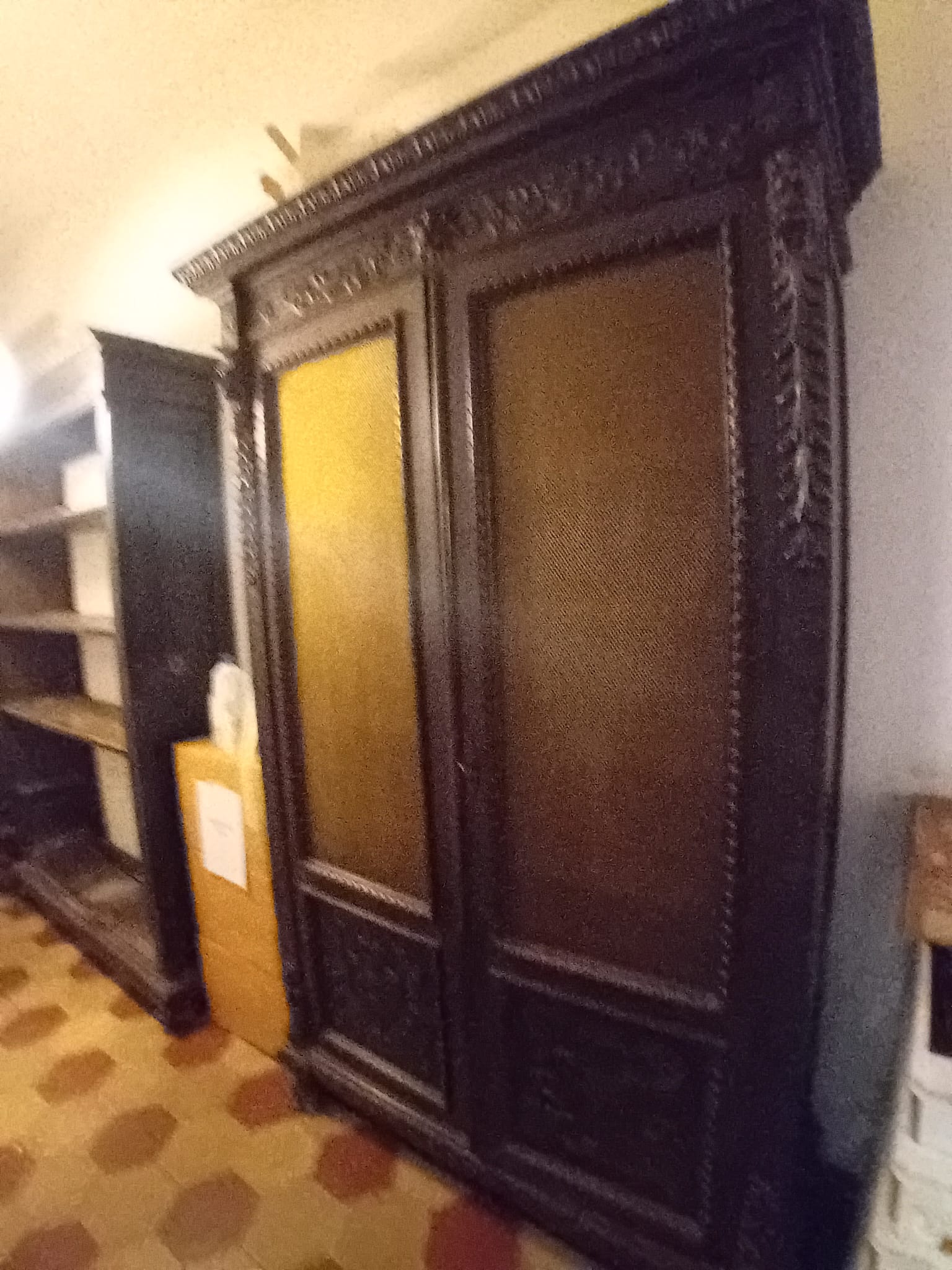 Vetrina Neorinascimento primi 900. Struttura in legno intagliato con ante in vetro colorato. Richiede restauri.