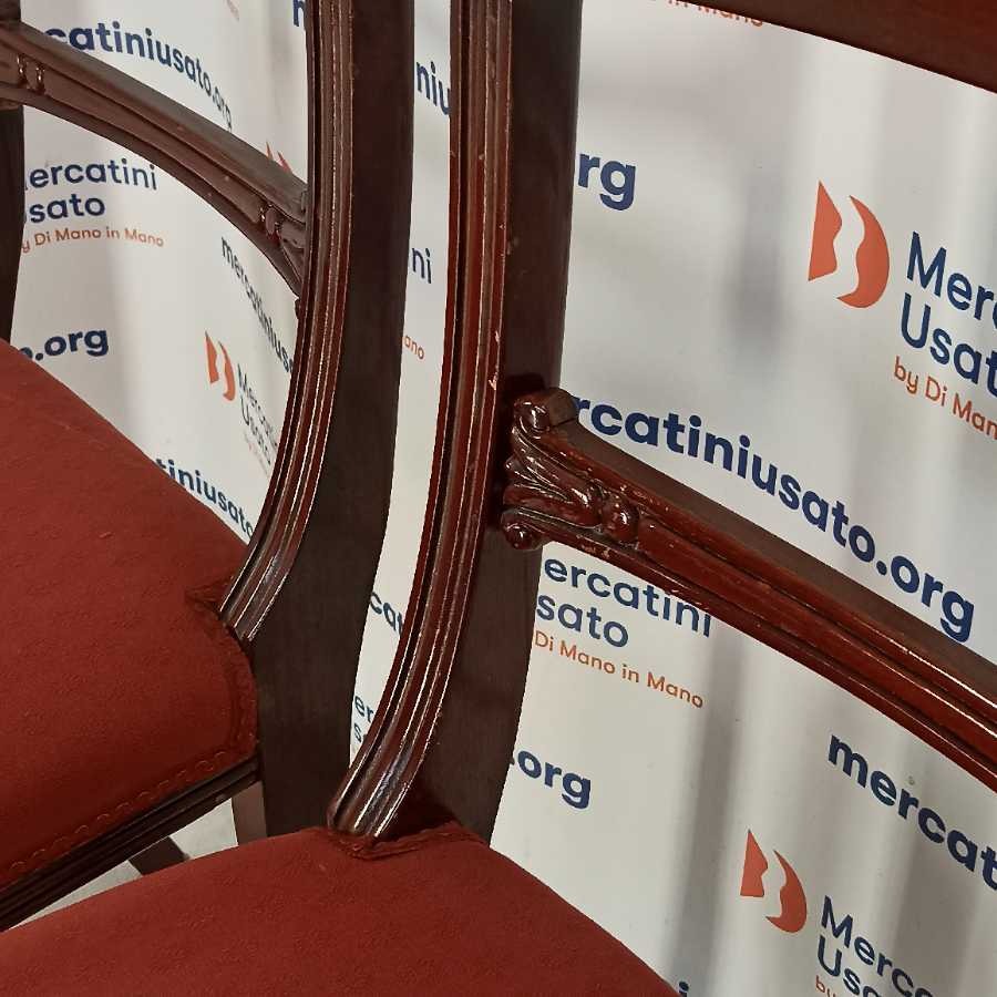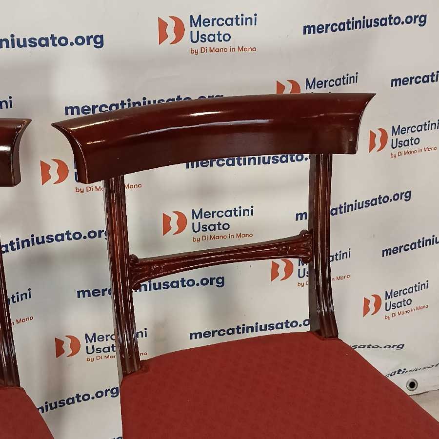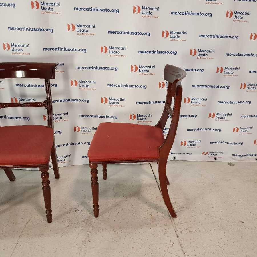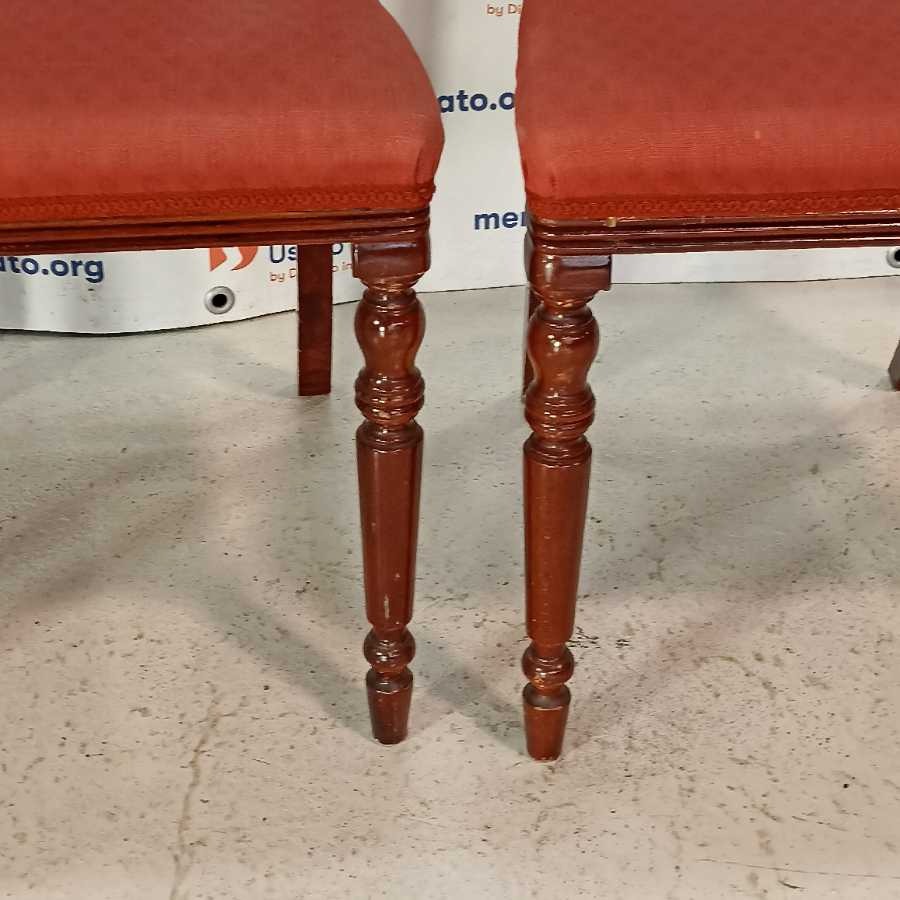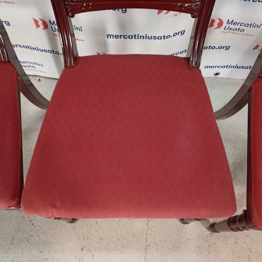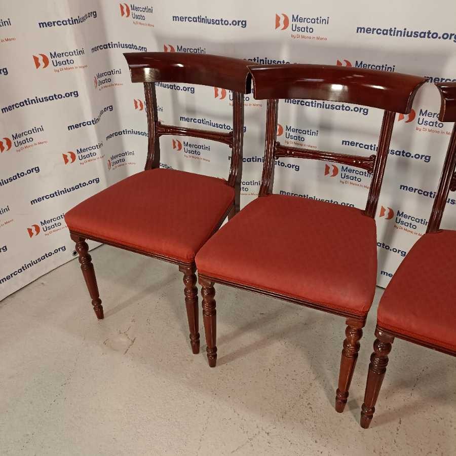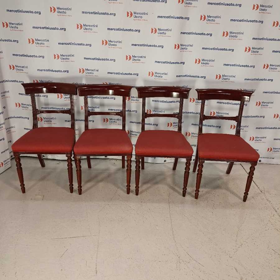 Gruppo di 4 Sedie in mogano stile Inglese. Struttura in legno di mogano tornito con seduta rivestita in tessuto.