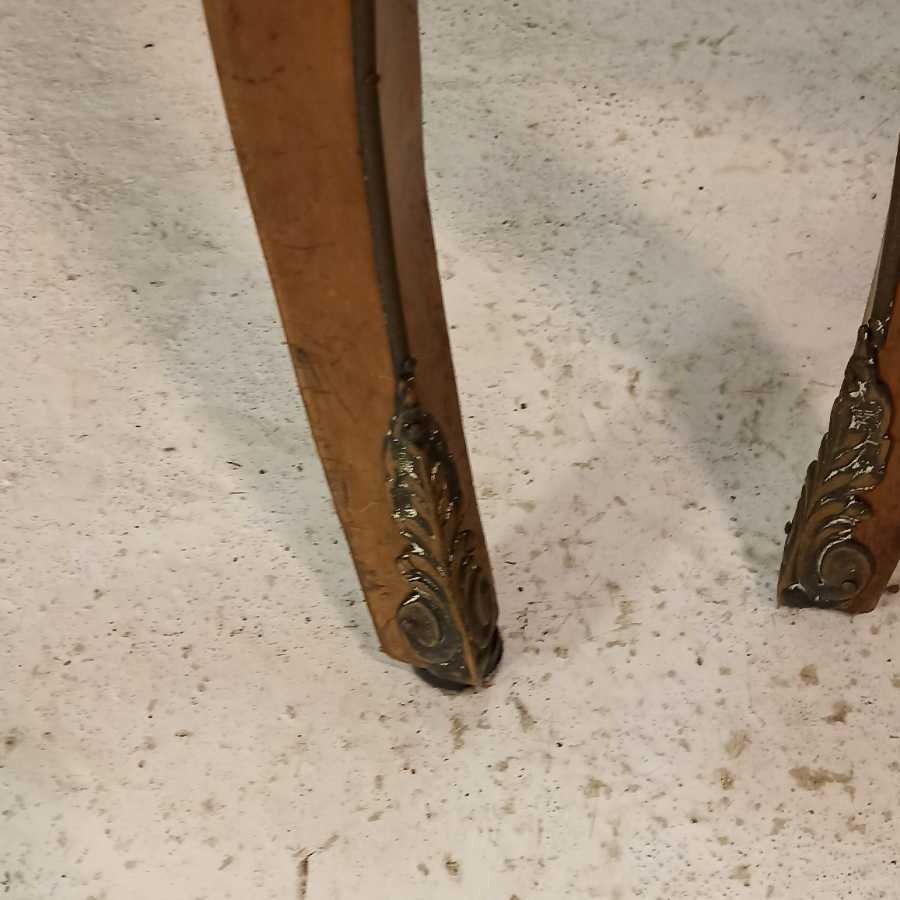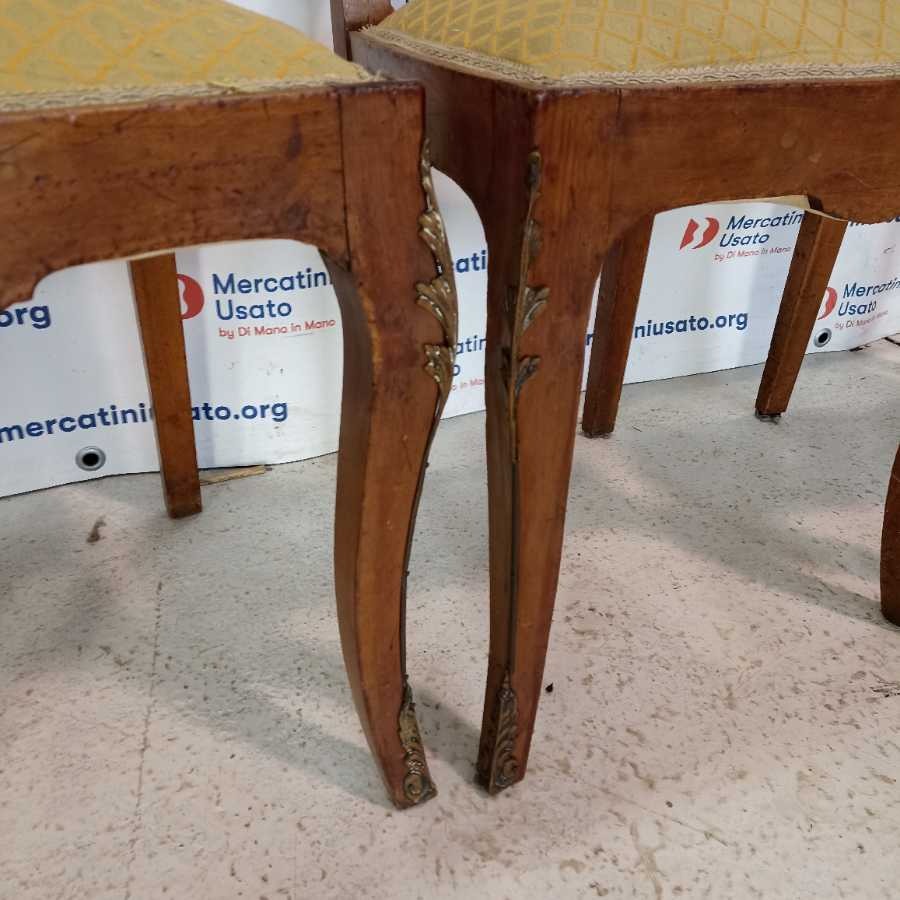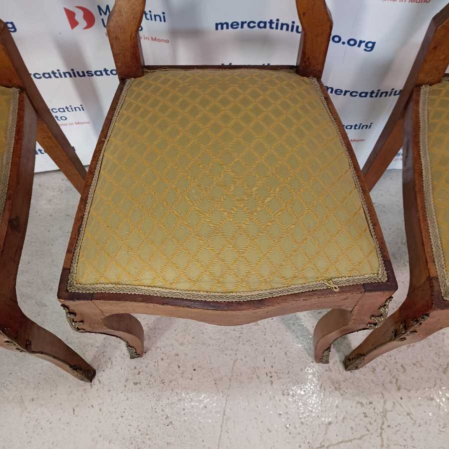 Gruppo di 4 Sedie prima metà 900 in legno massello. Struttura in legno massello con rivestimento in tessuto. Inserti in bronzo. Richiedono piccoli interventi di restauro.