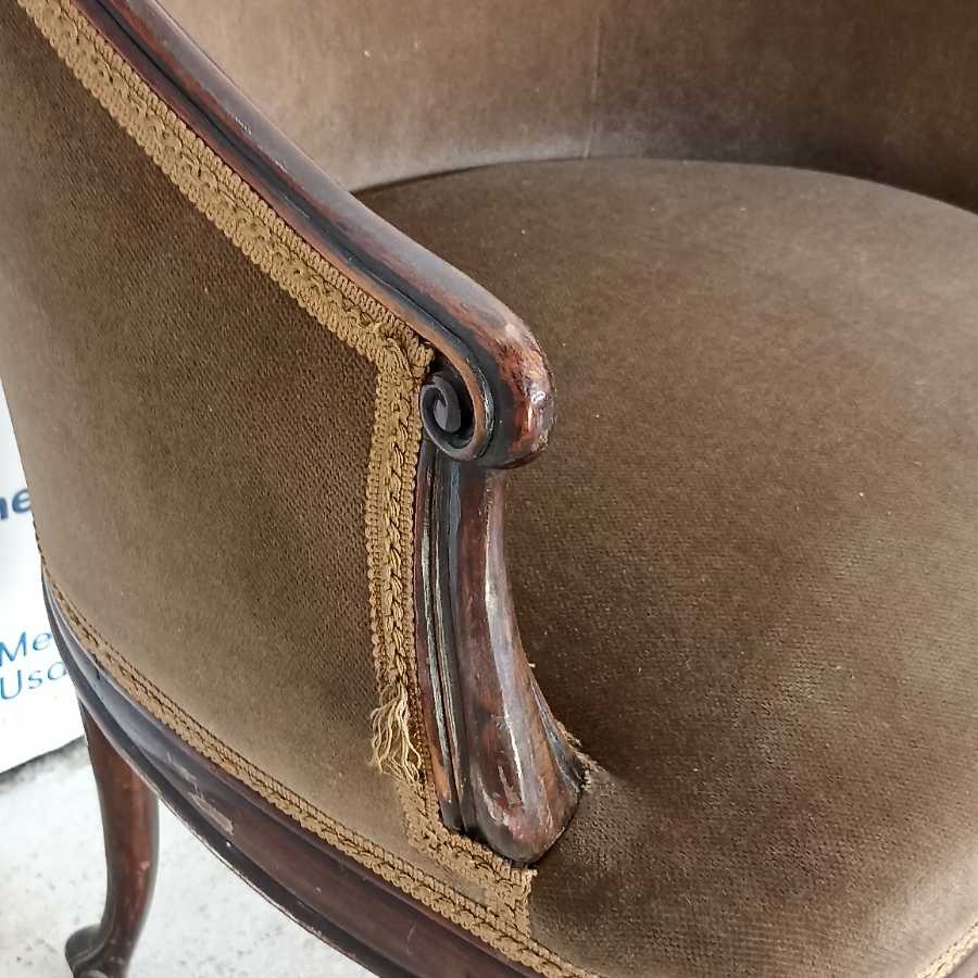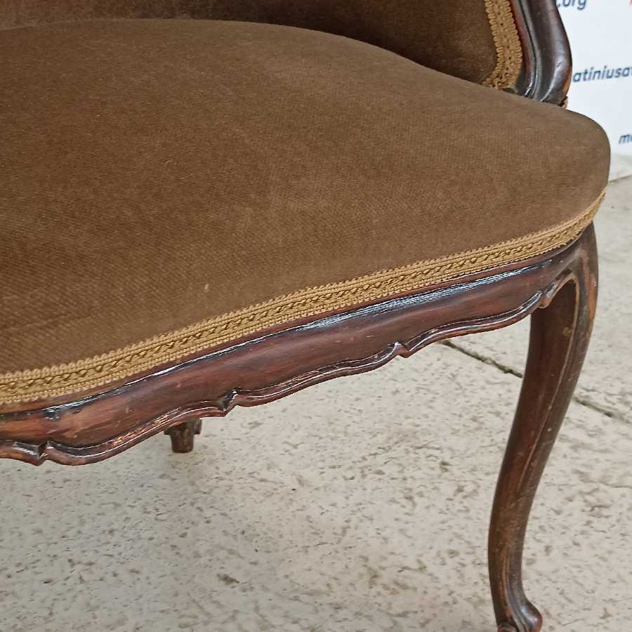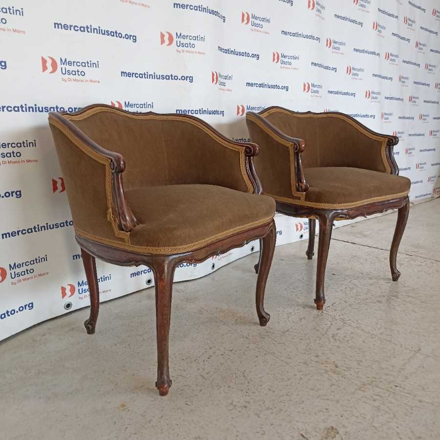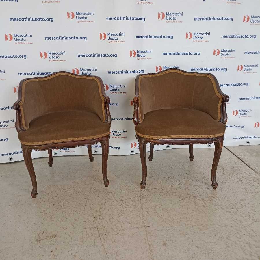 Coppia Poltroncine a pozzetto stile Luigi XV. Struttura in legno intagliato con rivestimento in tessuto. Richiedono piccoli interventi di restauro.