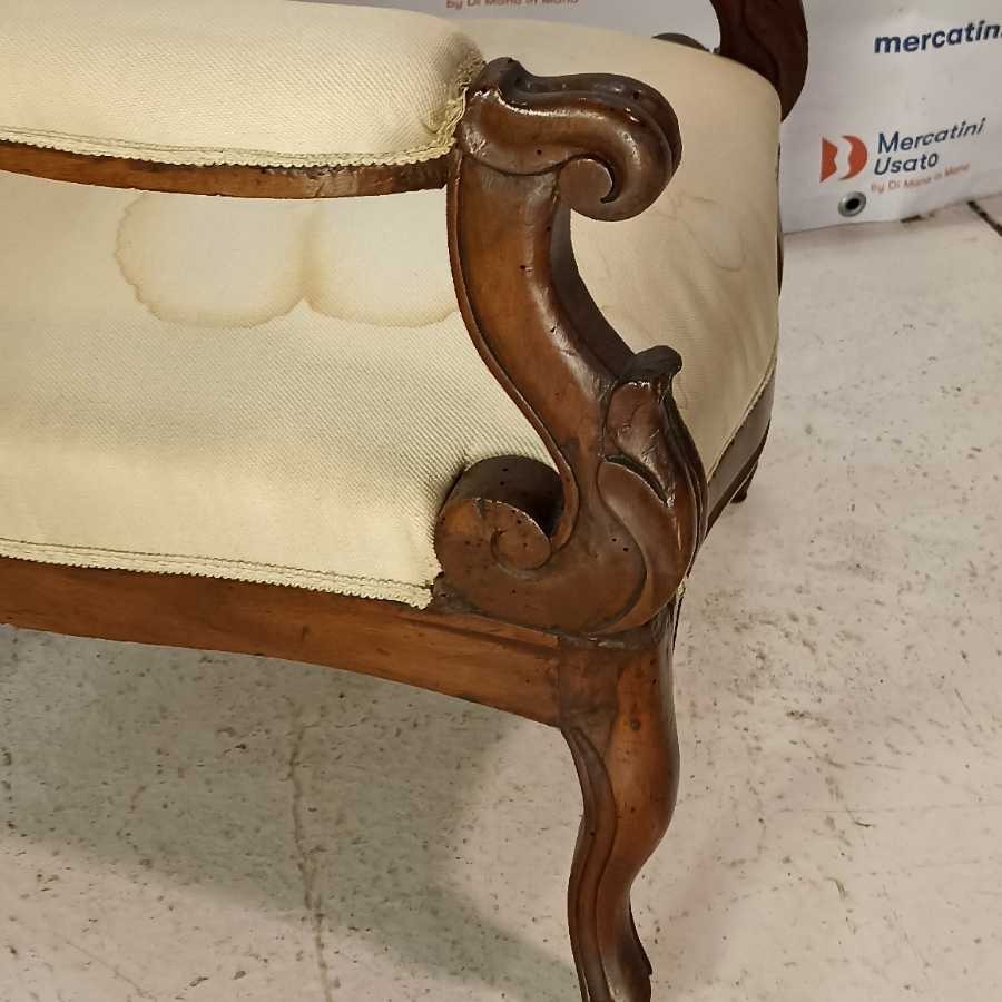 Poltrona Antica stile Luigi Filippo prima metà 900. Struttura in legno intagliato con rivestimento in tessuto. Richiede restauri.