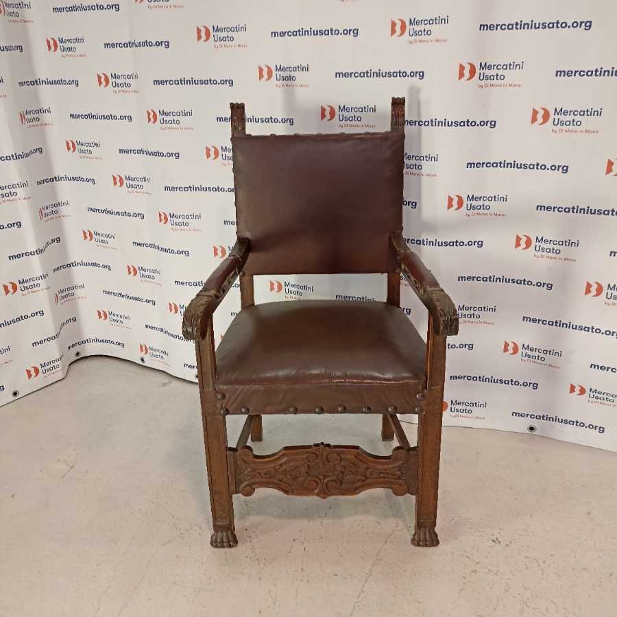 Trono in stile Neorinascimento. Struttura in legno intagliato con rivestimento in pelle borchiata. In buone condizioni.