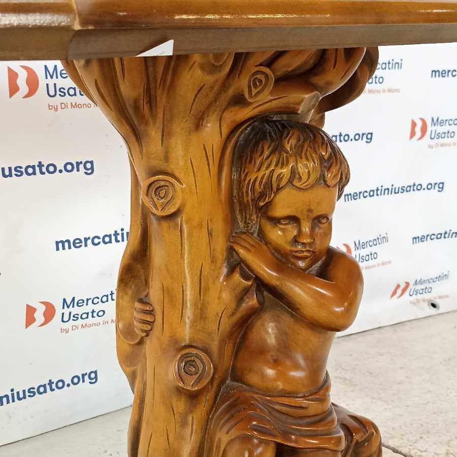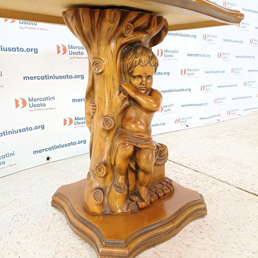 Tavolino con putto in stile. Struttura in legno con base intagliata a putto. Presenta piccoli segni di usura.