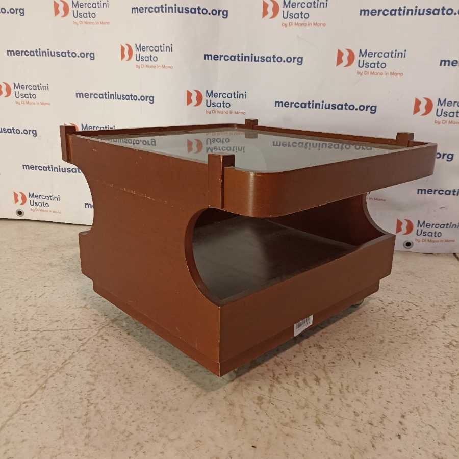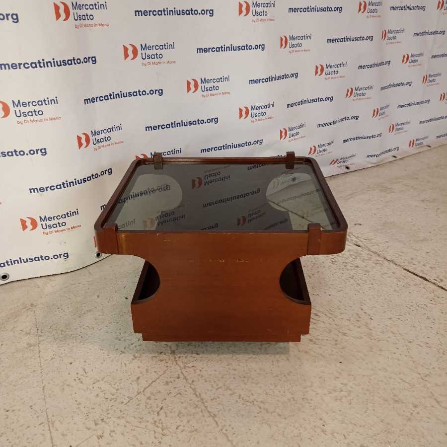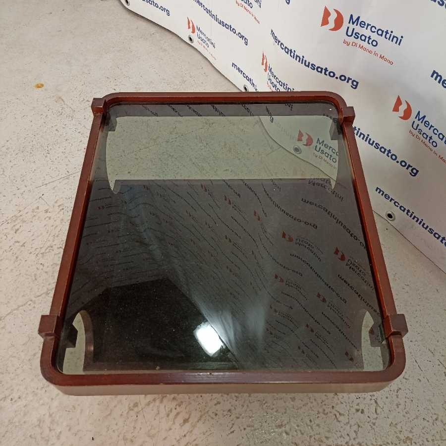 Tavolino da salotto in Teak anni 70. Piano in vetro fumé. Su rotelle. In buone condizioni.