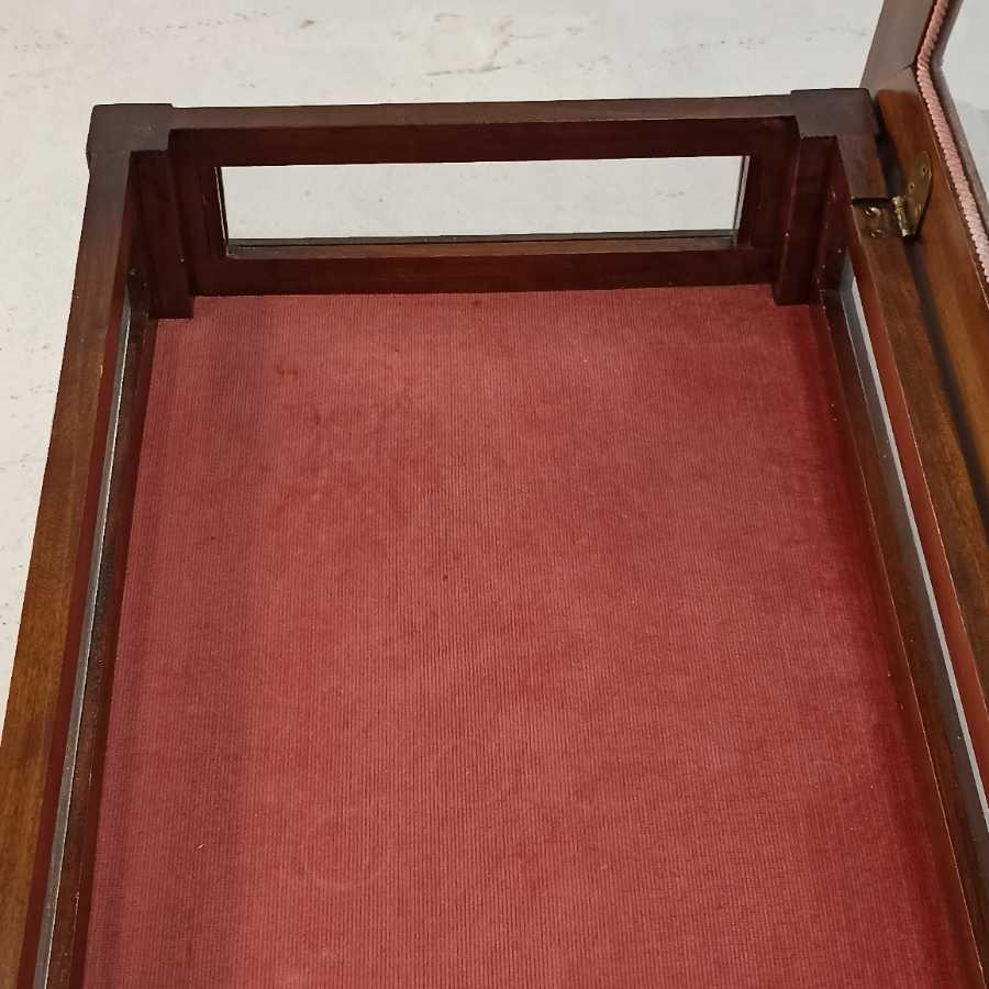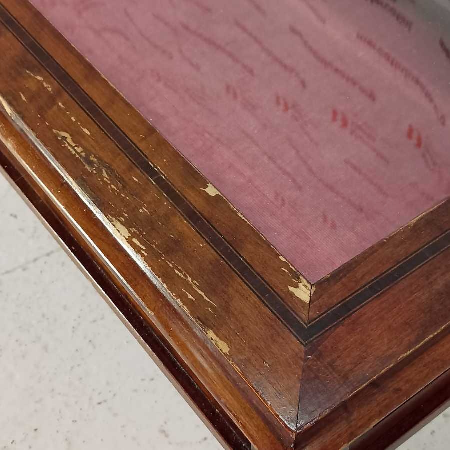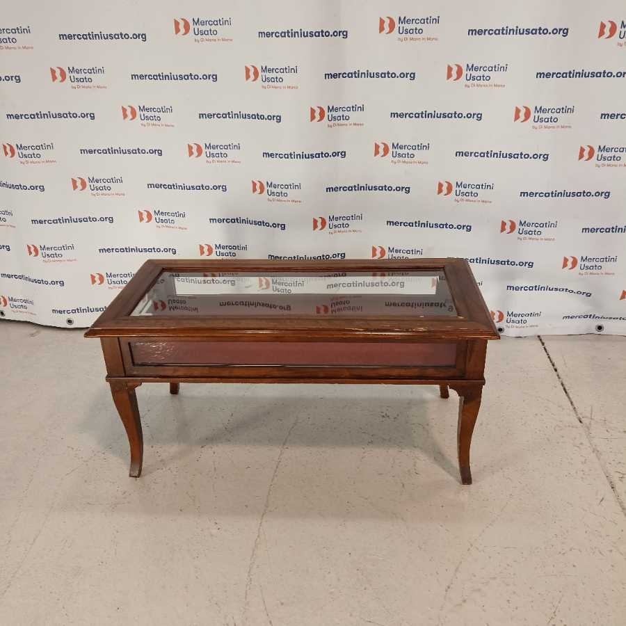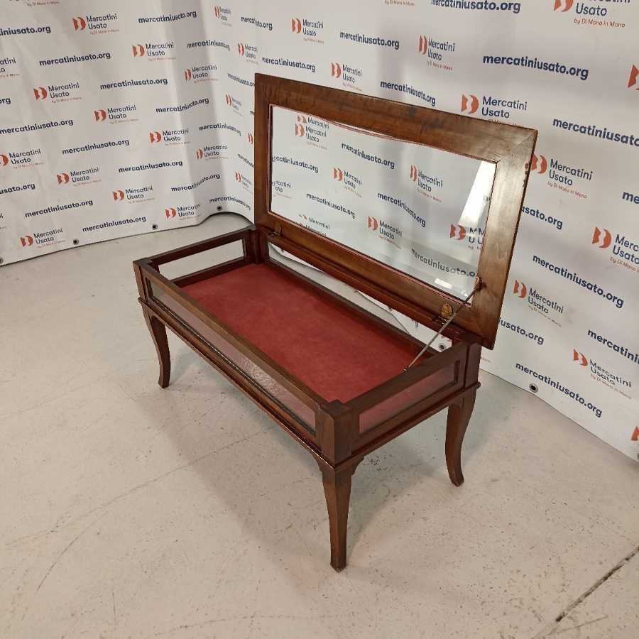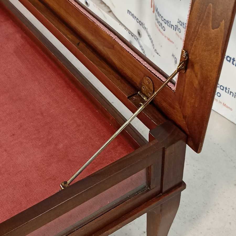 Tavolino espositore in vetro stile classico. Struttura in legno intarsiato con vetri sui 4 lati e sul piano. Richiede piccoli interventi di restauro.