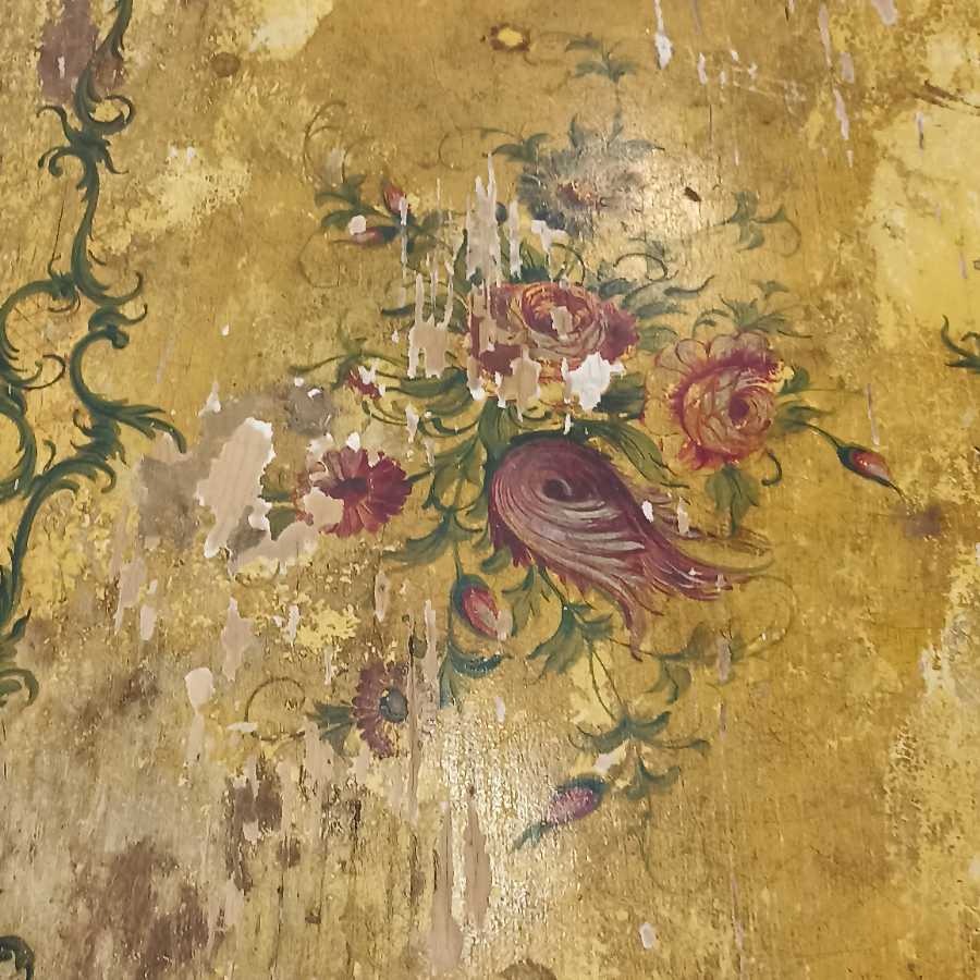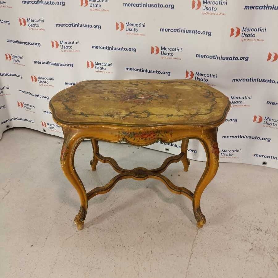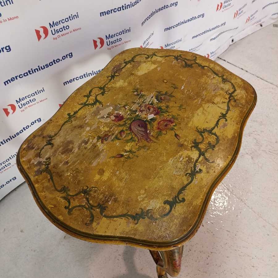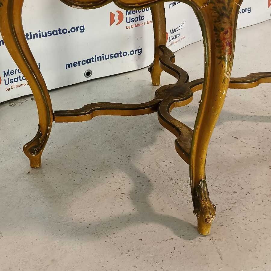 Tavolino Laccato stile Barocco. Struttura in legno intagliato con decori a tema floreale. Richiede restauri.