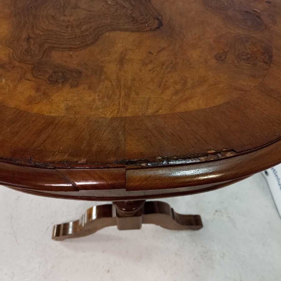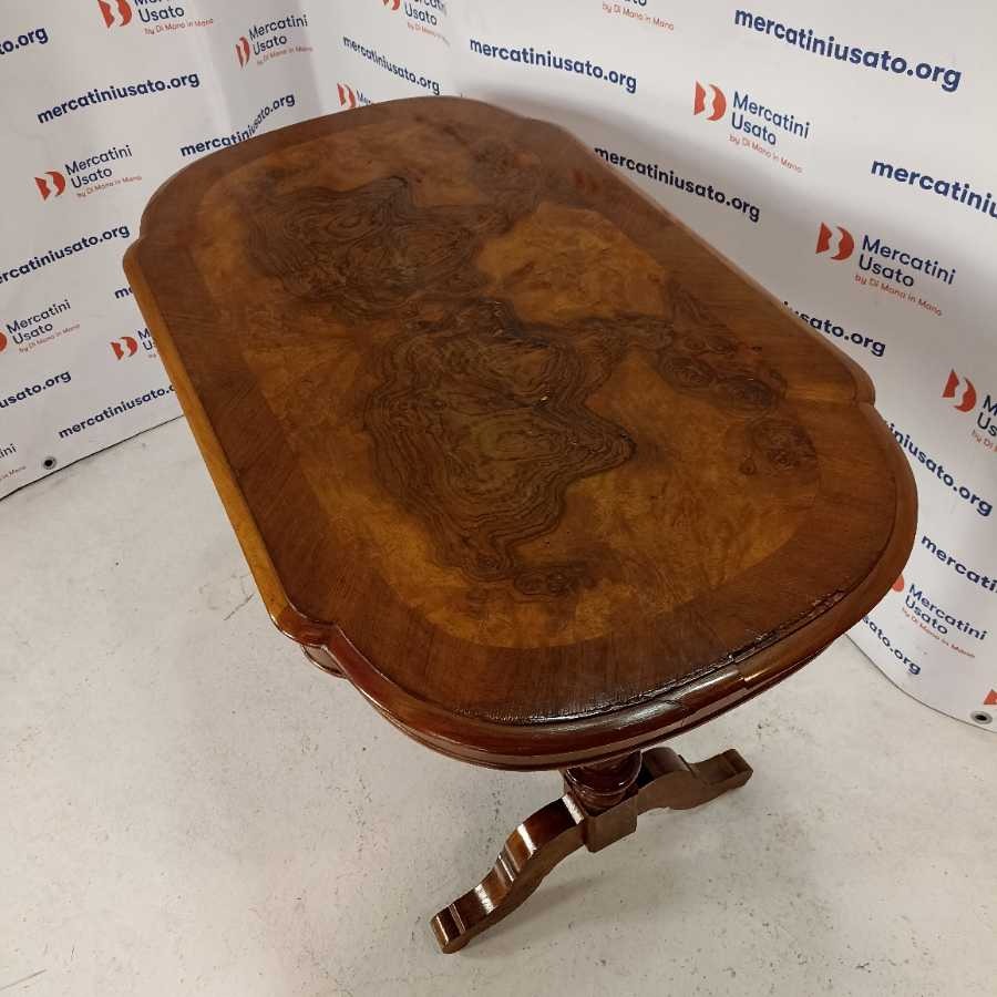 Tavolo a biscotto di inizio 900. Struttura in legno intagliato con piano in radica. Richiede interventi di restauro.