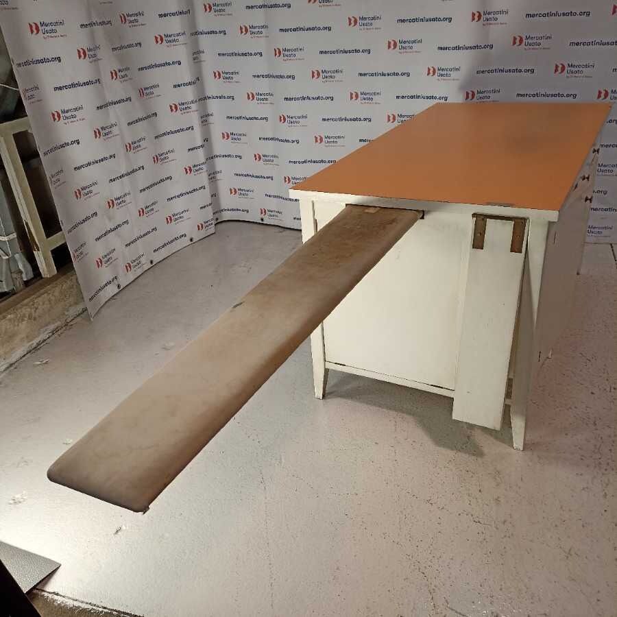 Tavolo da Lavanderia Vintage. Struttura in legno impiallacciato con piano in formica. Presenta cestone porta biancheria, piano estraibile da stiro e vani vari. Richiede restauri.