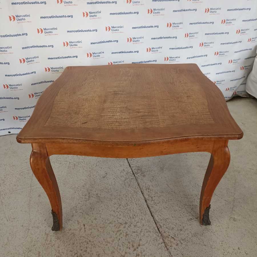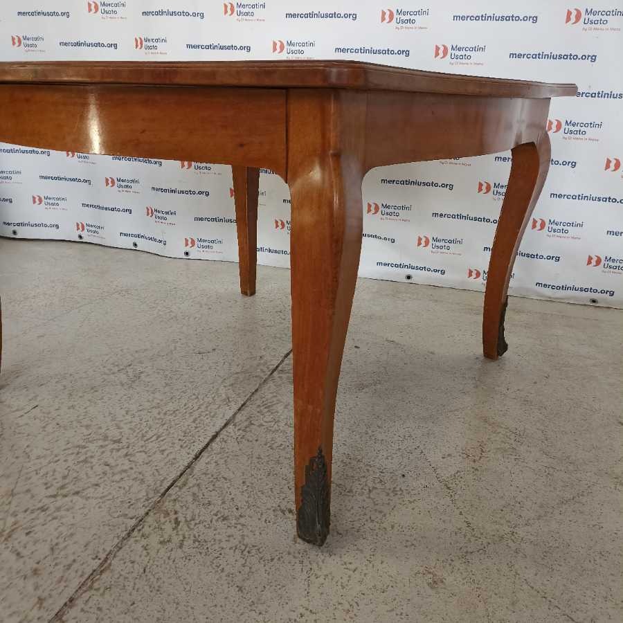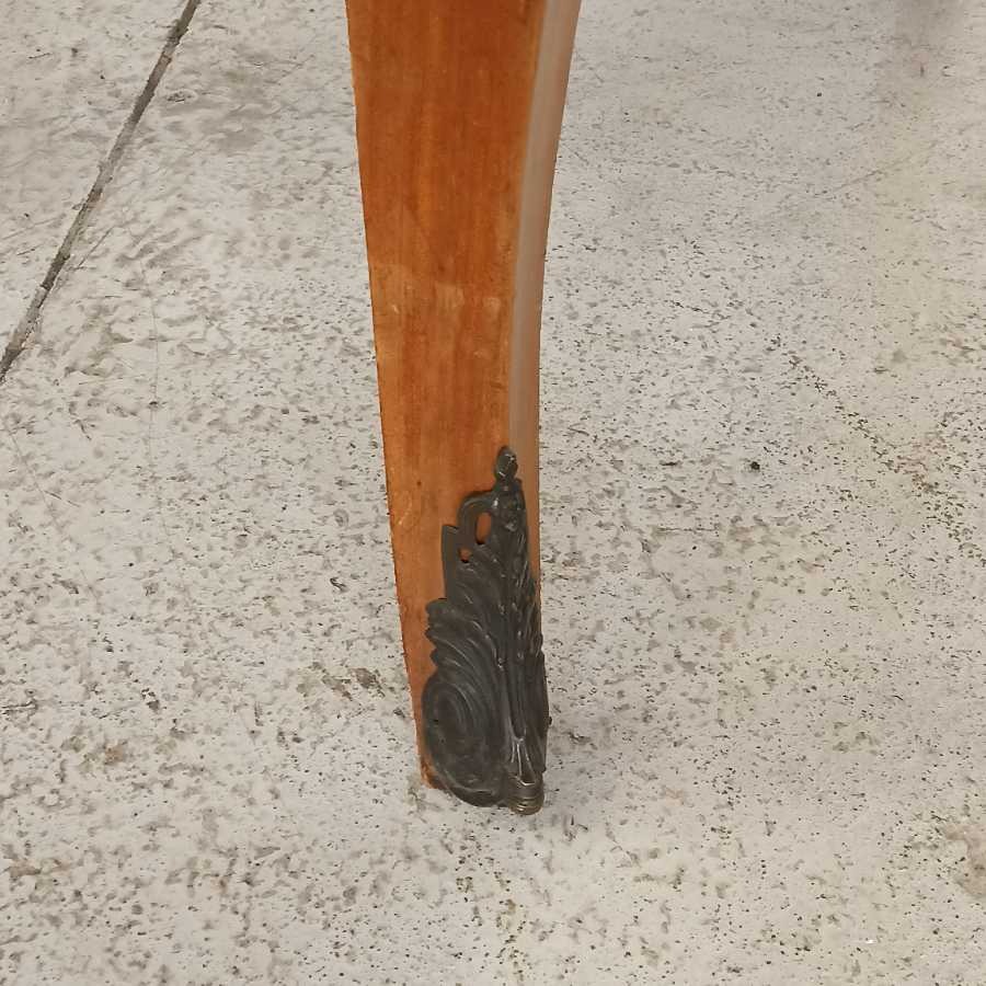 Tavolo in stile Luigi XV metà 900. Struttura in legno con piano in Radica e inserti in bronzo. Richiede restauri.