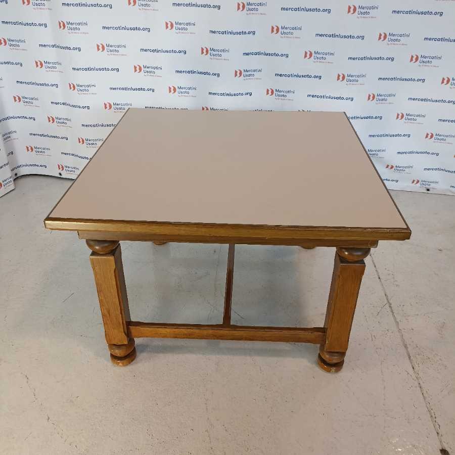 Tavolo quadrato in stile. Struttura in legno intagliato con piano in formica. Richiede piccoli interventi di restauro.