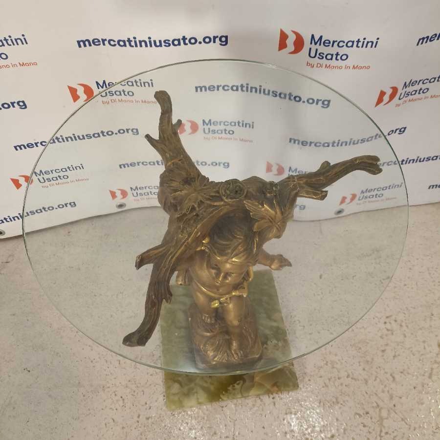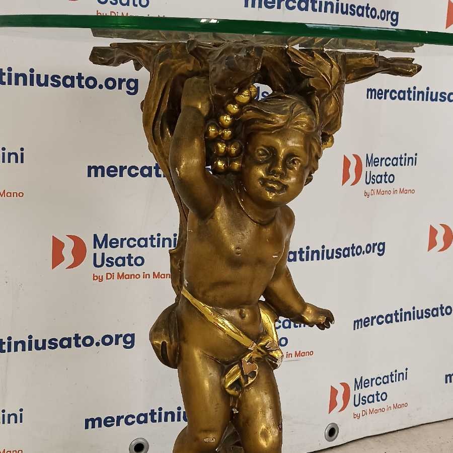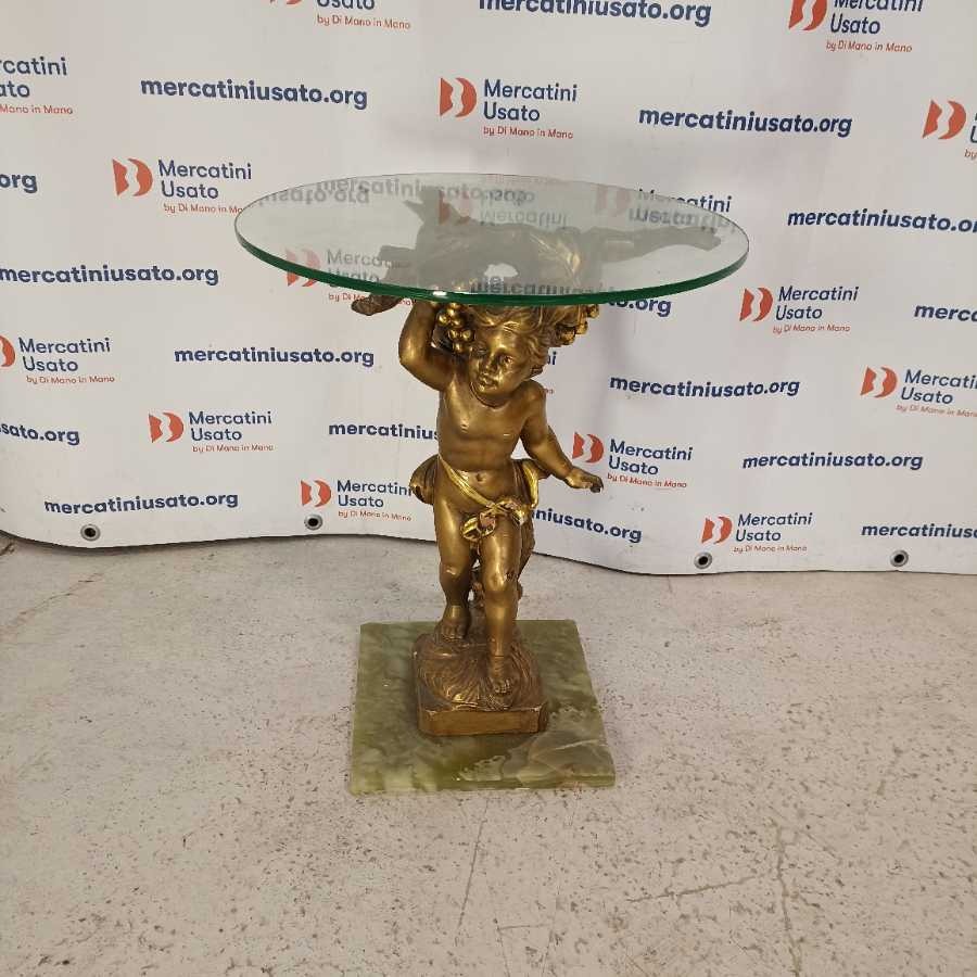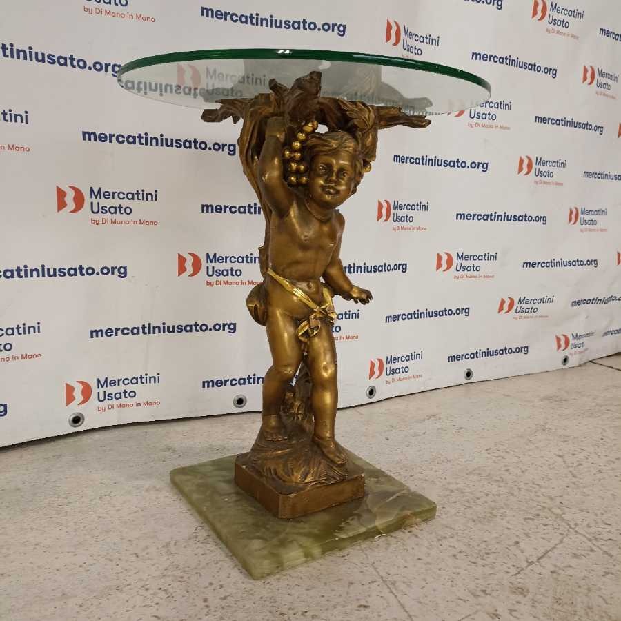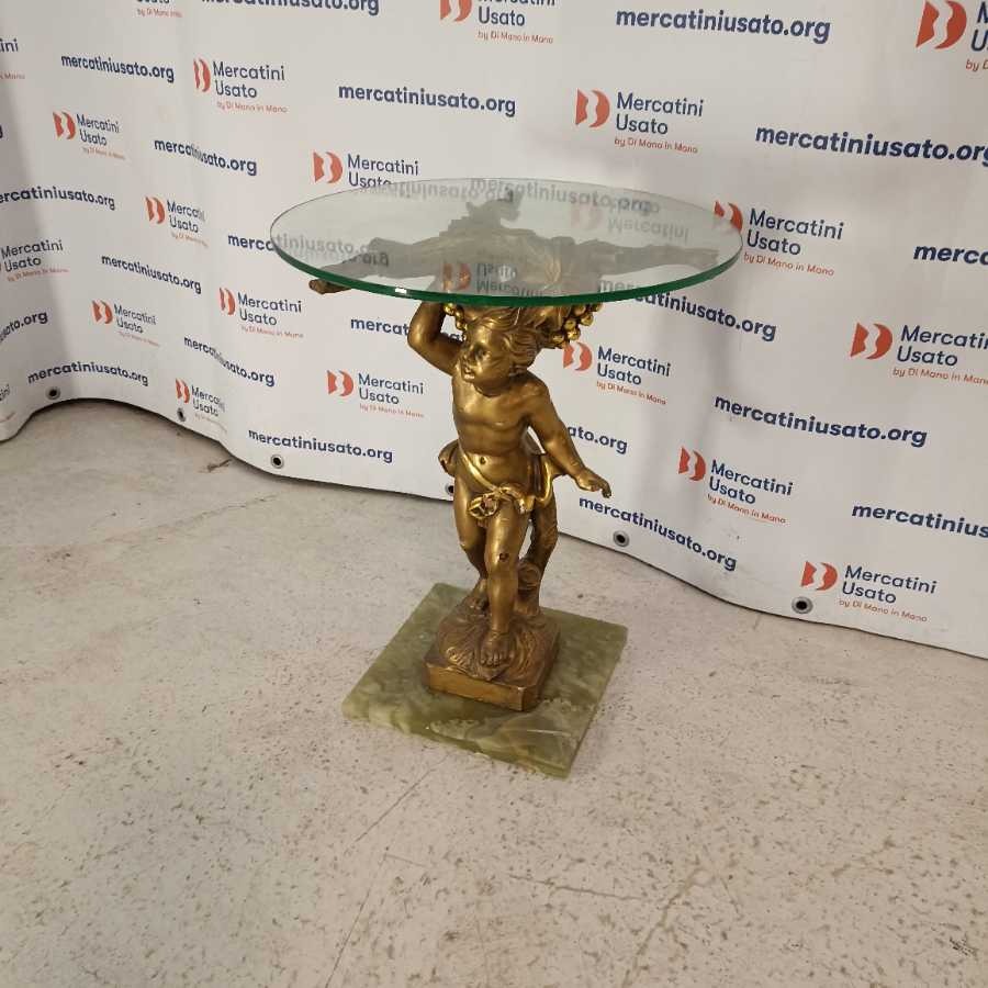 Tavolino Barocco con putto Dorato. Base in onice, putto in legno intagliato e laccato oro, piano in vetro. Presenta piccoli segni di usura.