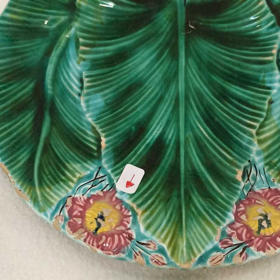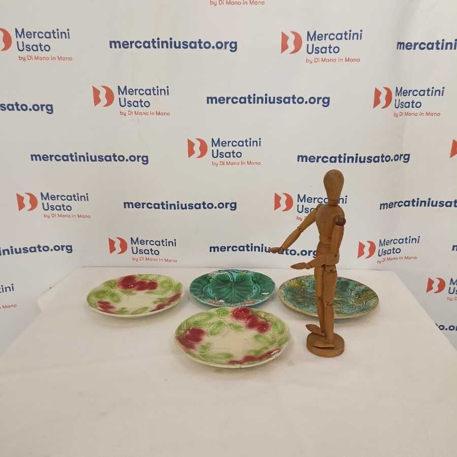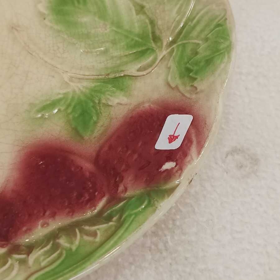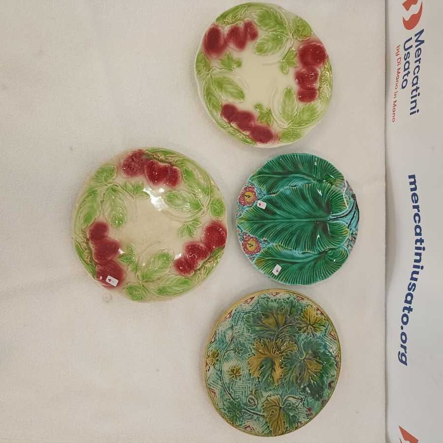 4 Piatti Barbotine di fine 800. In maiolica con fragole, fiori e foglie di vite.