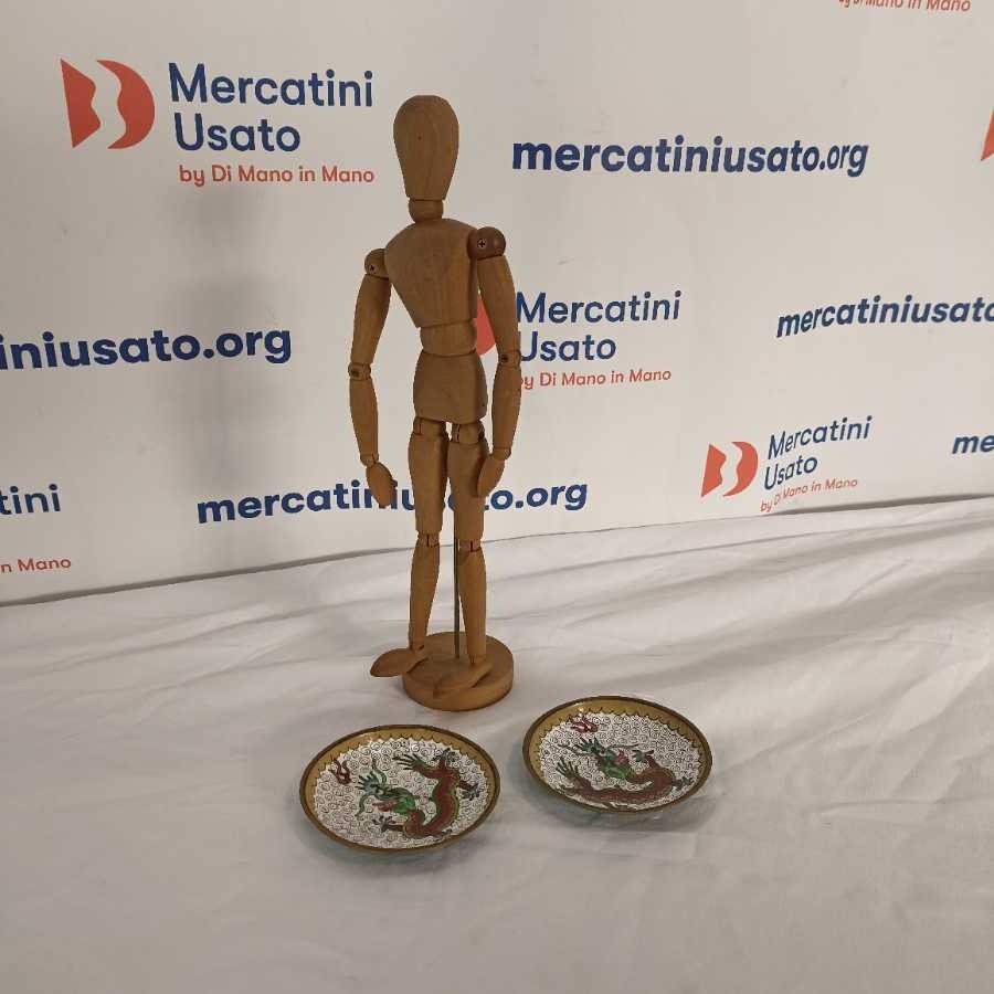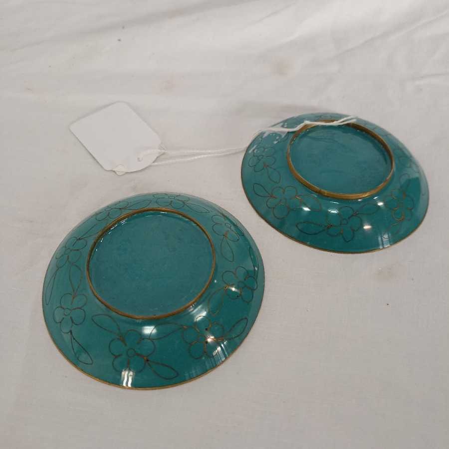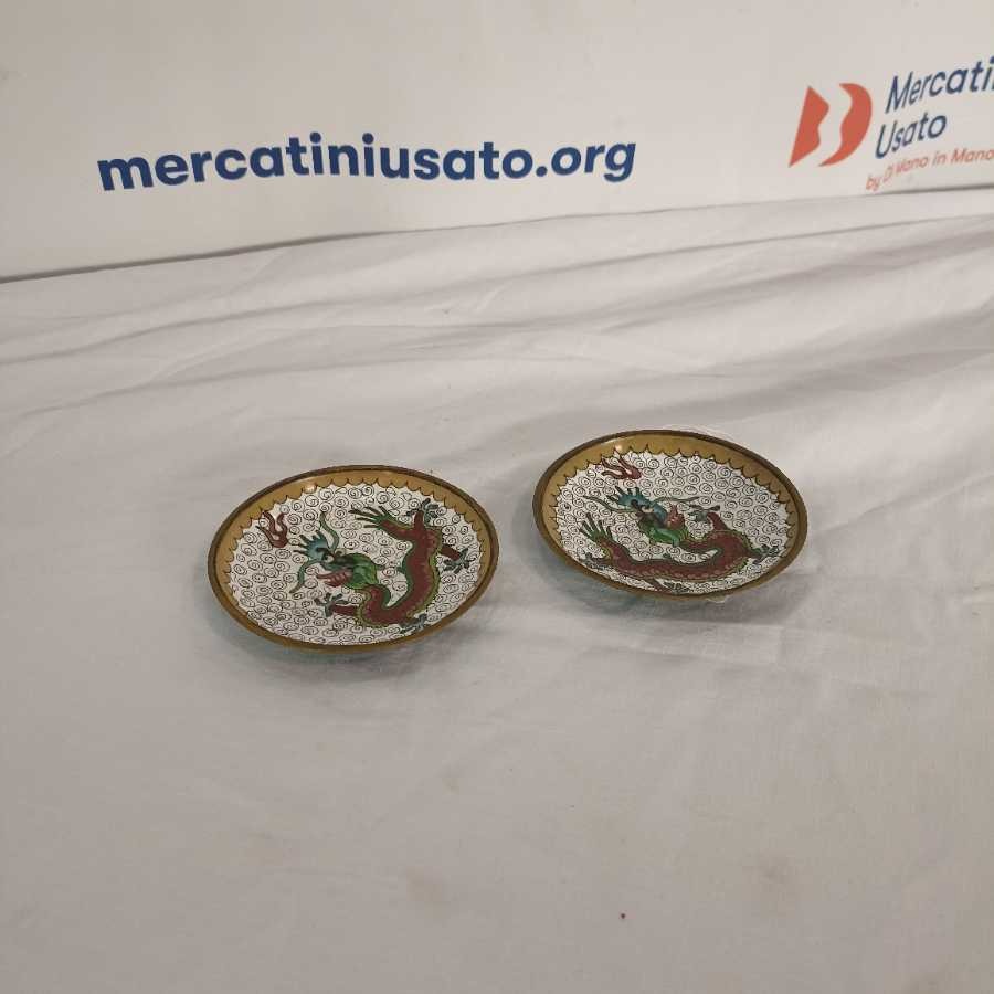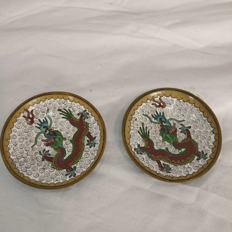 Coppia di piattini Cloisonnè con figura di draghi orientali e spirali, retro color turchese con decori floreali.