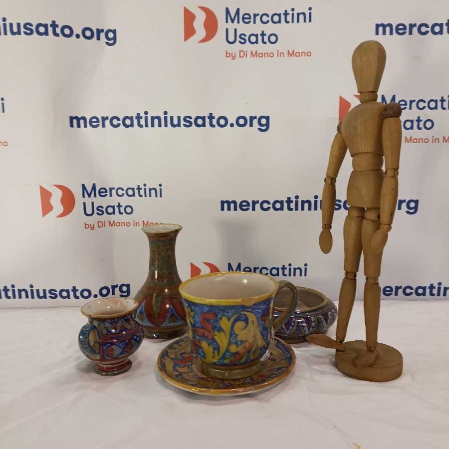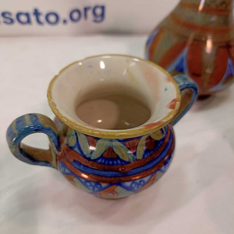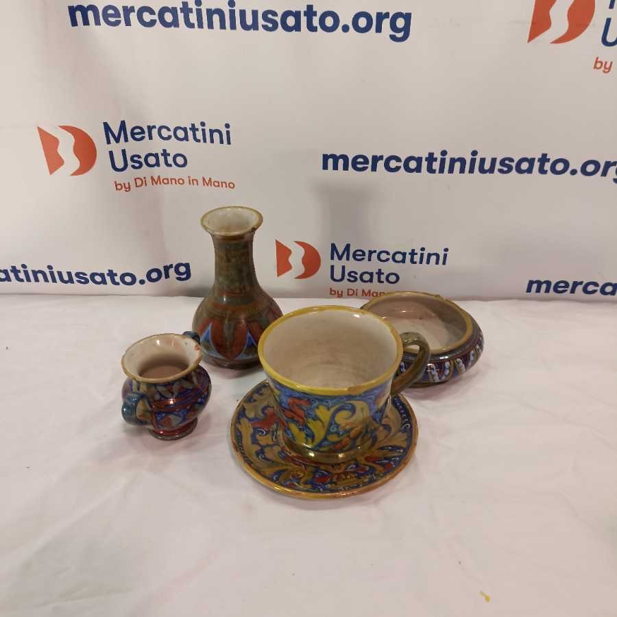 Tazza con piatto, ciotola, vasetto e una piccola anfora.