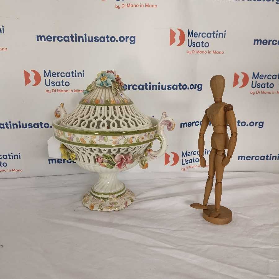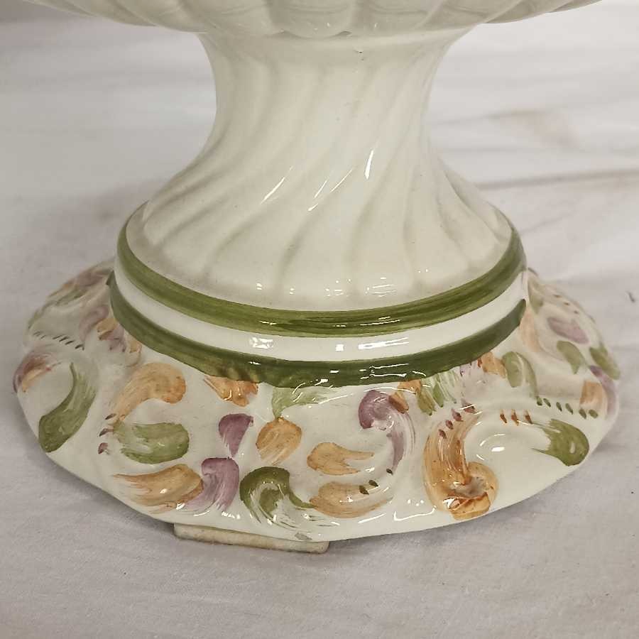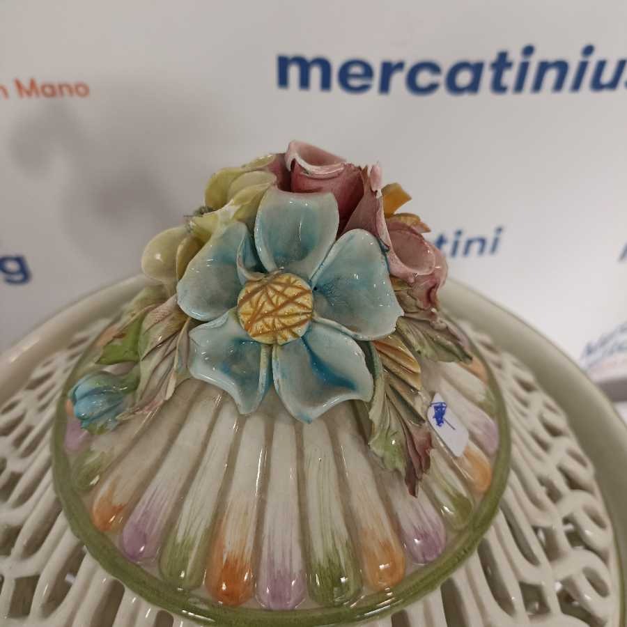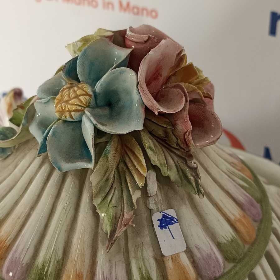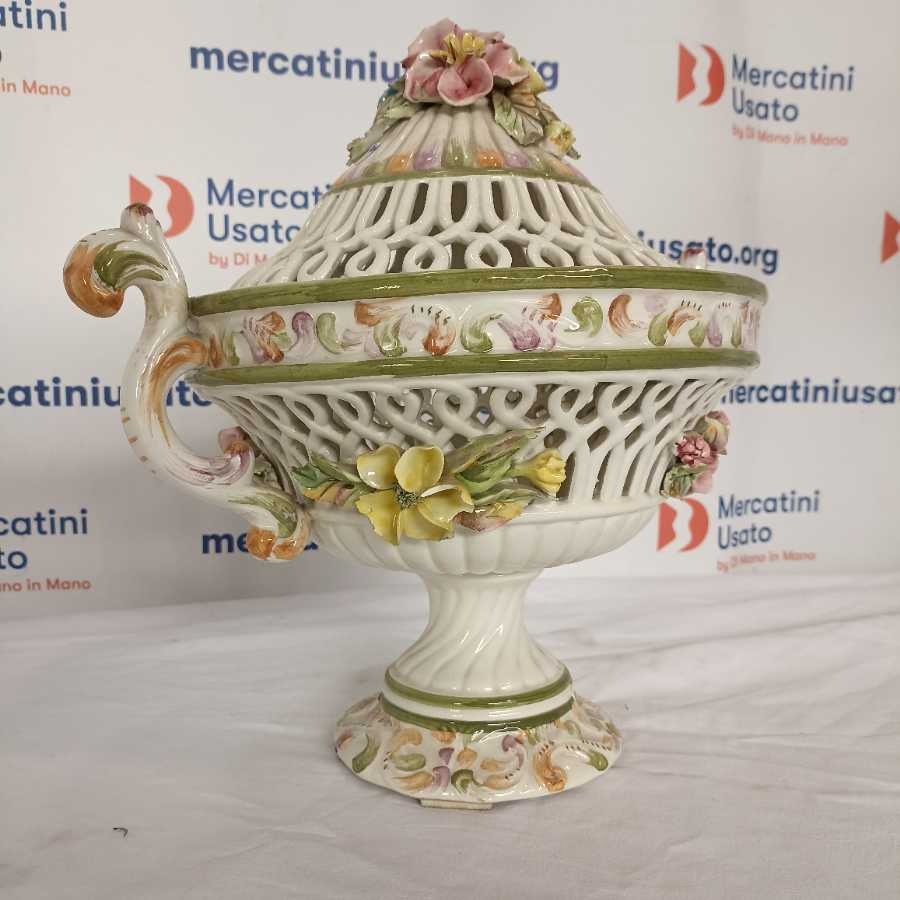 Potiche Biansata con decoro di fiori Bassano. Coperchio traforato, base con applicazioni di fiori, coppia di manici a ricciolo tipico dei decori di Bassano.