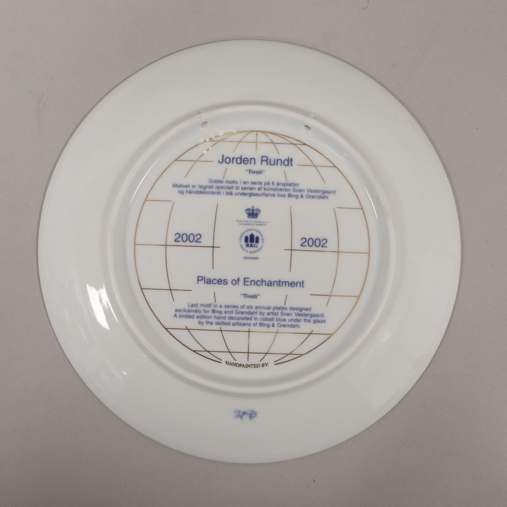 A garanzia di autenticità il piatto reca il marchio della Bing & Grøndahl con le tre torri, ispirato allo stemma della città di Copenhagen, e le iniziali del pittore che ha realizzato l’illustrazione unica del piatto.
