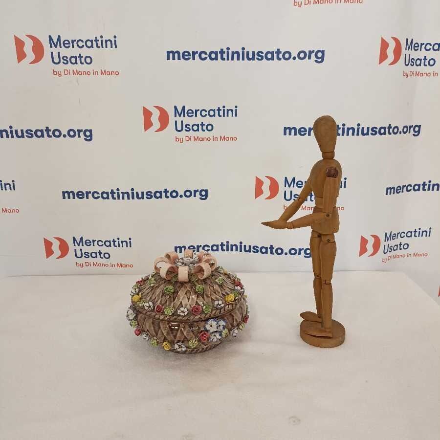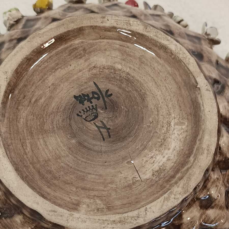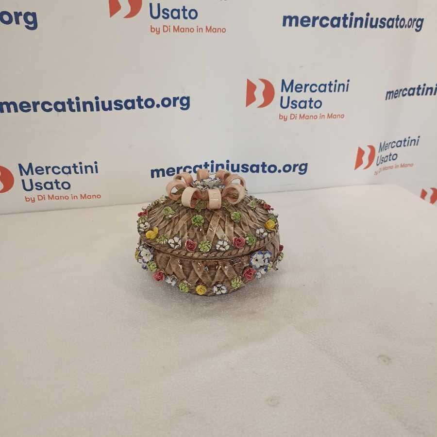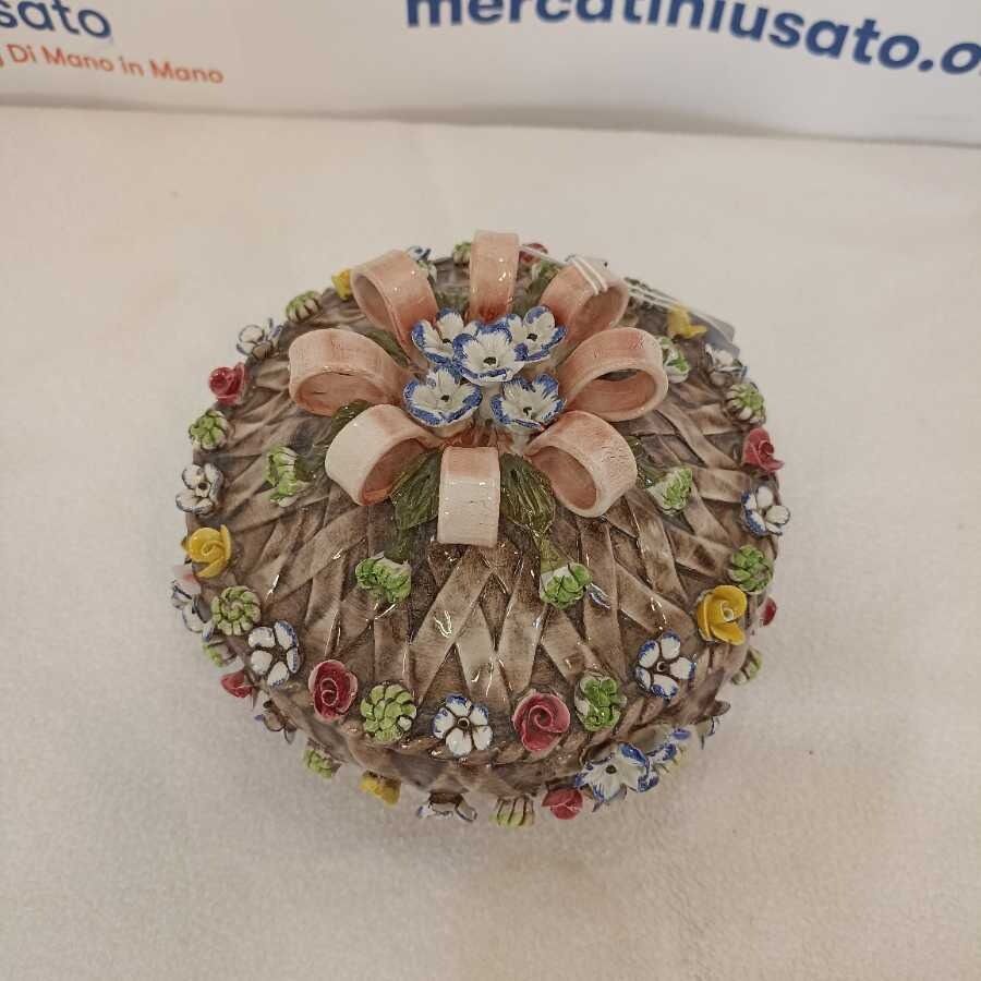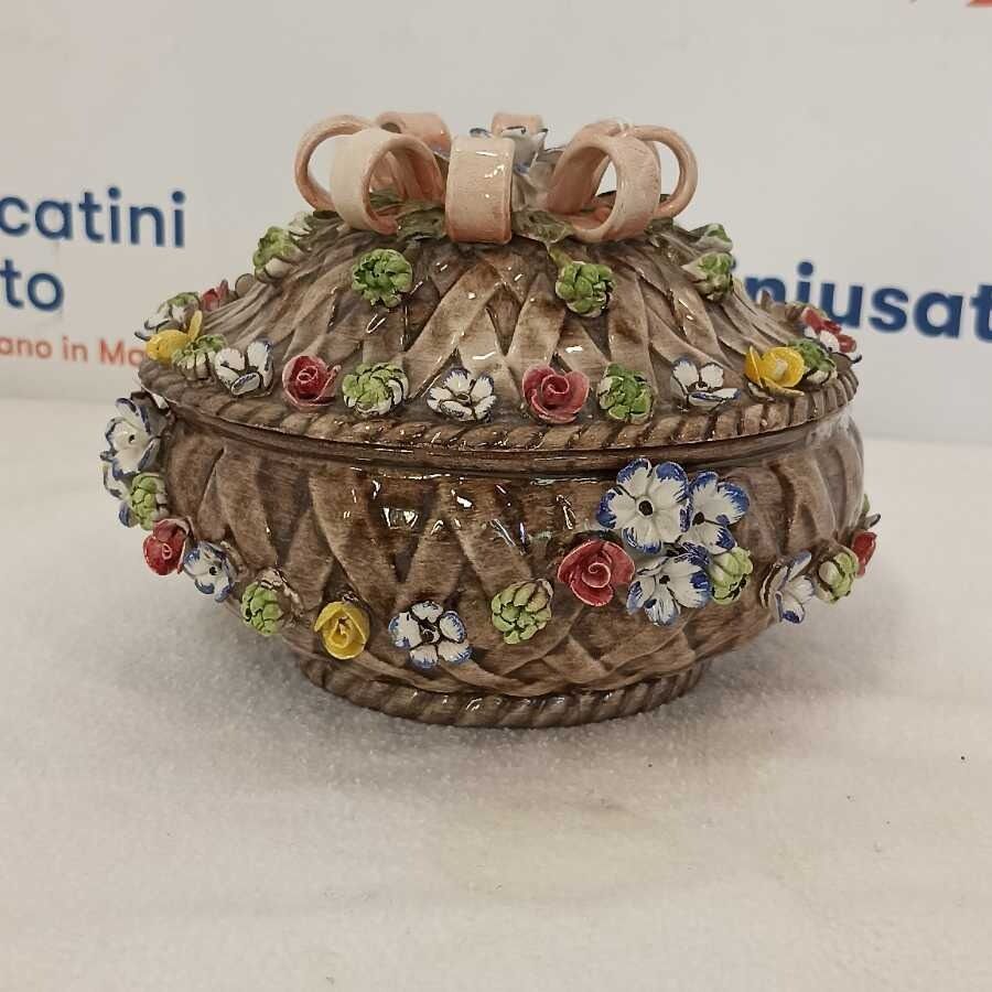 Scatola portabiscotti in ceramica di Capodimonte. Lavorazione ad effetto cesto con applicazioni di fiori multicolori. La presa è un grande fiocco rosa applicato con fiori blu e bianchi. Marchio sul fondo.