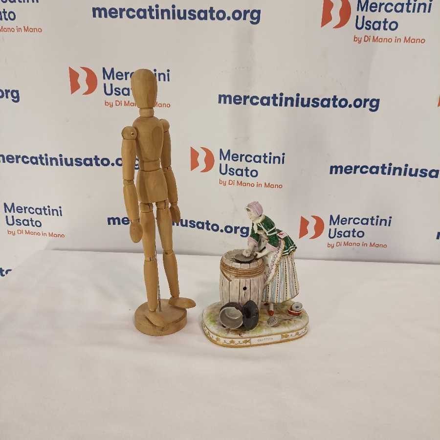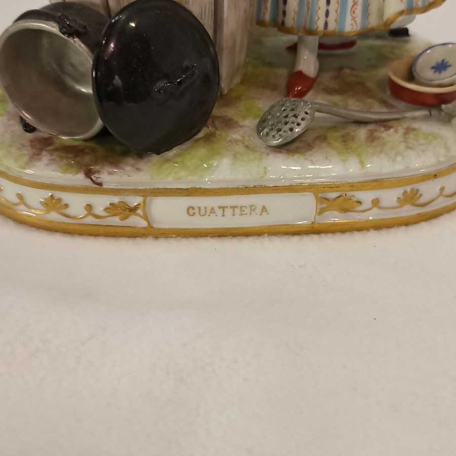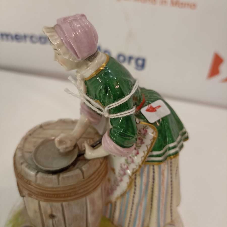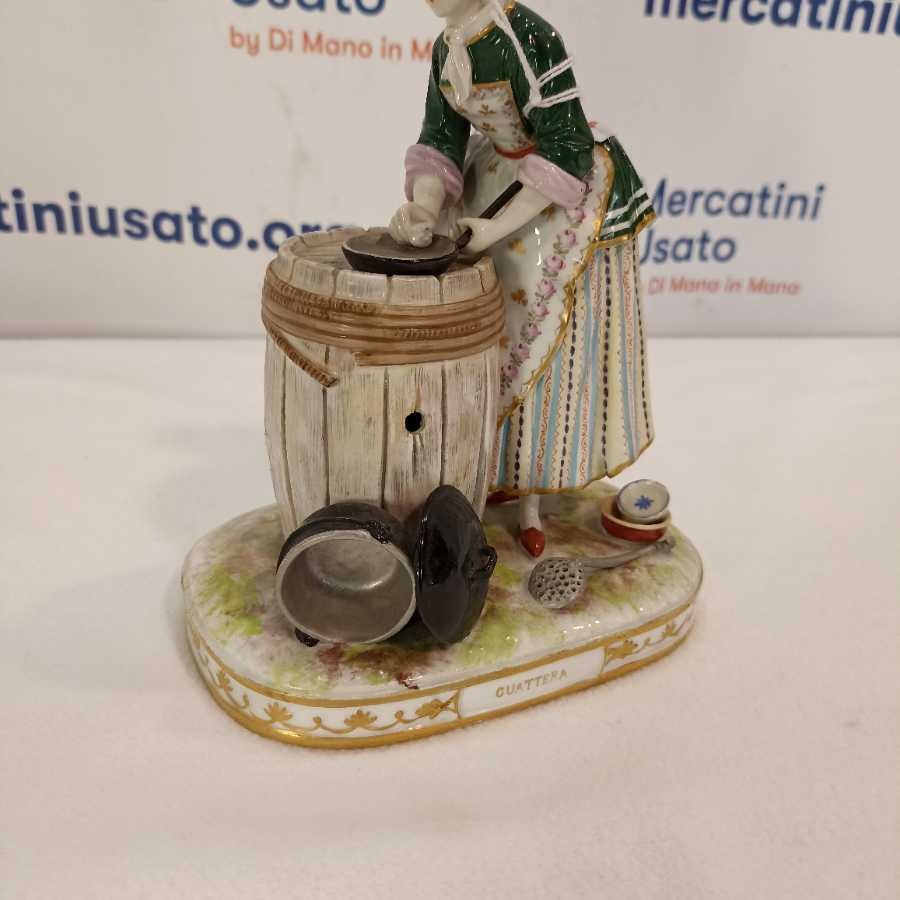 Figurina Di Donna In Porcellana Nell Atto Di Lavare Le Pentole Su Una Botte Di Legno. Marchio Manifattura Di Venezia “Cozzi” A Tergo. Titolo ” Guattera”
