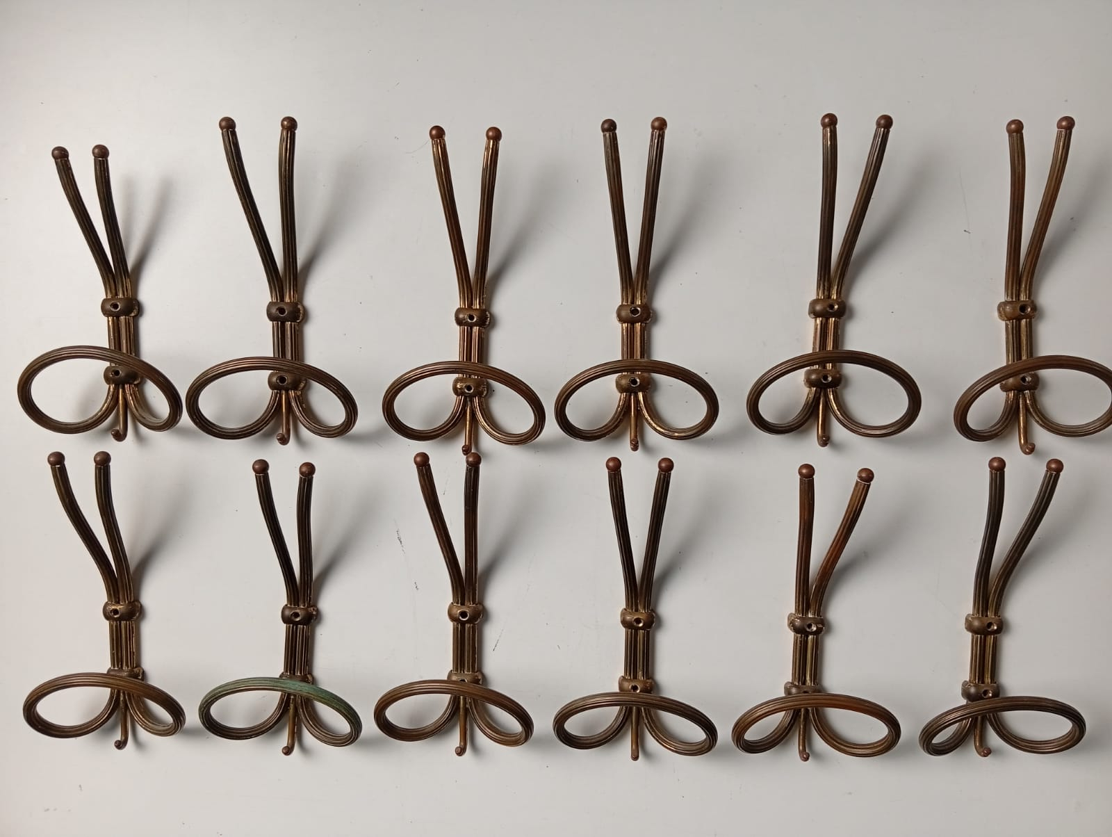 Gruppo di 12 Appendiabiti da parete in metallo ottonato ricurvo a formare un anello