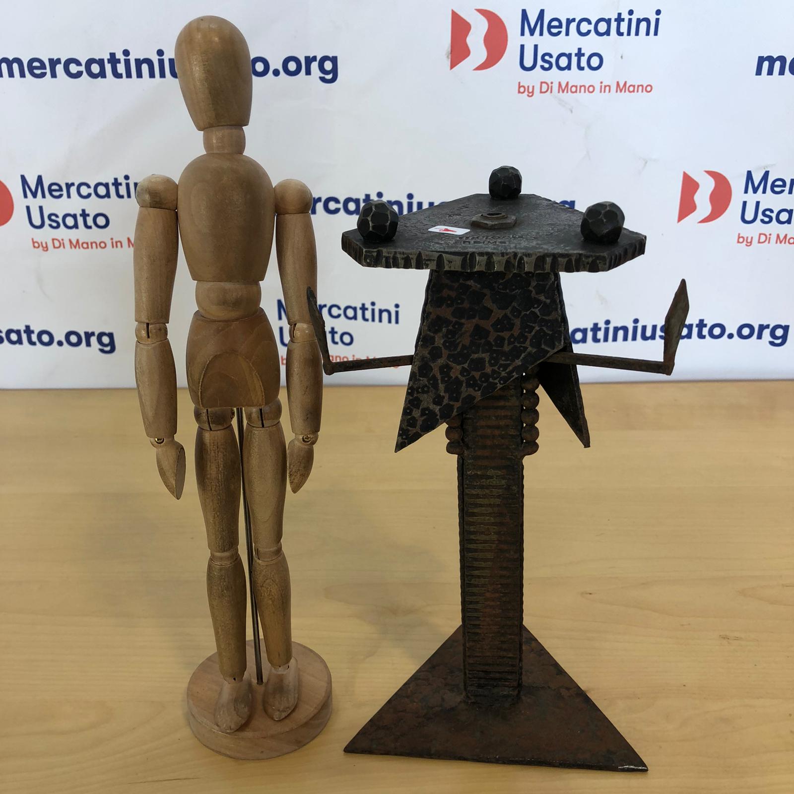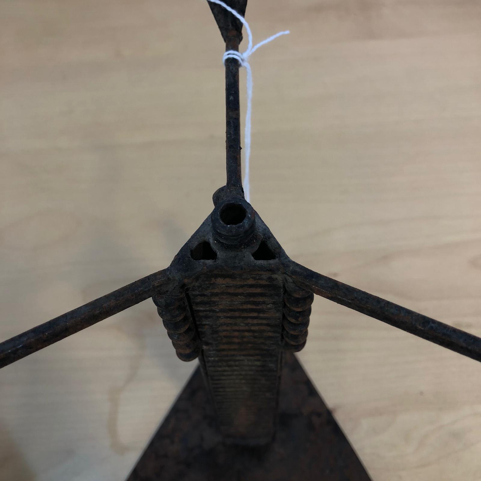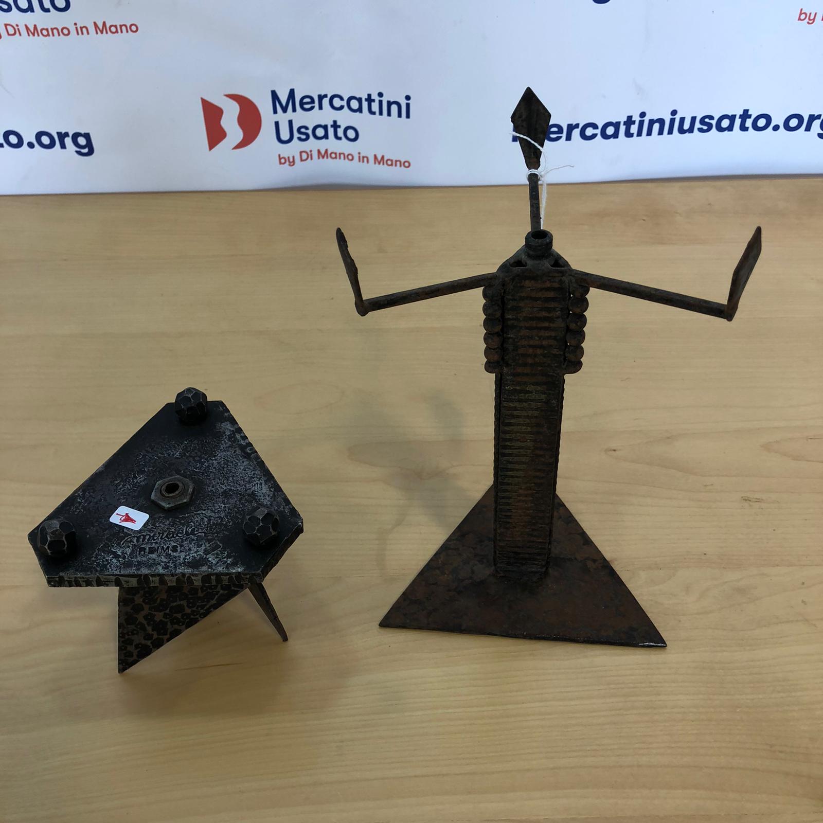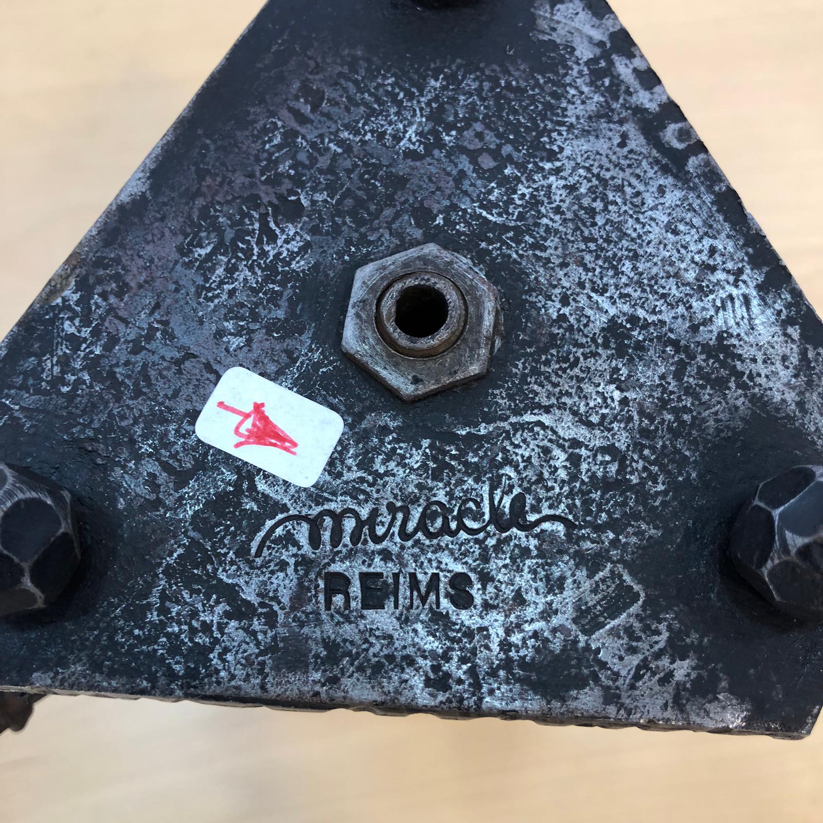 Abat Jour stile Brutalista Miracle Reims in ferro battuto. L’oggetto è un’insieme di triangoli uniti da una colonna. Lavite centrale è spezzata, occorre saldatura per unire la base al portalampade.