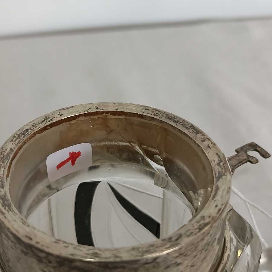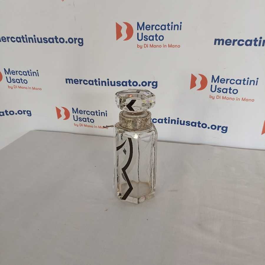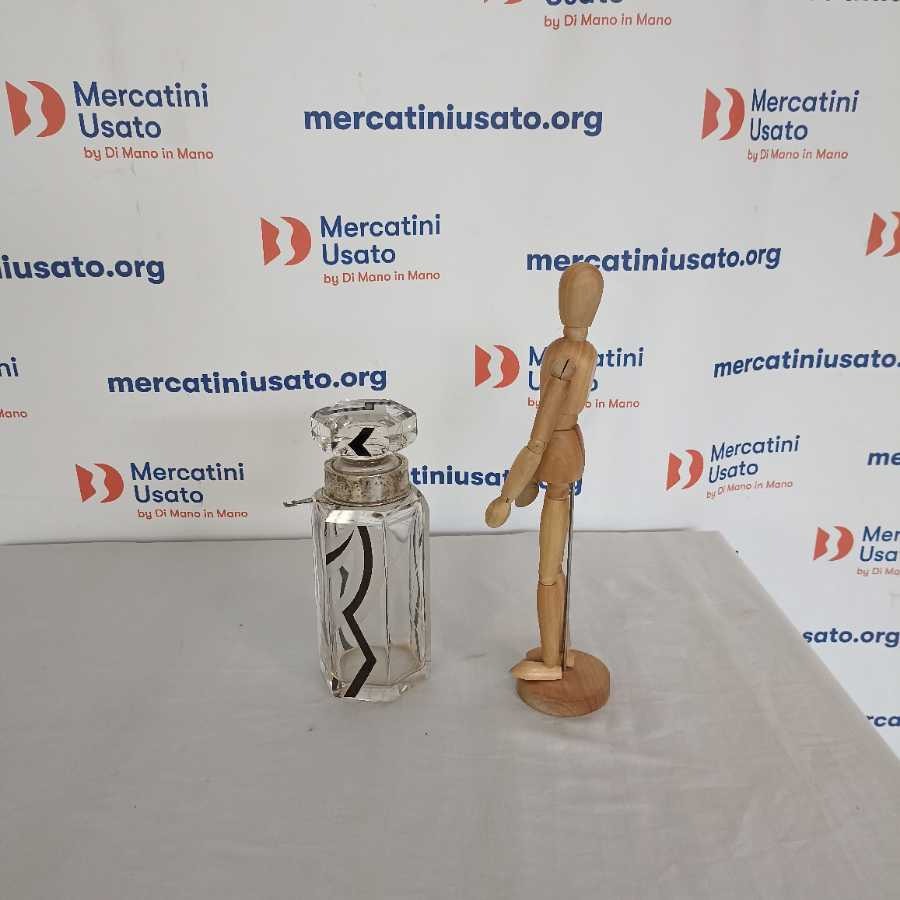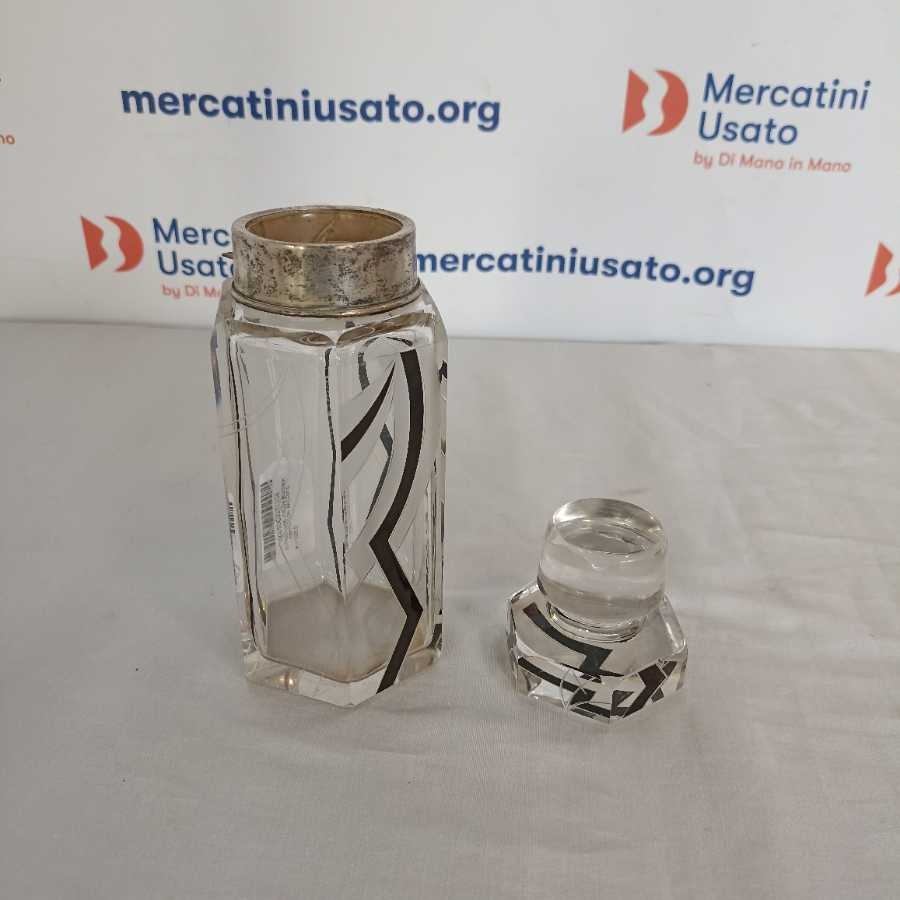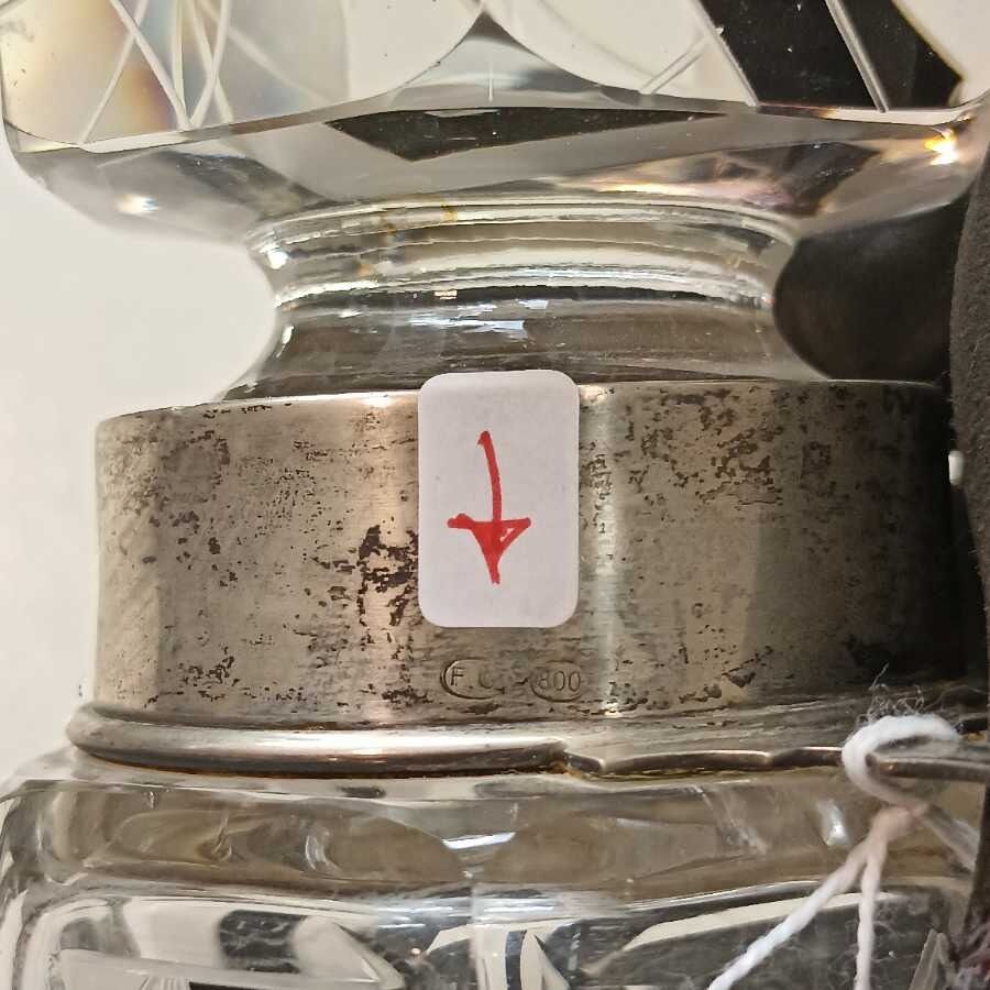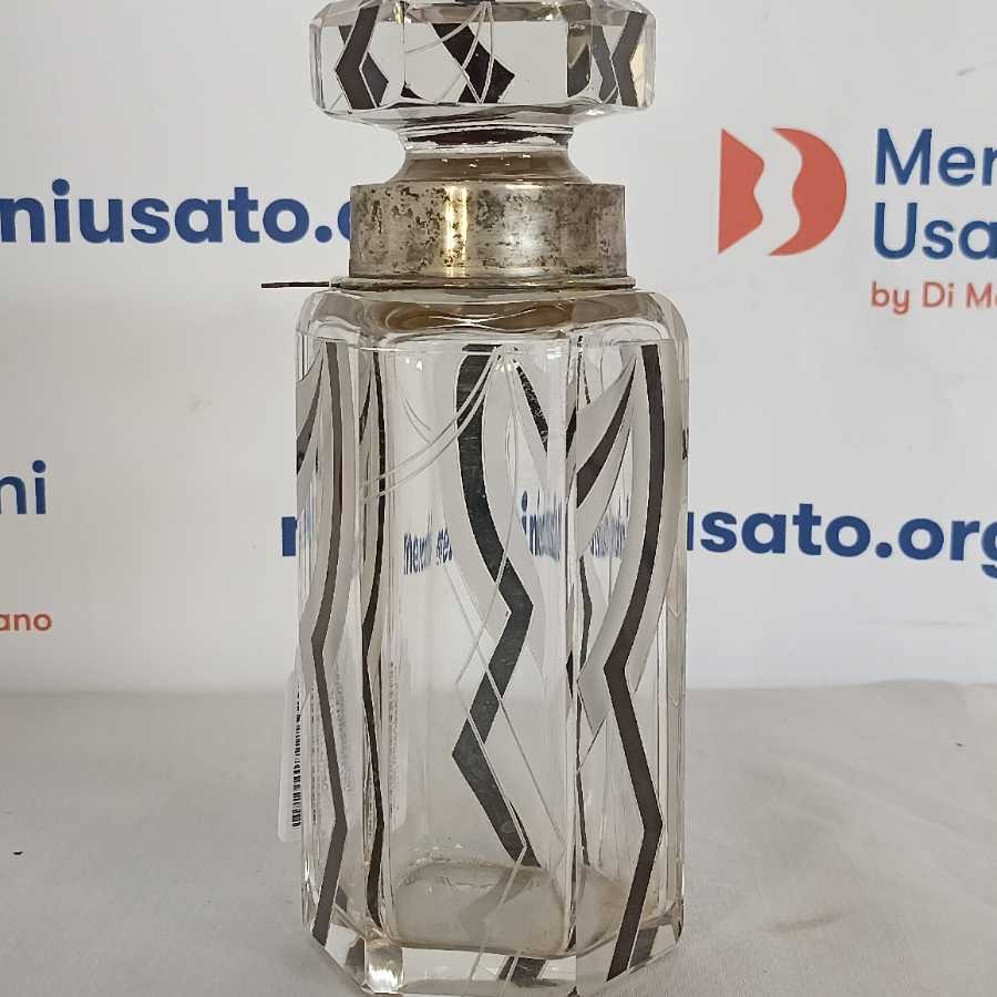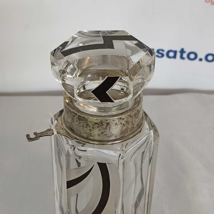 Bottiglia decanter Karl Palda Bohemia. In cristallo con decori geometrici neri e bianchi. Collo in argento 800. Tappo esagonale.