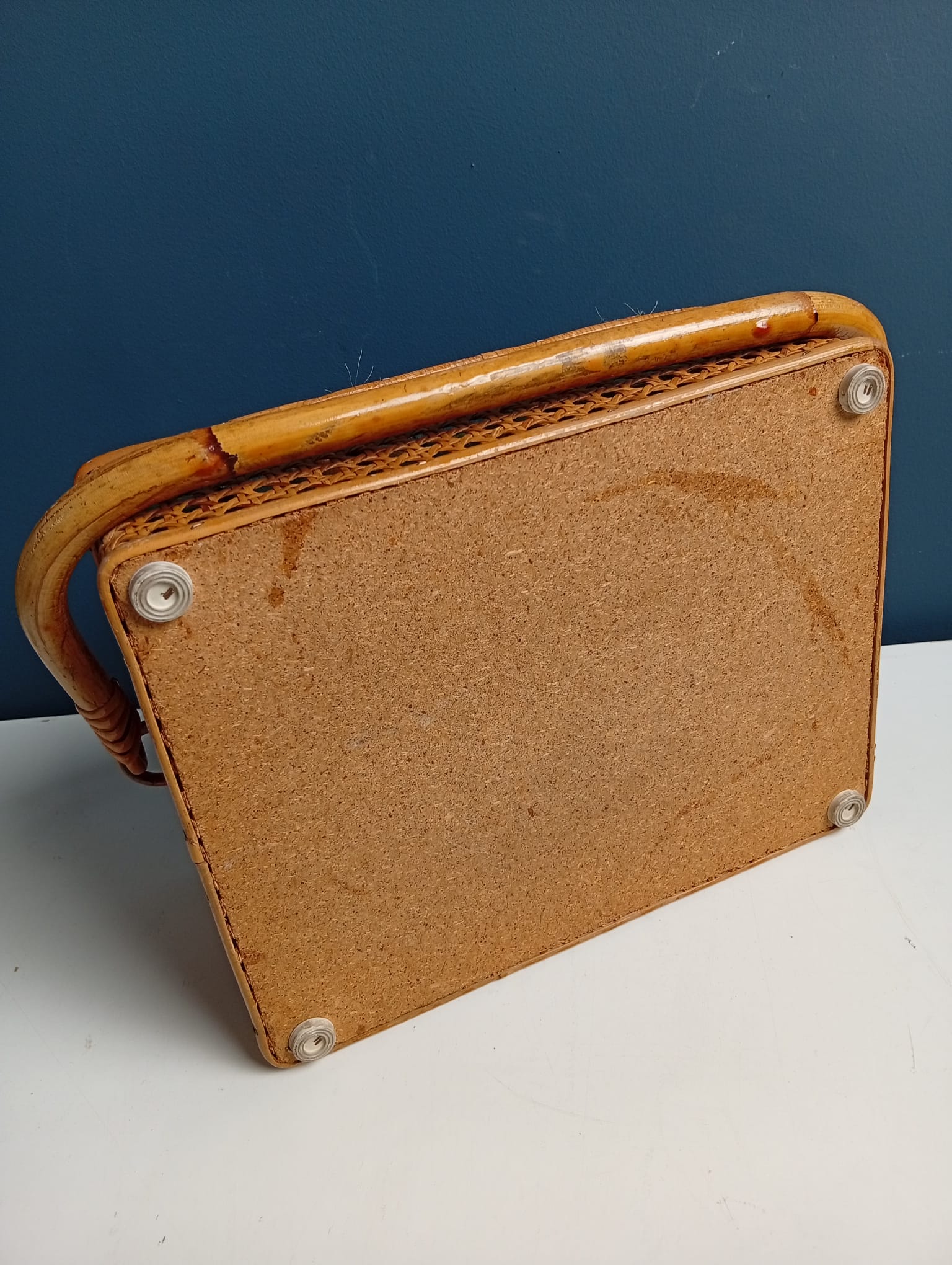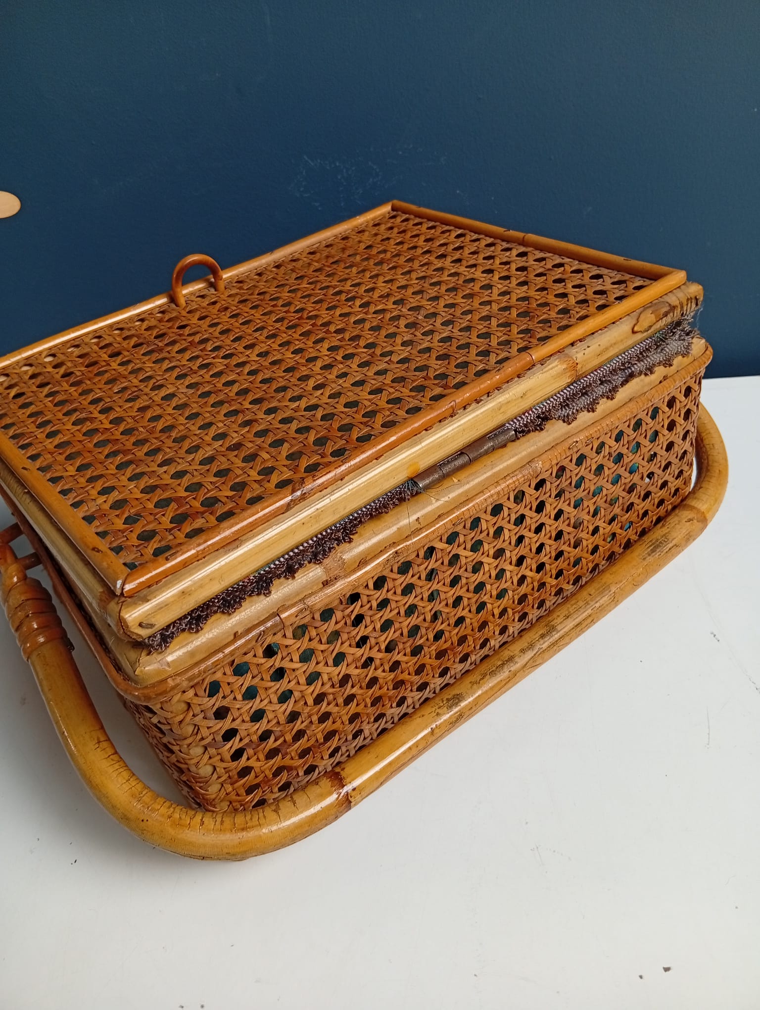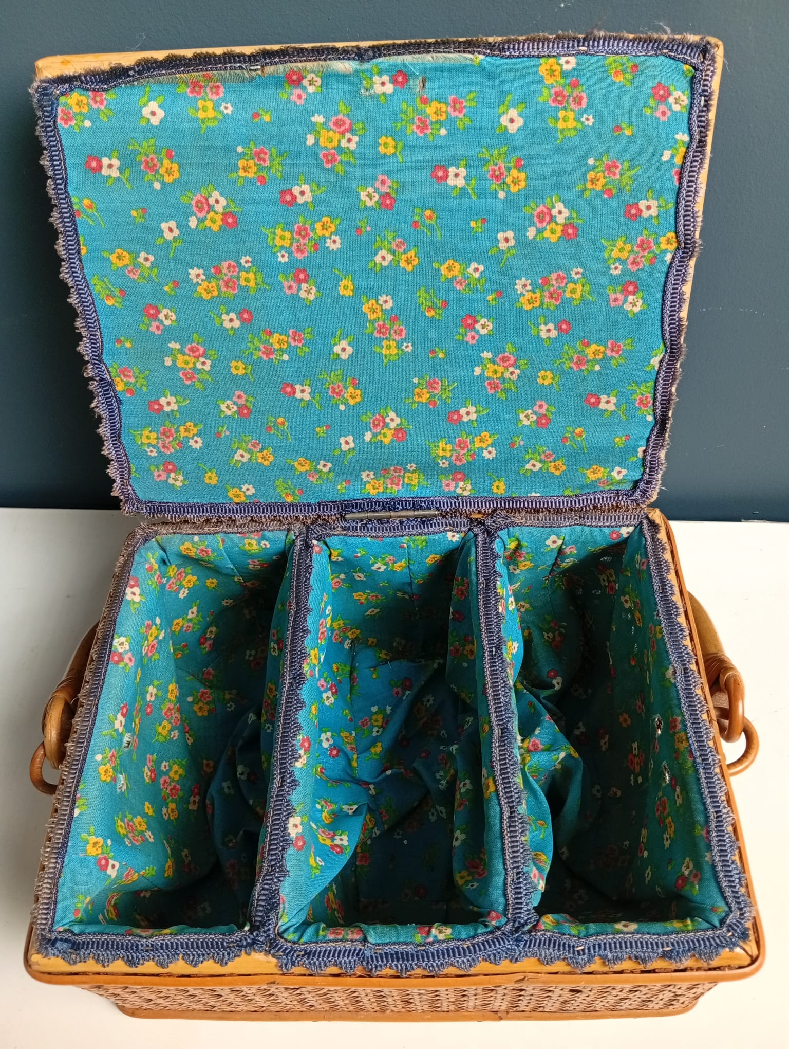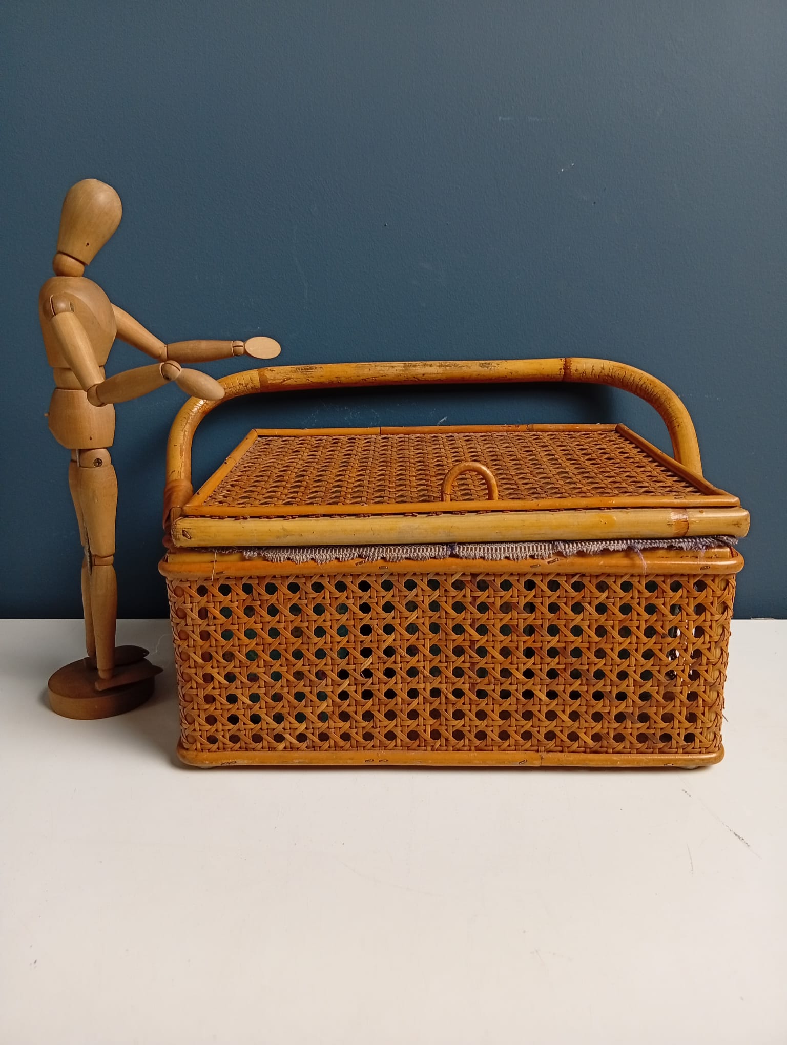 Cestino porta lana Vintage in paglia di Vienna. Rivestito all’interno e diviso in 3 scomparti. Manico e presa per aprire.