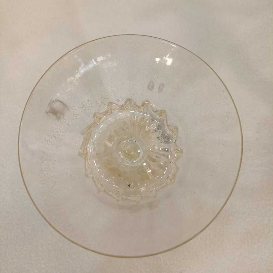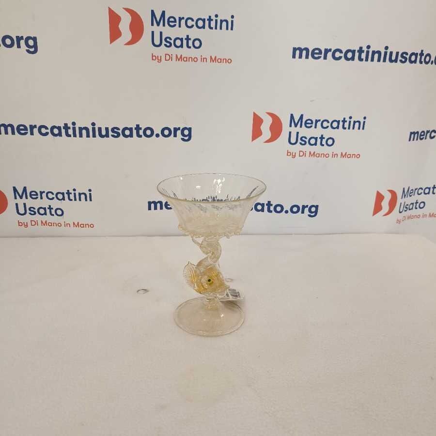 Coppa in vetro di Murano. In vetro soffiato trasparente con inclusioni dorate. Delfino sul gambo.