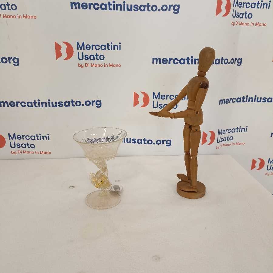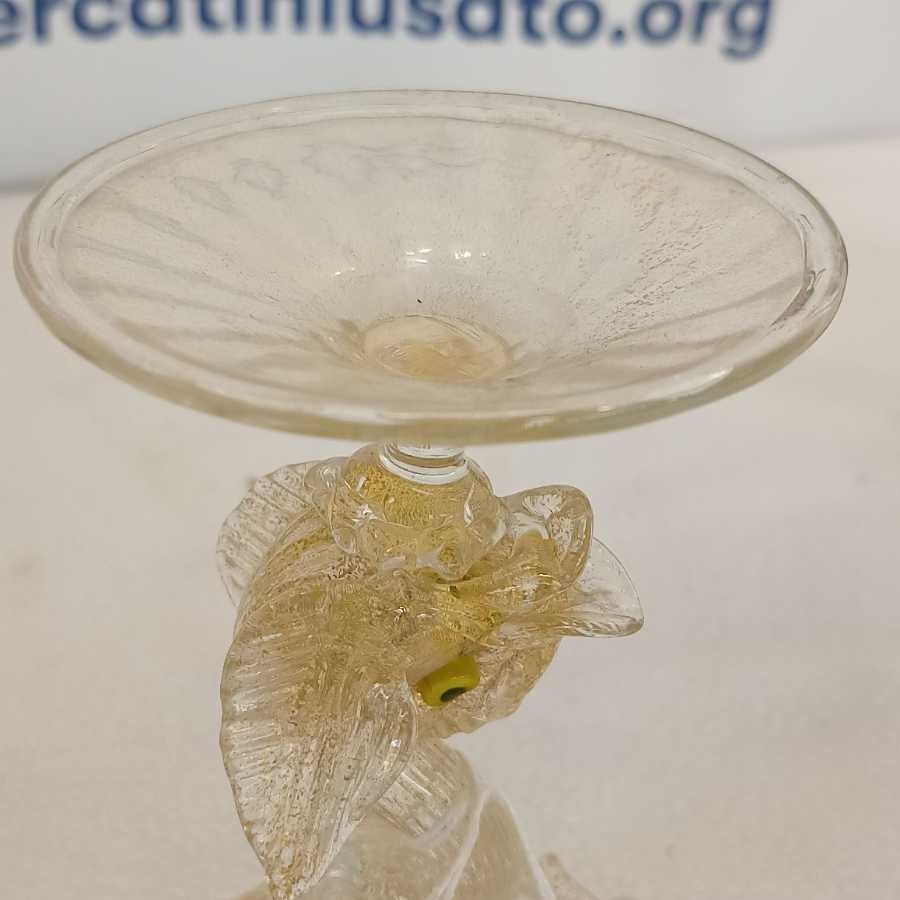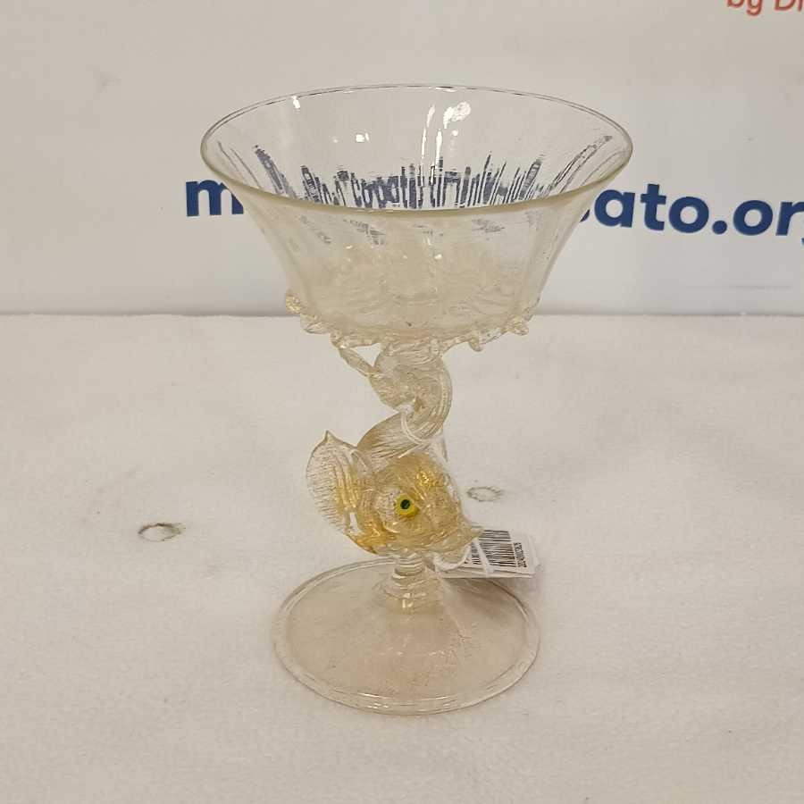 Coppa in vetro di Murano. In vetro soffiato trasparente con inclusioni dorate. Delfino sul gambo.