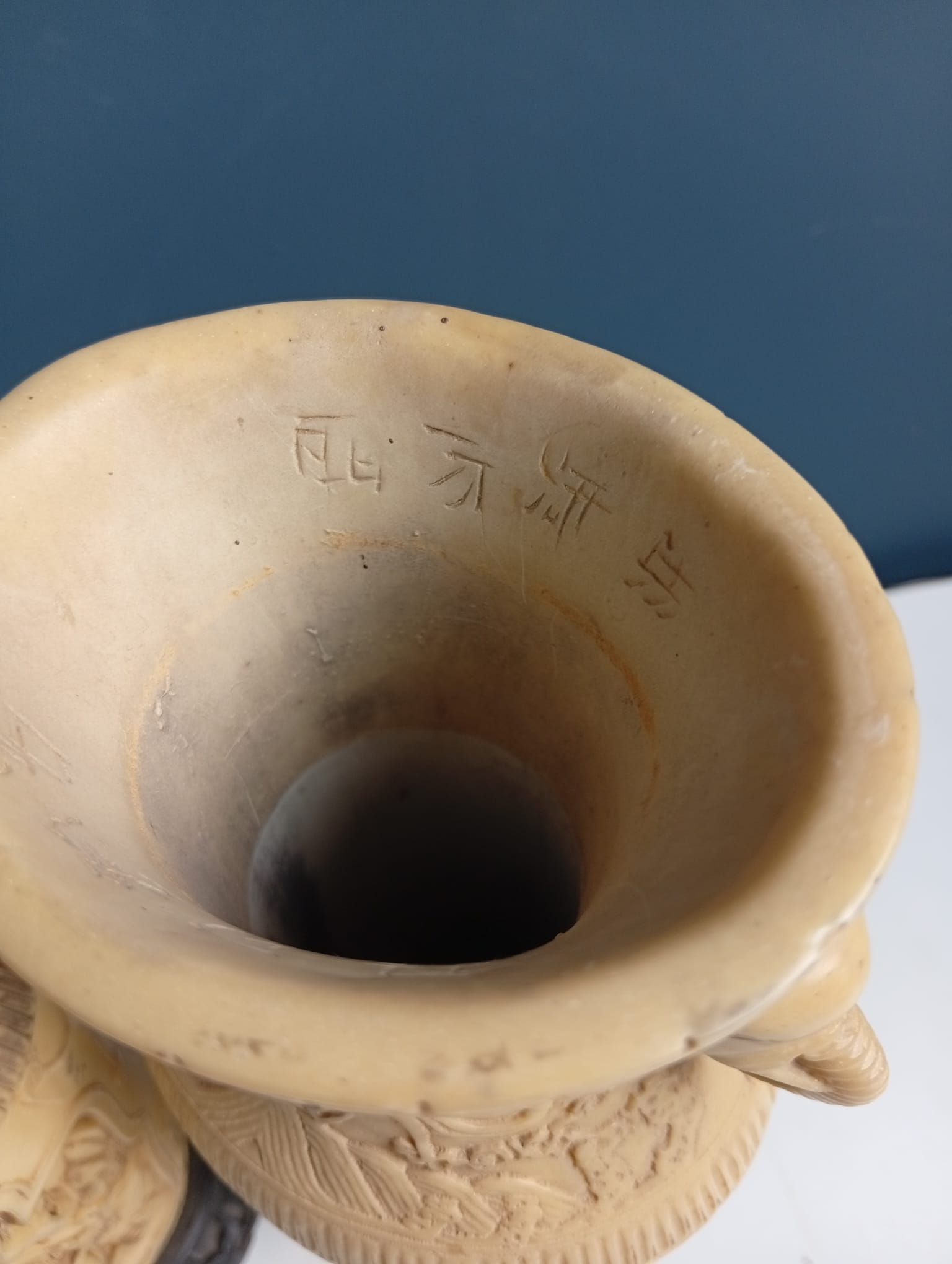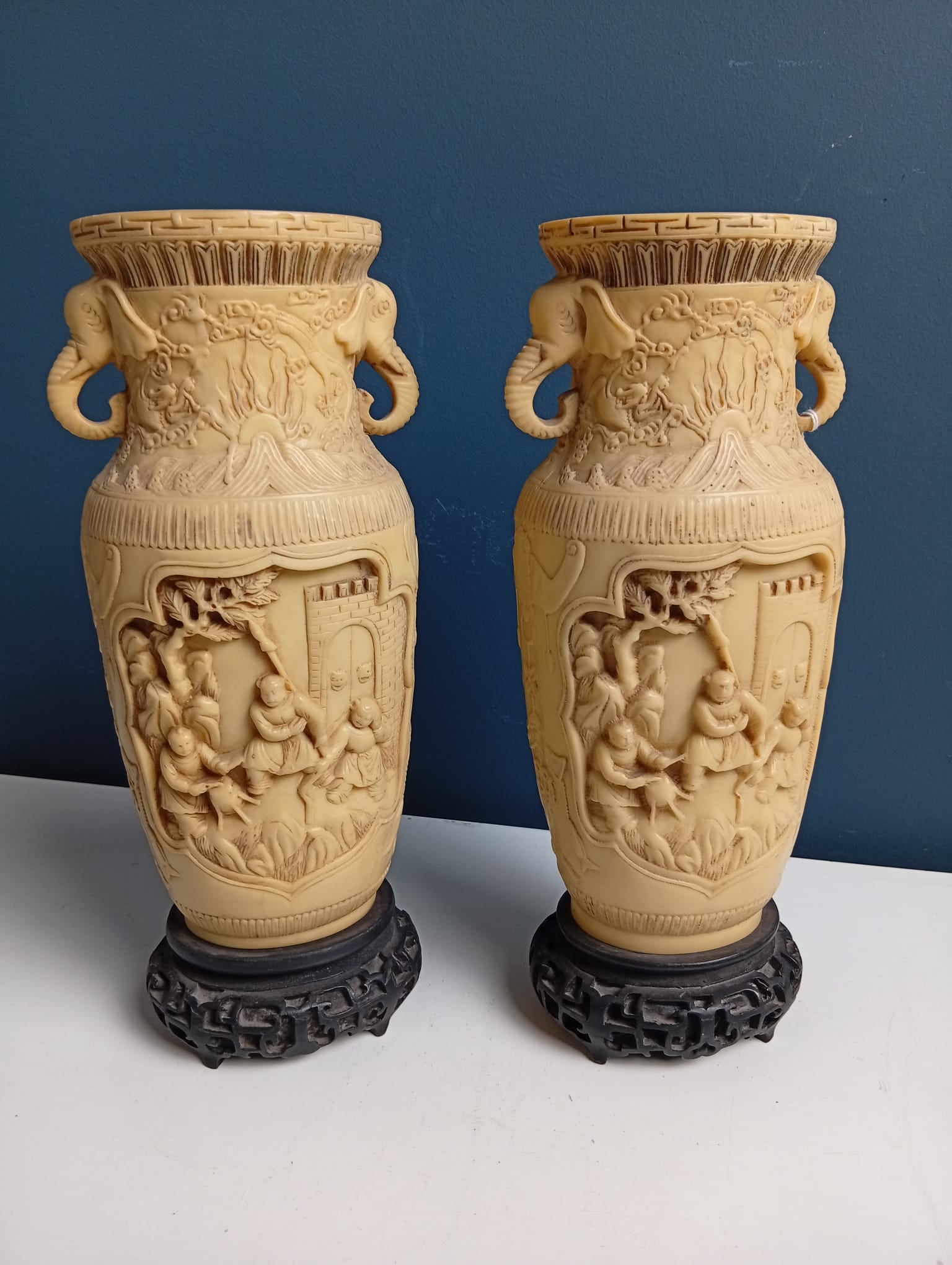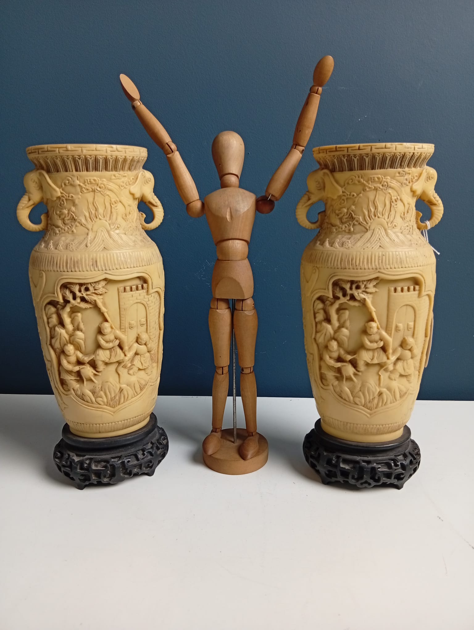 Coppia di Vasi in resina intagliata motivi cinesi
